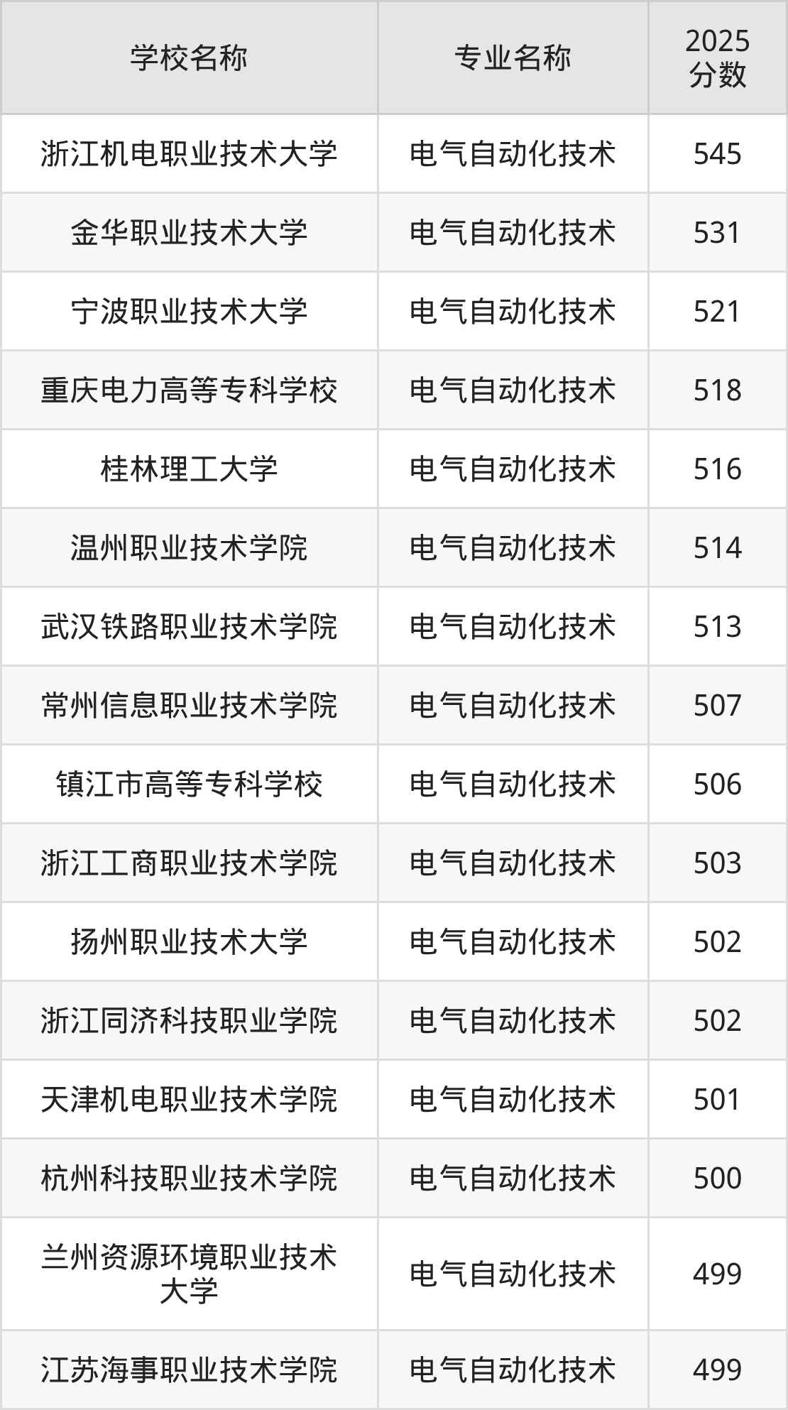 | 1 | 电气自动化技术 | 浙江机电职业技术大学 | 545 |