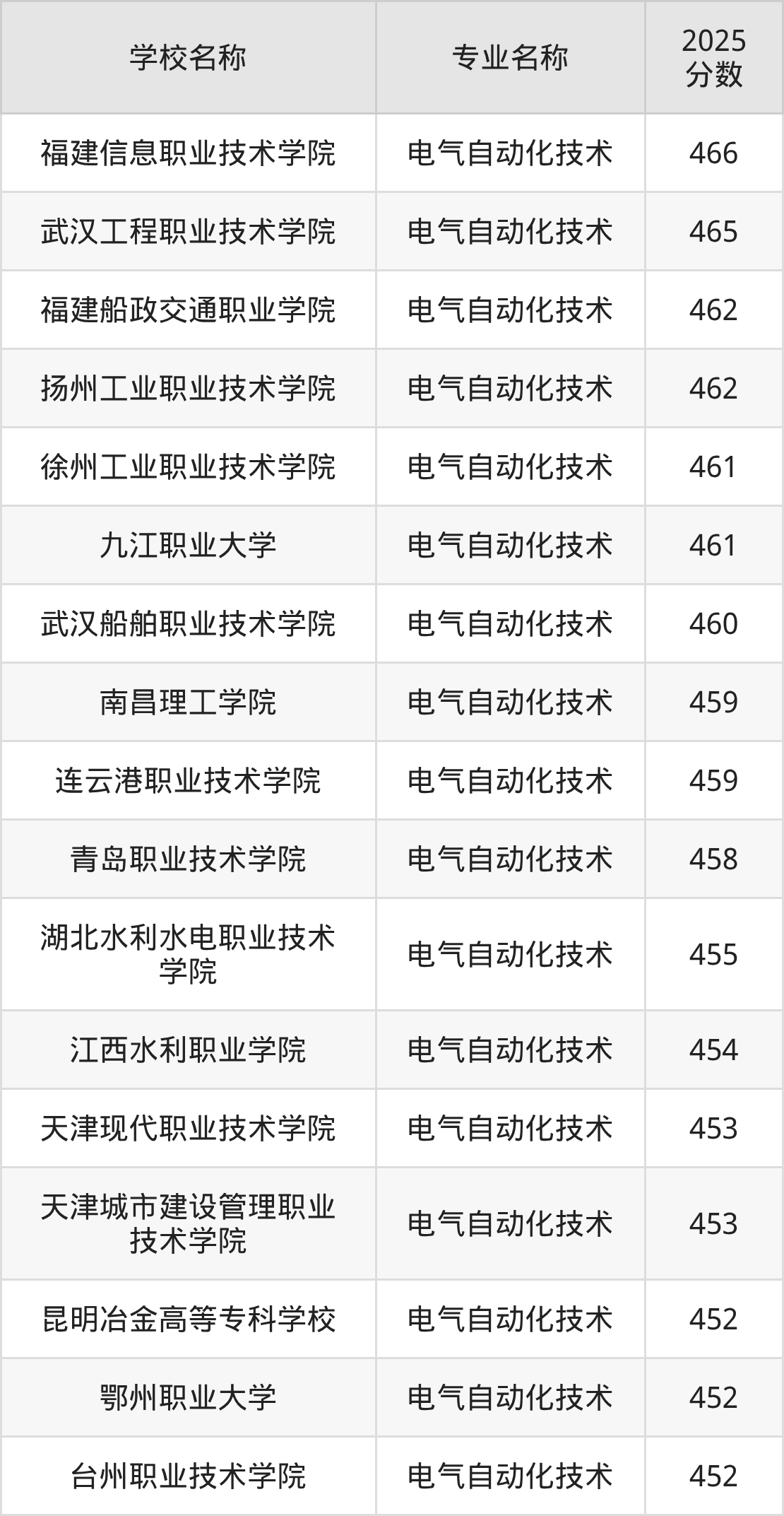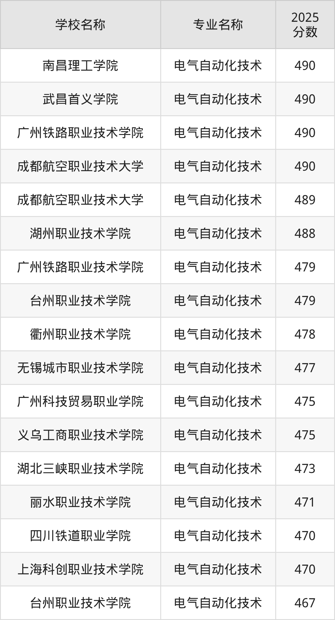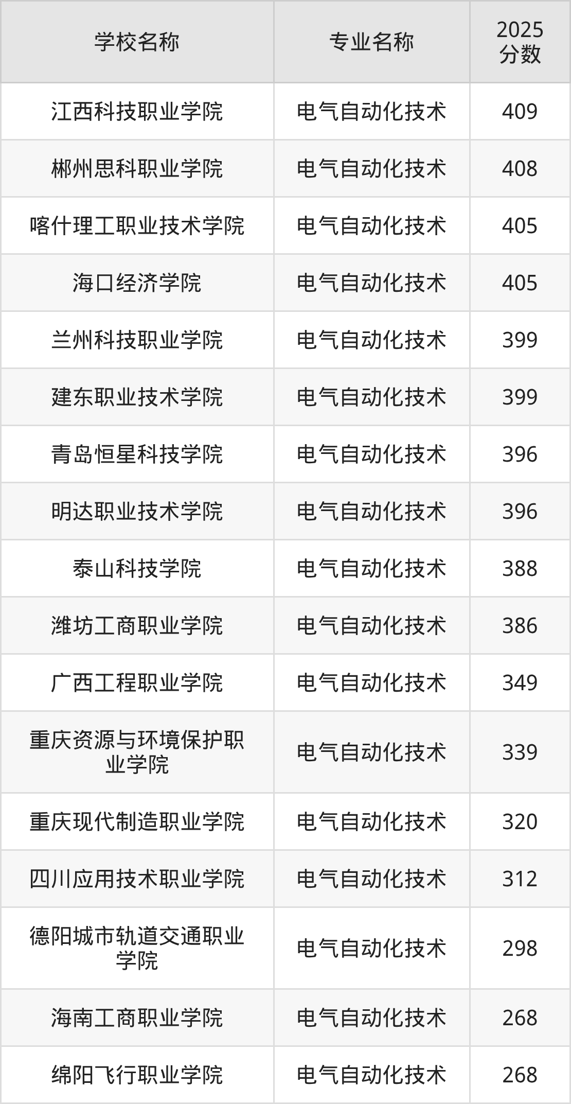 下面是2025年全国专科电气自动化技术专业大学录取分数线。