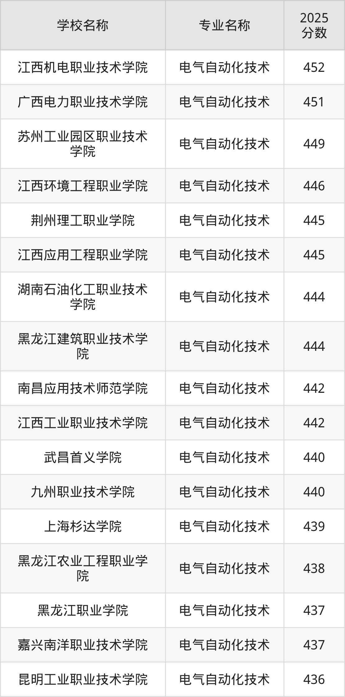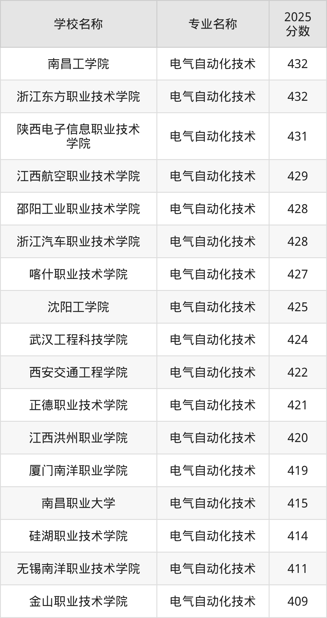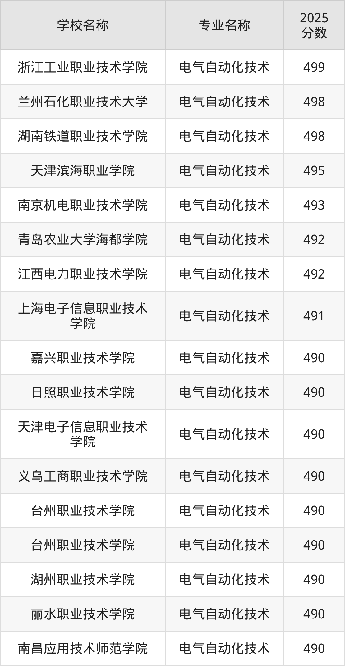 下面是2025年全国专科电气自动化技术专业大学录取分数线。