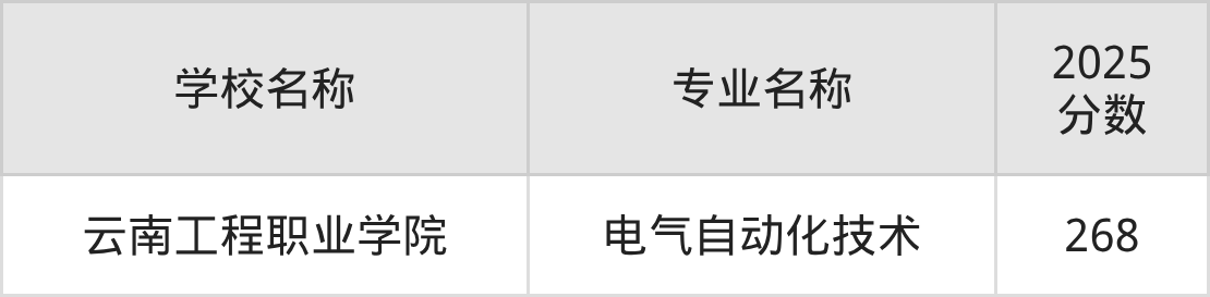 电气自动化技术专业专科最低录取分数线:268分,对应学校是云南工程职业学院。