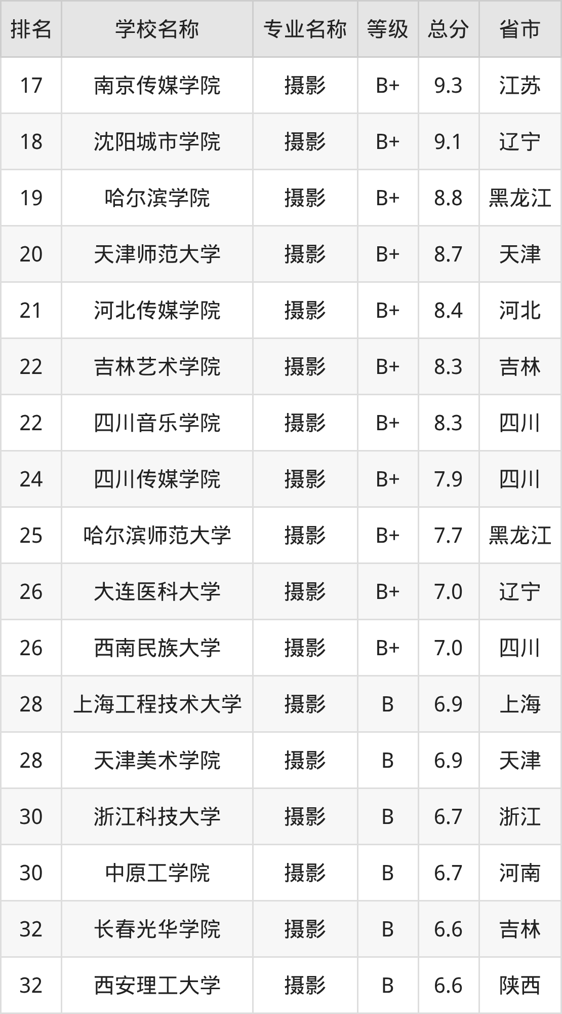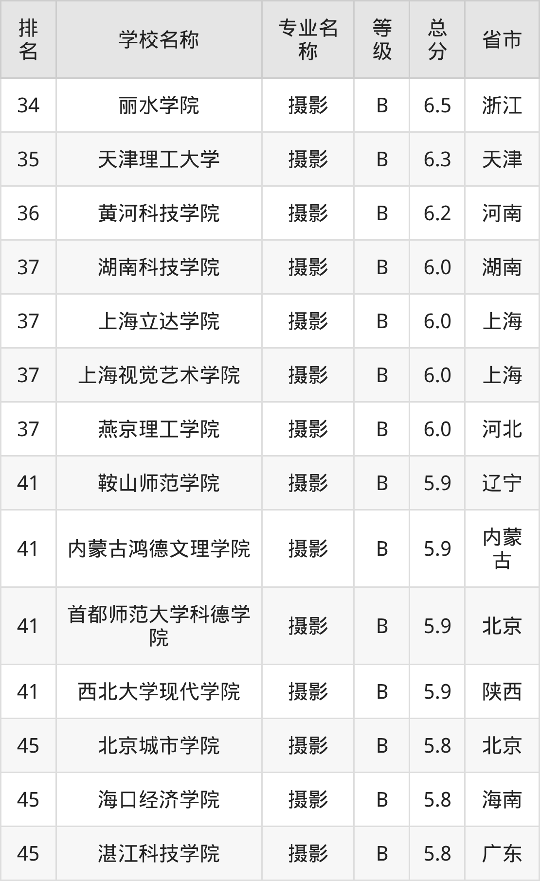 根据软科榜单可知,摄影专业全国排名前十的大学分别是: