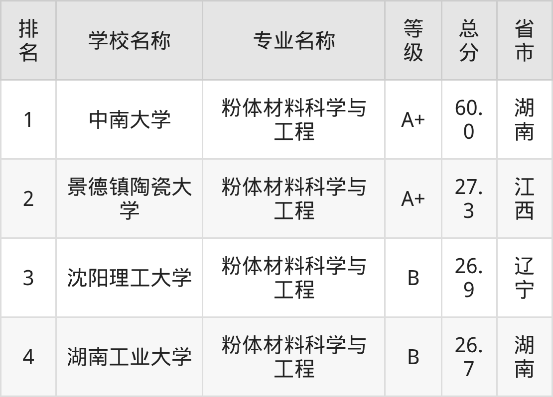 根据软科榜单可知,粉体材料科学与工程专业全国排名前四的大学分别是: