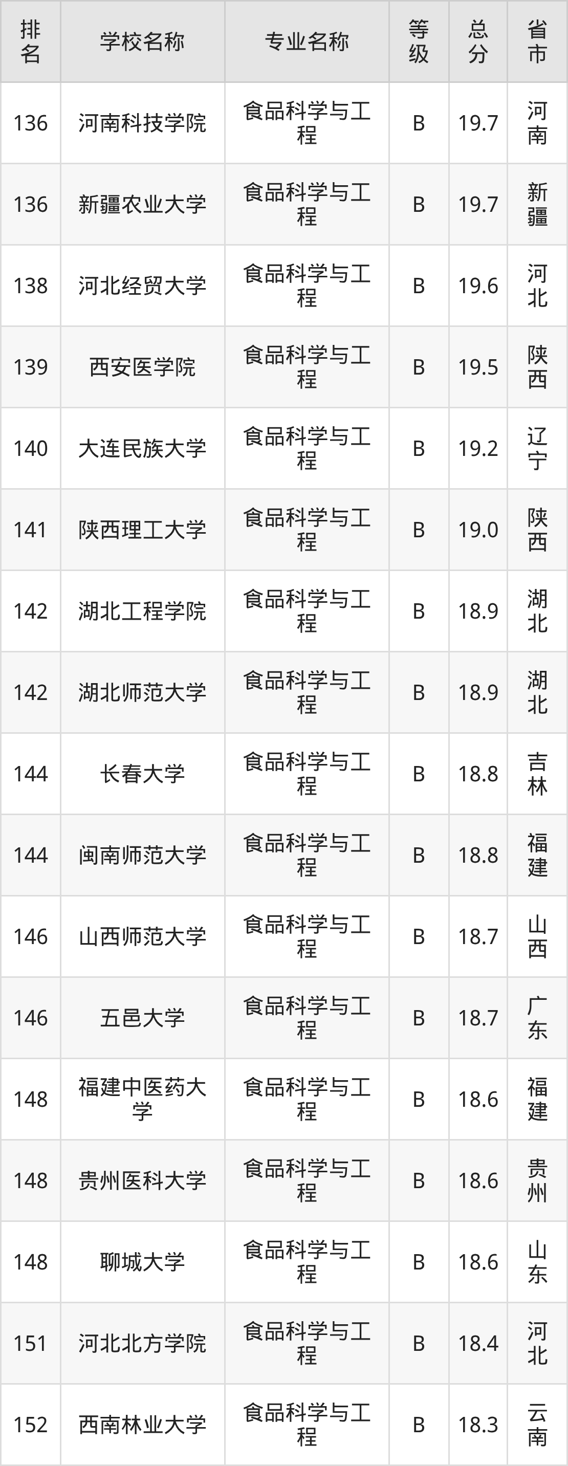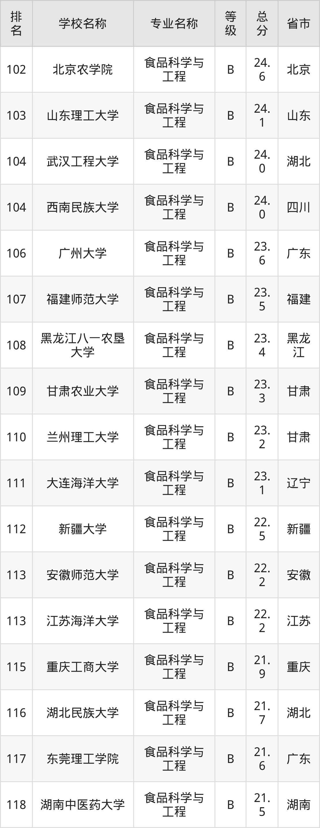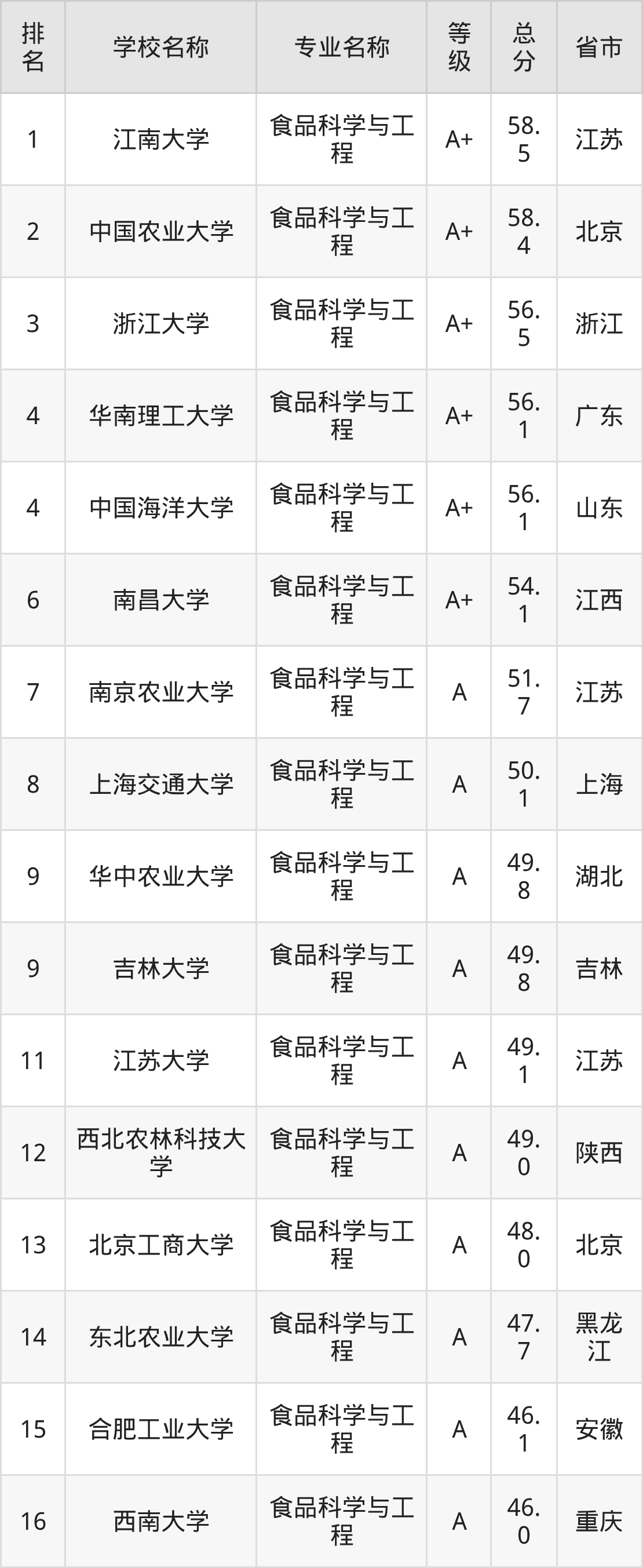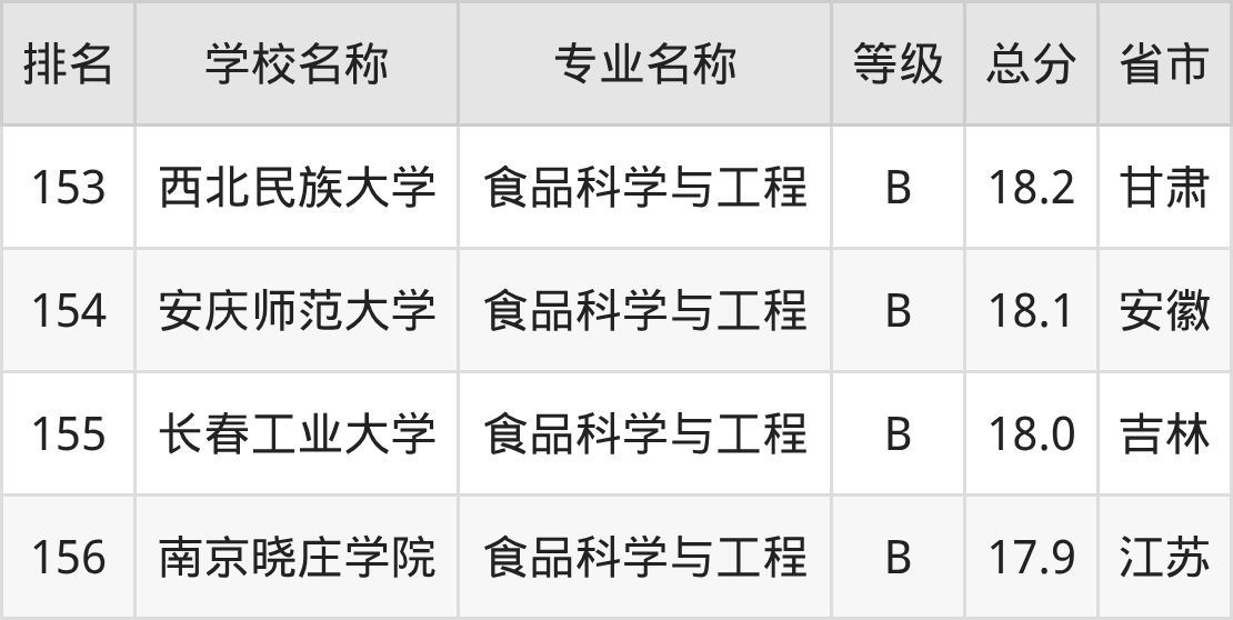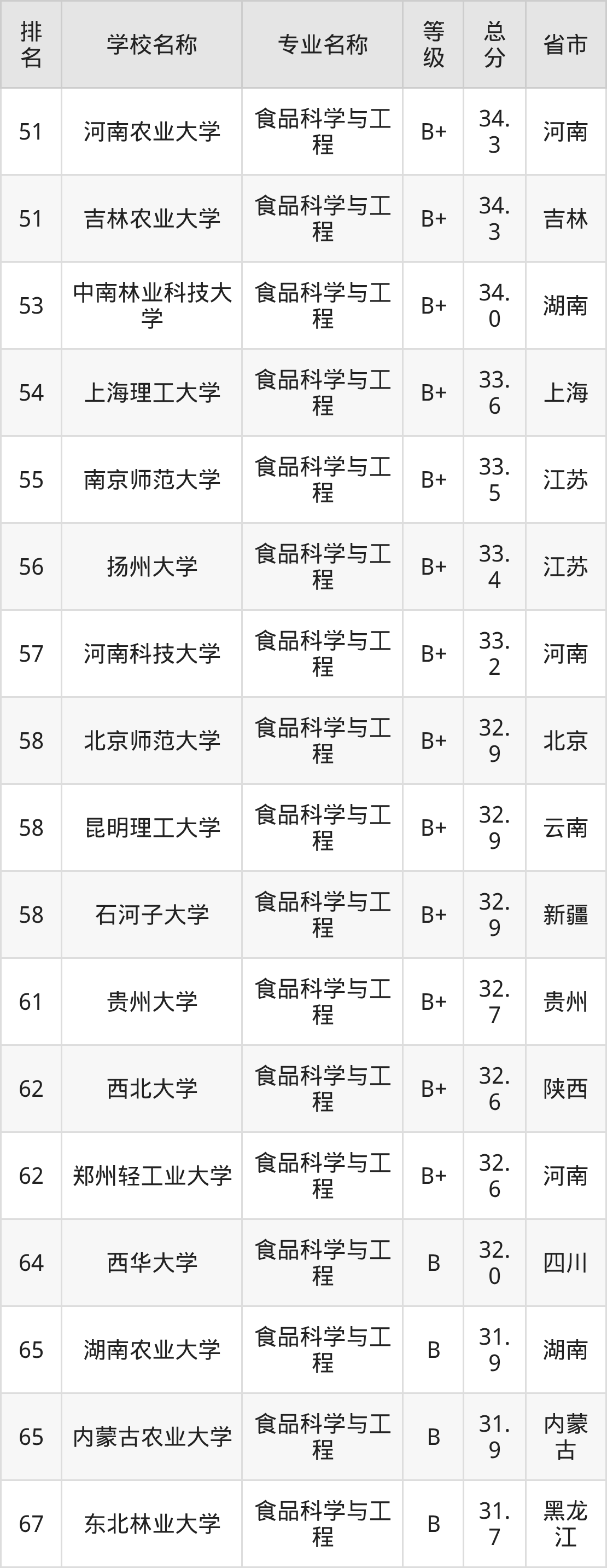 附食品科学与工程专业全国156所院校排名榜单一览表!