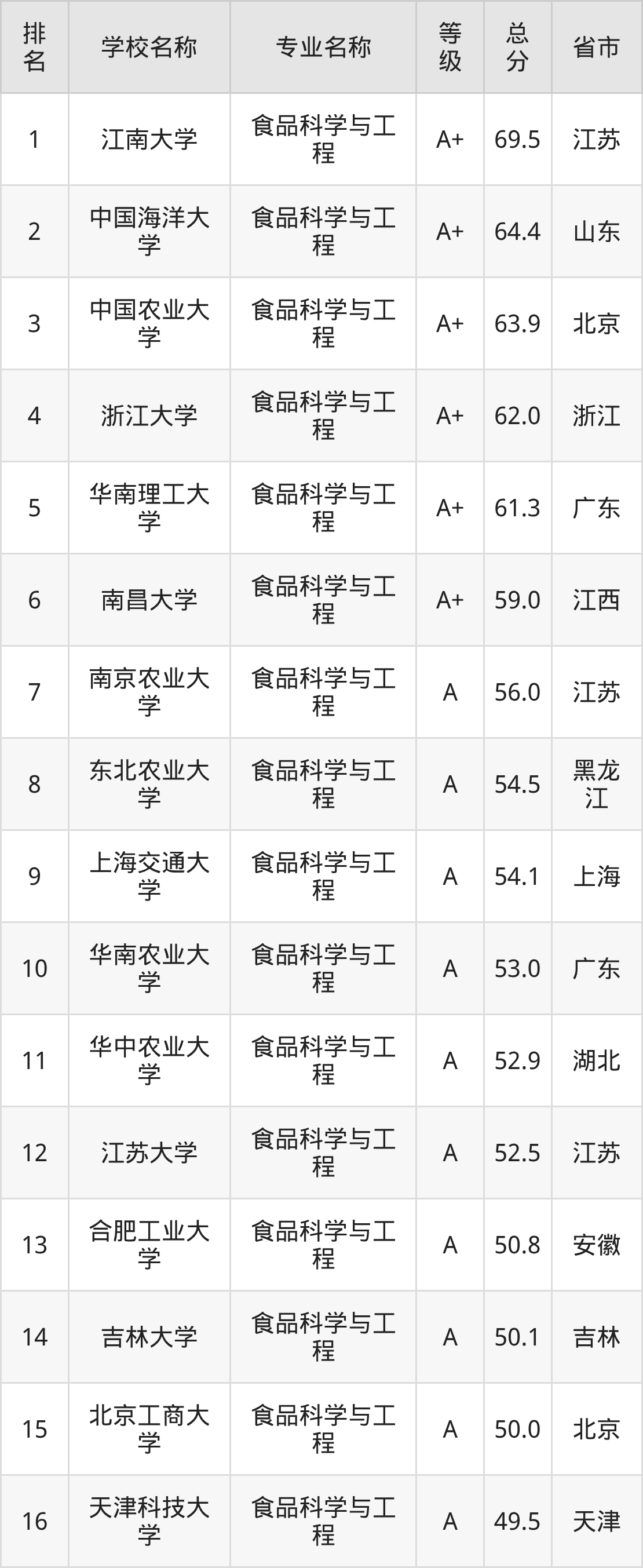根据软科榜单可知,食品科学与工程专业全国排名前十的大学分别是:
