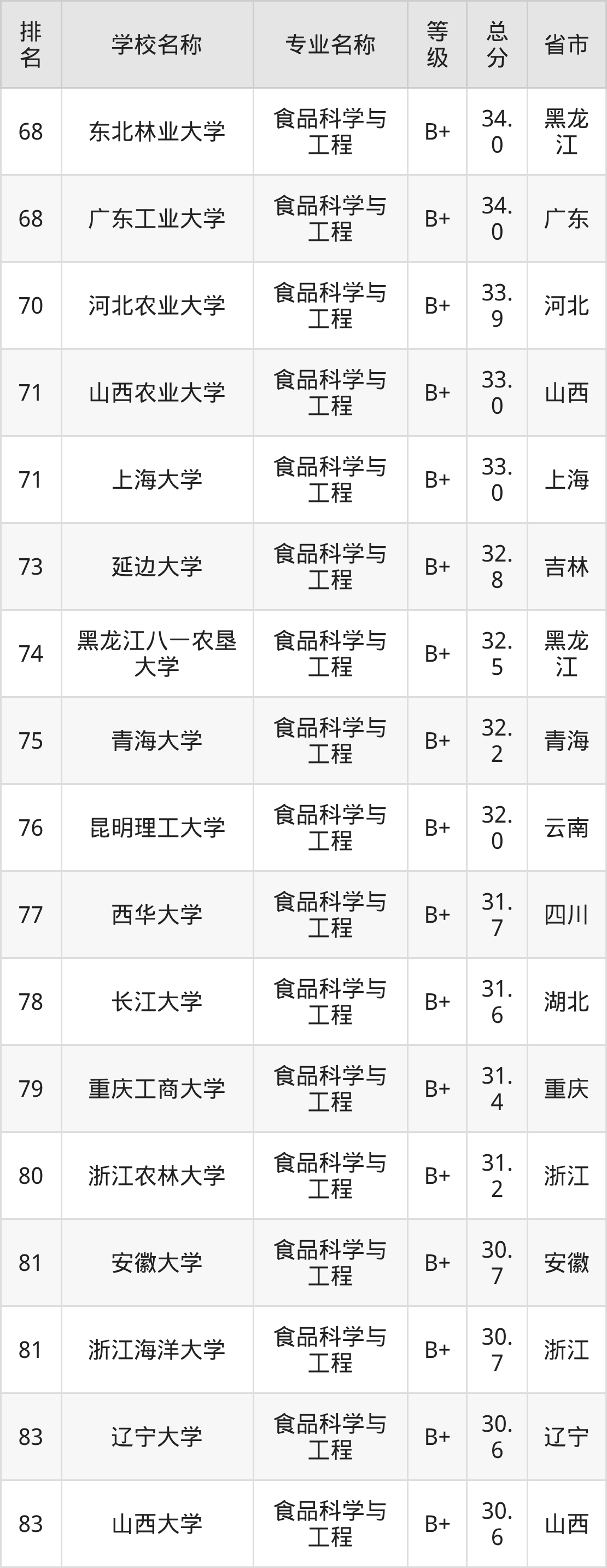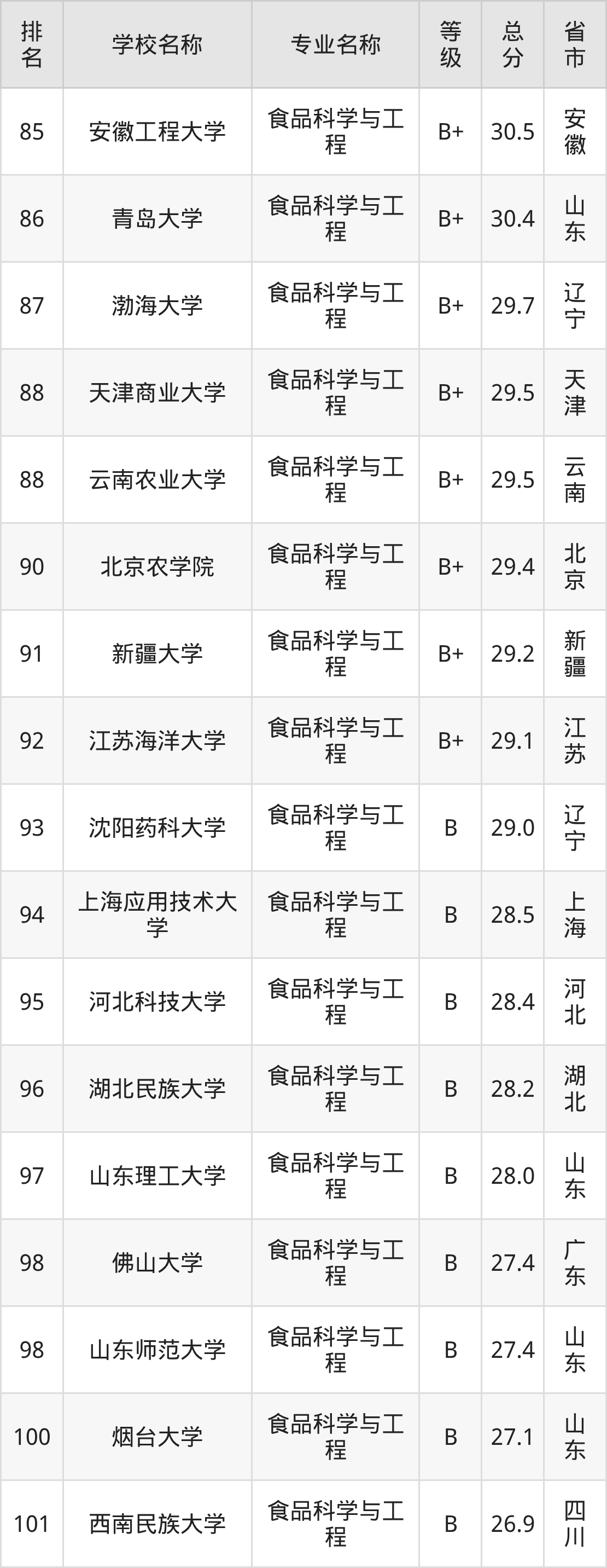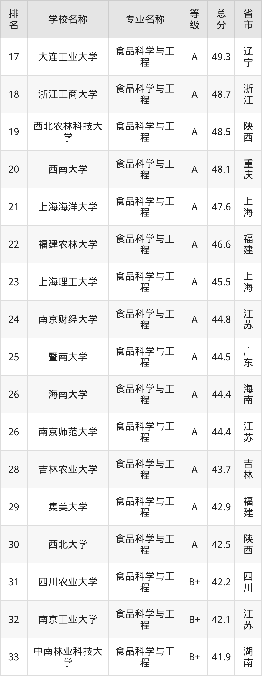 附食品科学与工程专业全国153所院校排名榜单一览表!