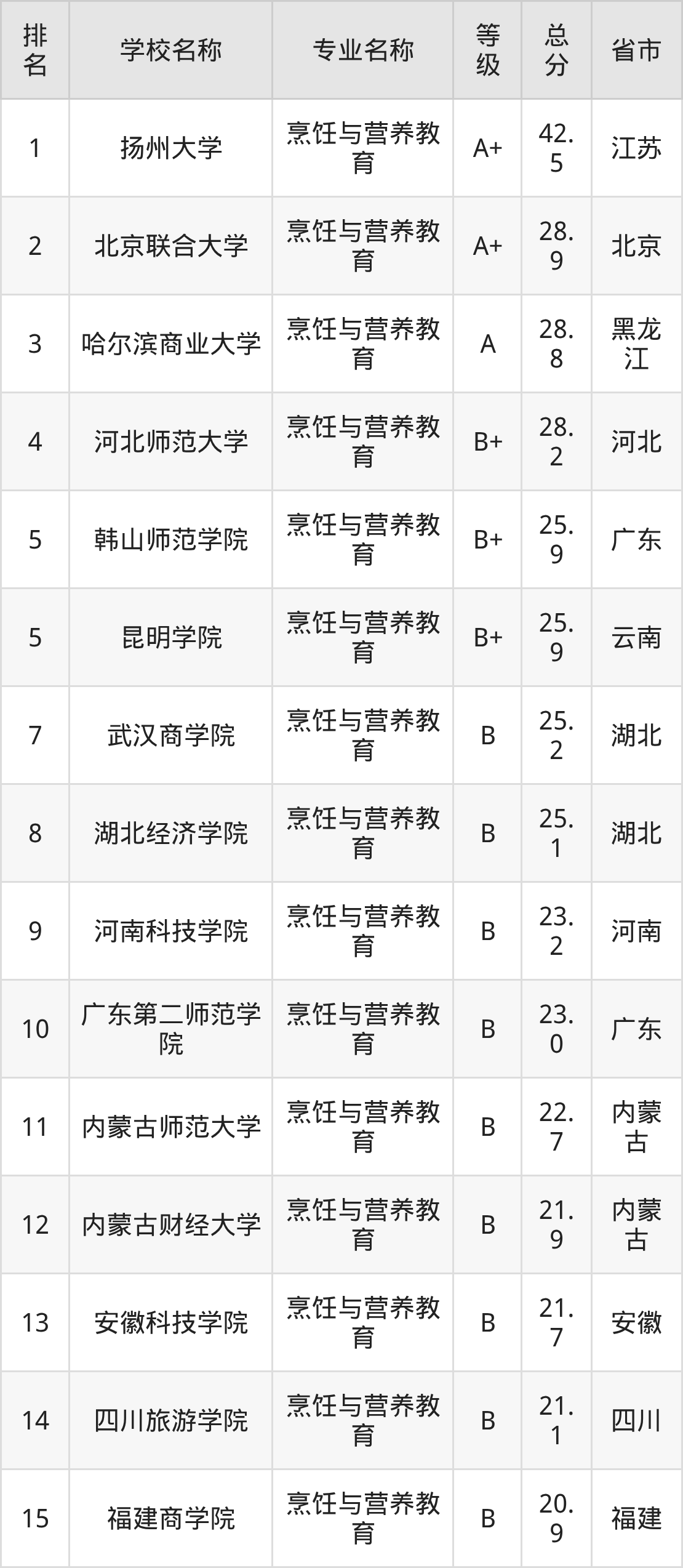 附烹饪与营养教育专业全国15所院校排名榜单一览表!