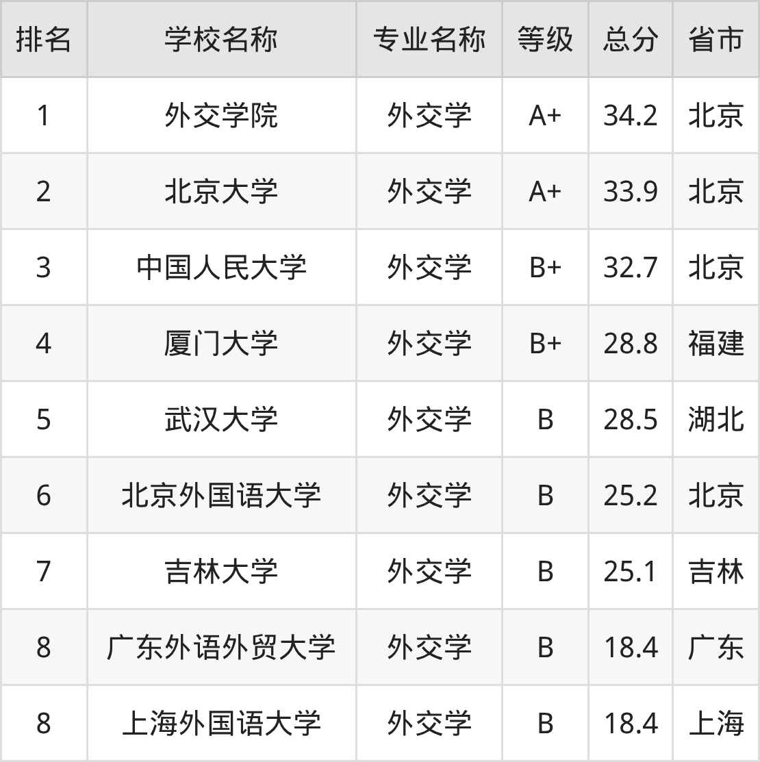 根据软科榜单可知,外交学专业全国排名前九的大学分别是: