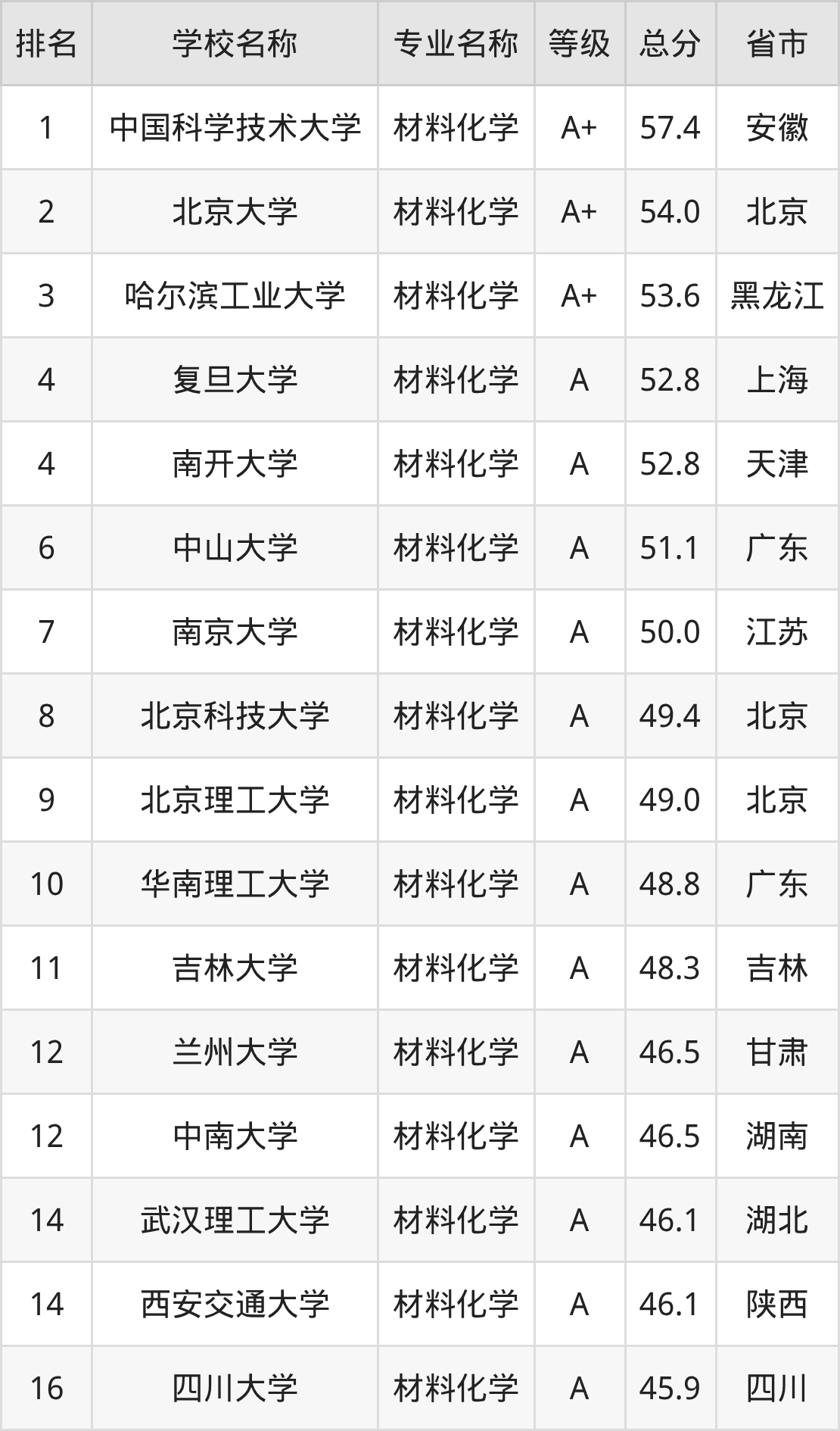 一、2025年材料化学专业全国大学排名