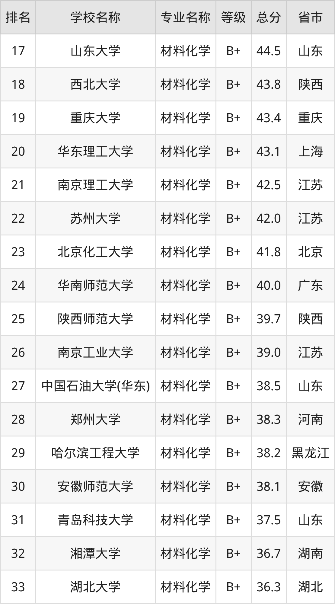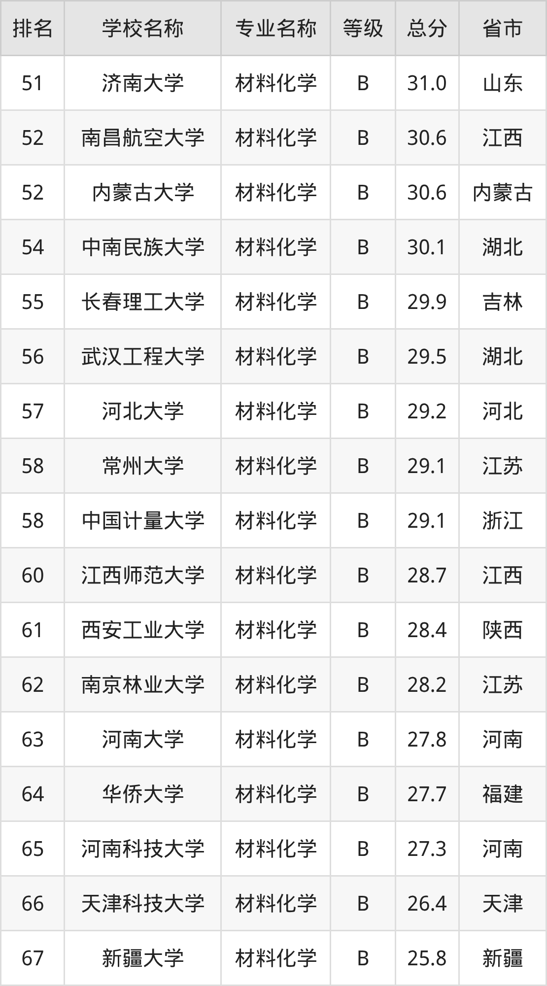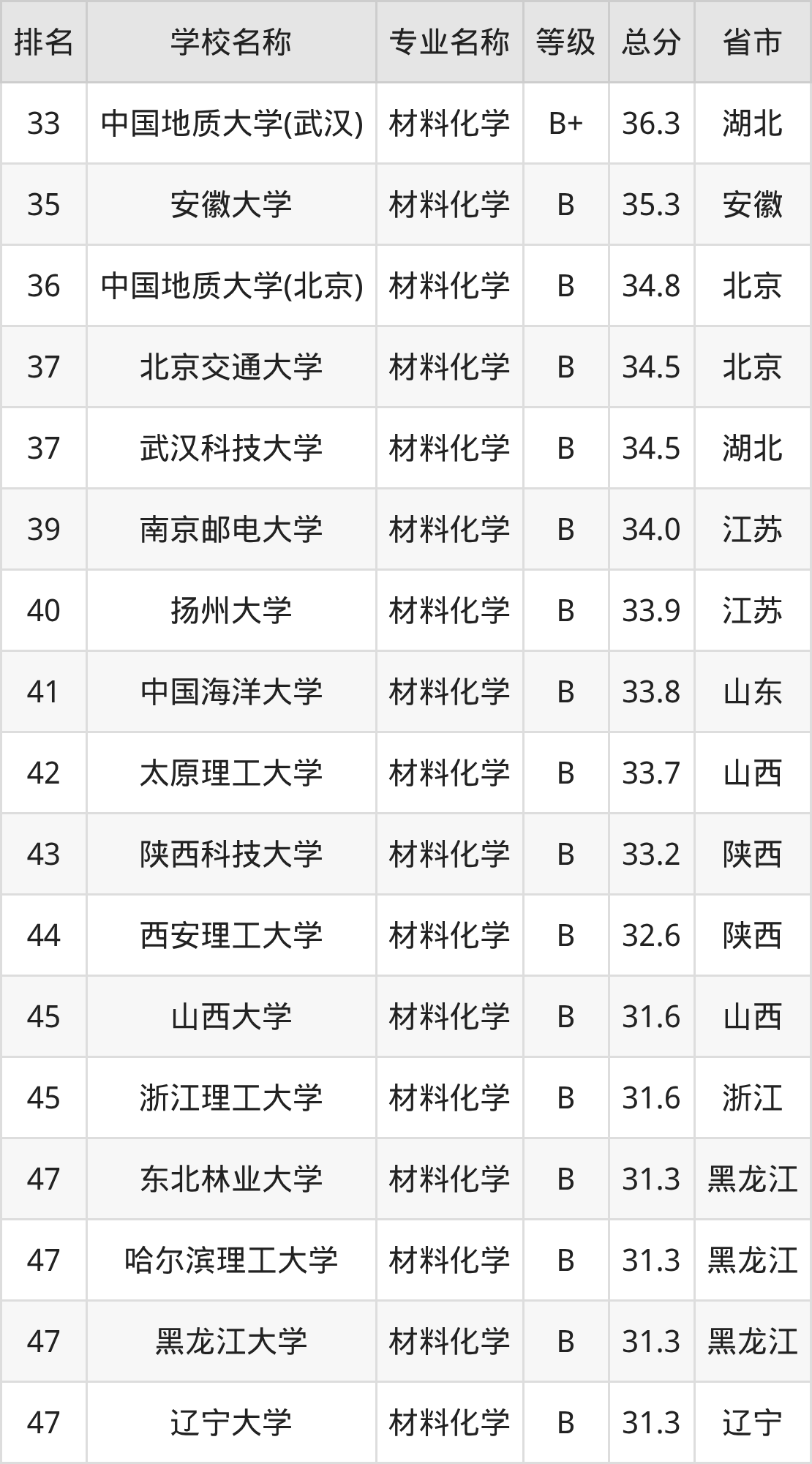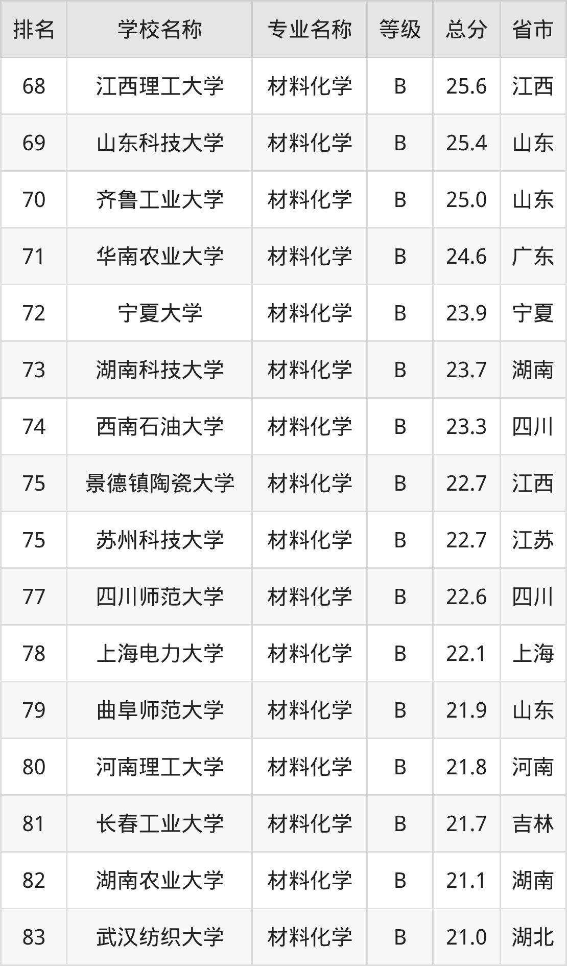 附材料化学专业全国83所院校排名榜单一览表!