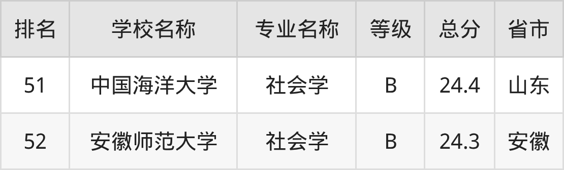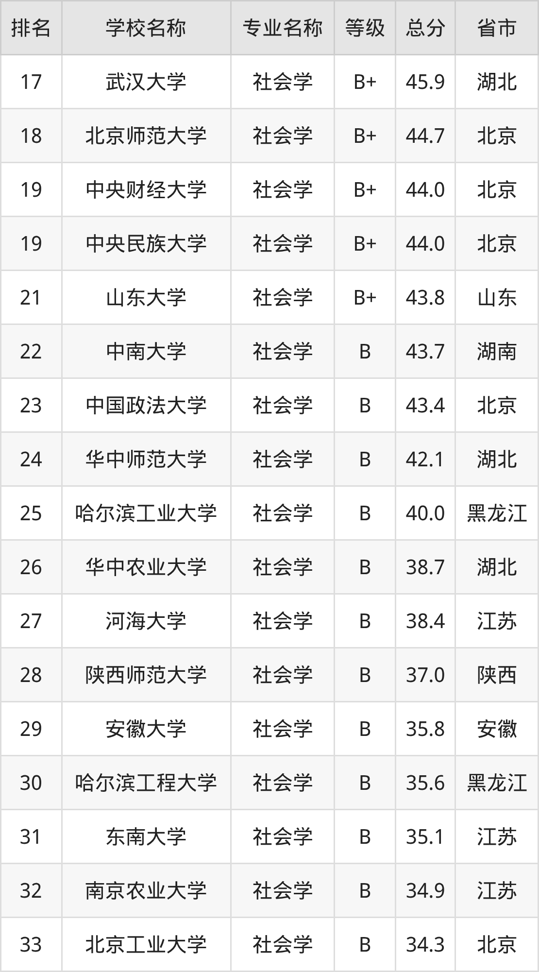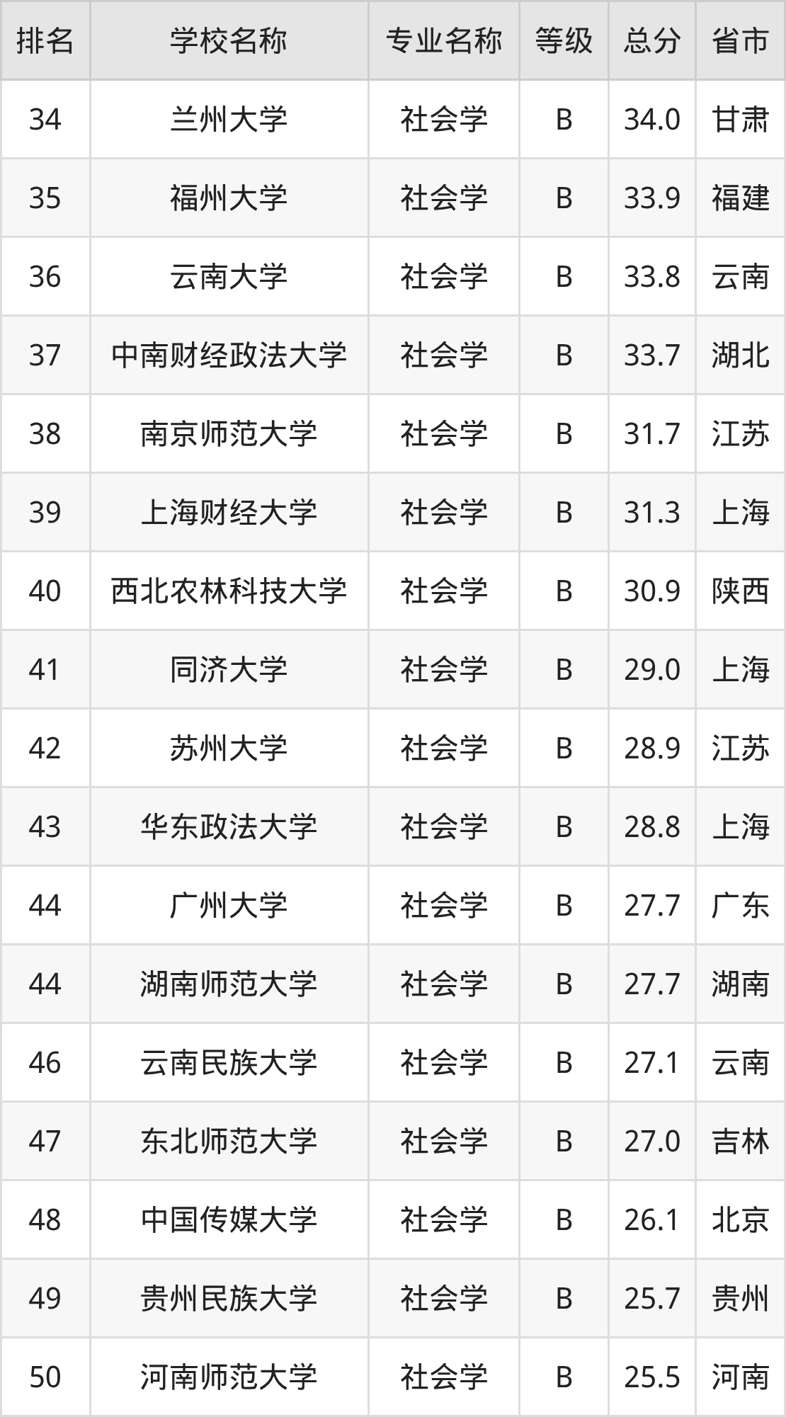 根据软科榜单可知,社会学专业全国排名前十的大学分别是: