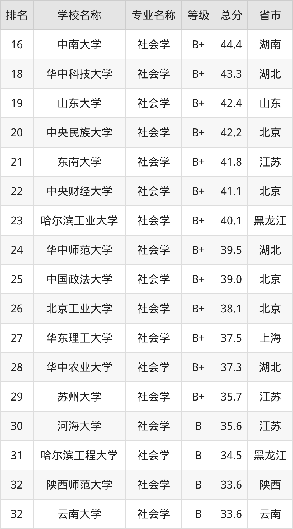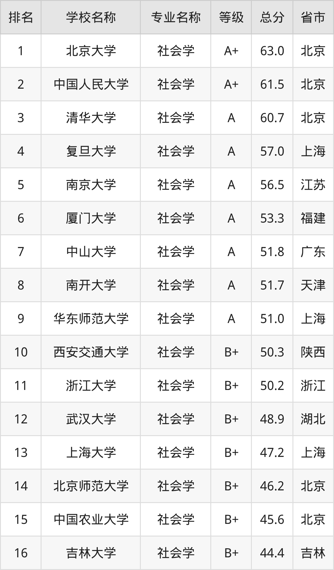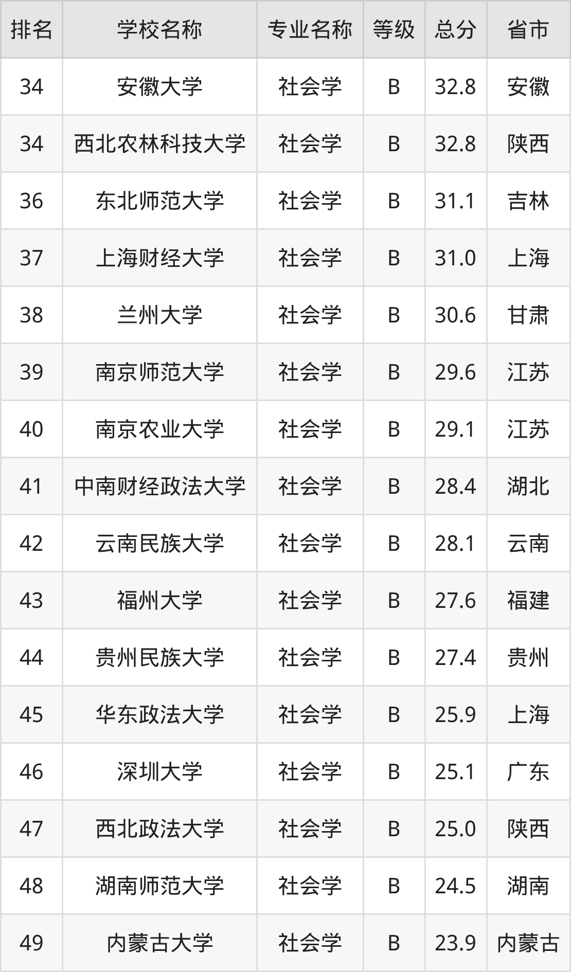 附社会学专业全国49所院校排名榜单一览表!