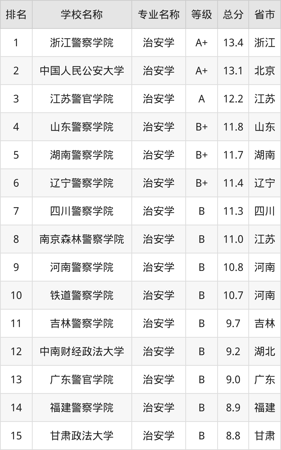 根据软科榜单可知,治安学专业全国排名前十的大学分别是: