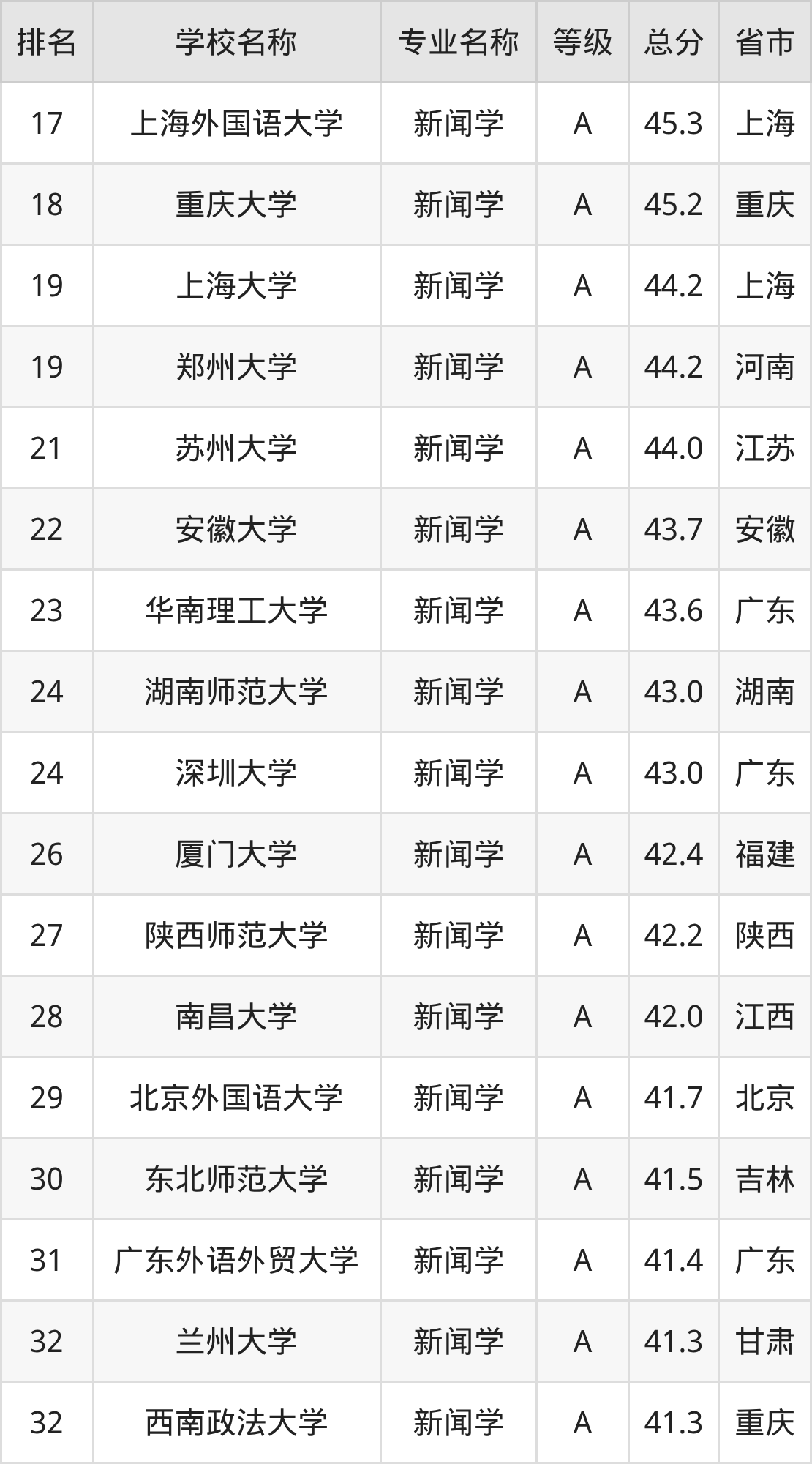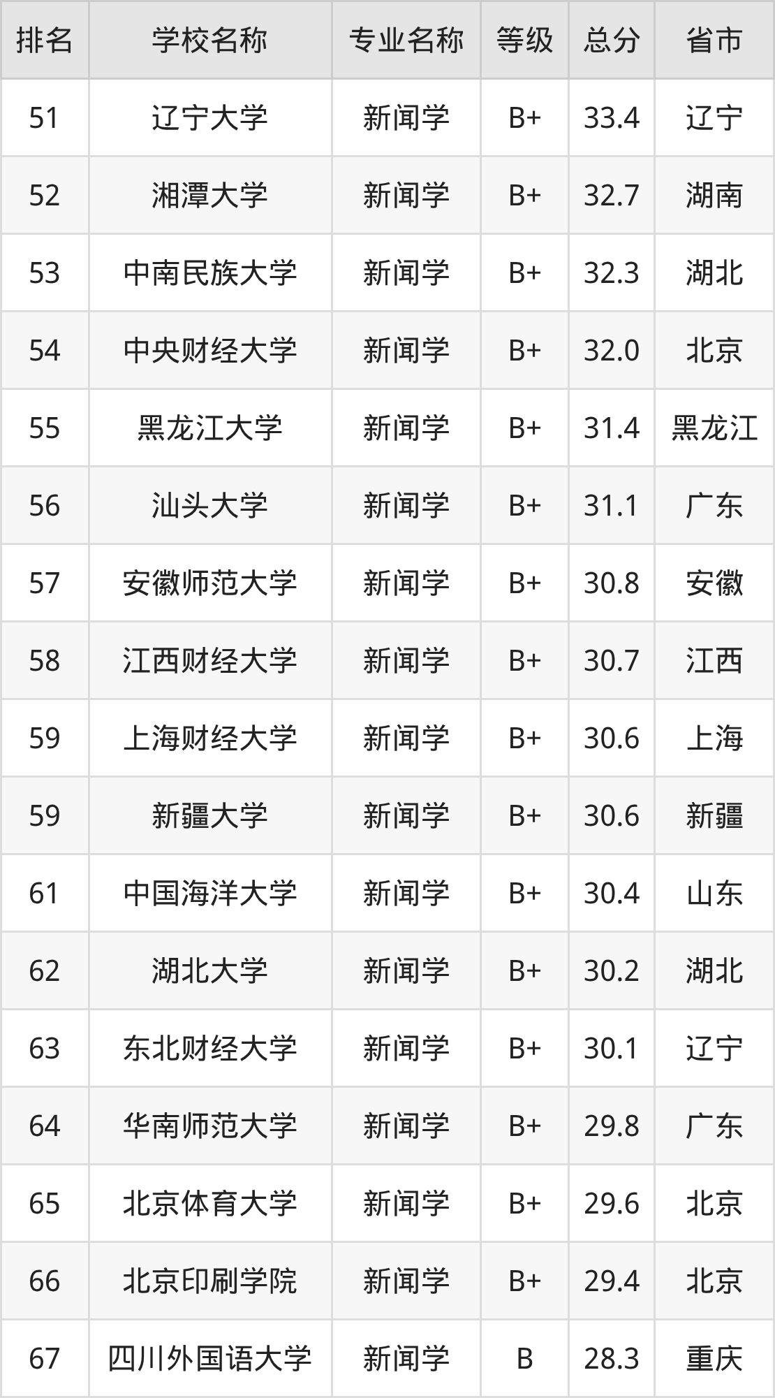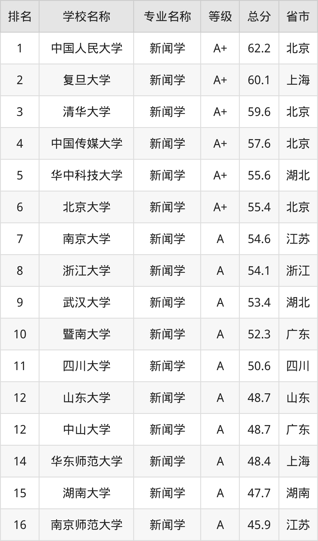 根据软科榜单可知,新闻学专业全国排名前十的大学分别是: