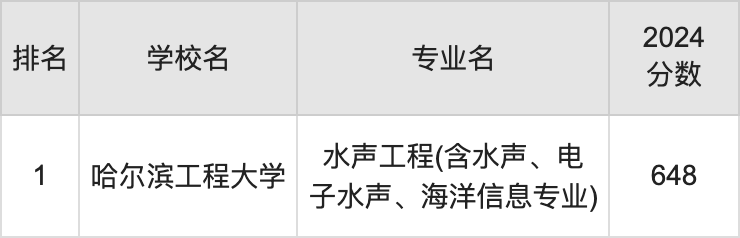 水声工程专业排名前1的大学中,收分较低的有哈尔滨工程大学(648分)。