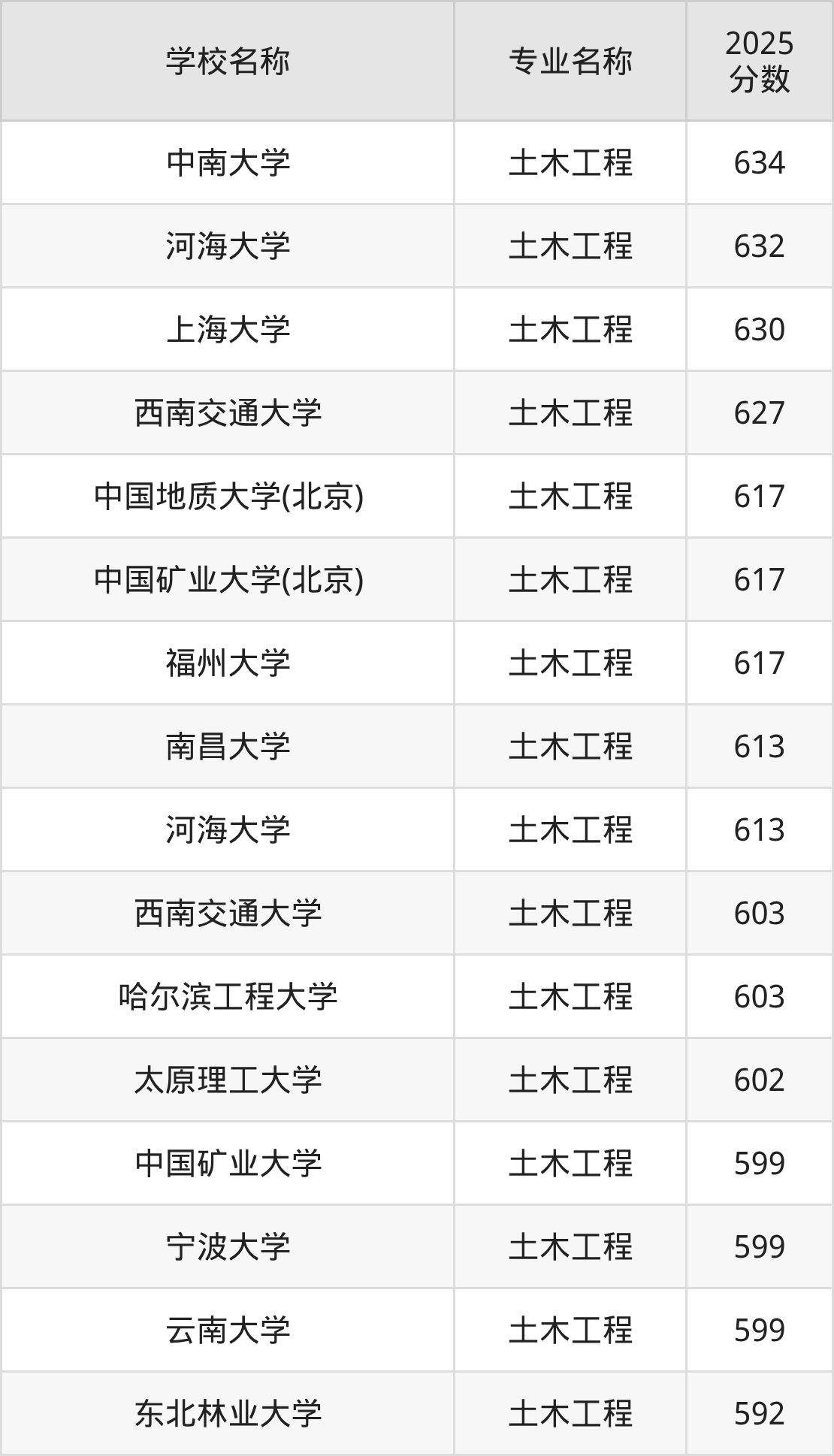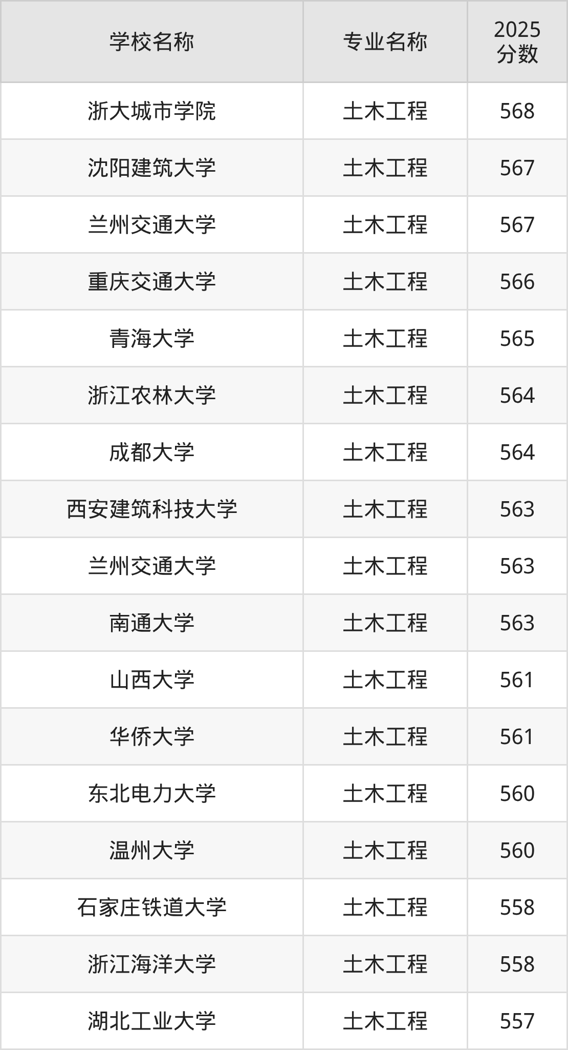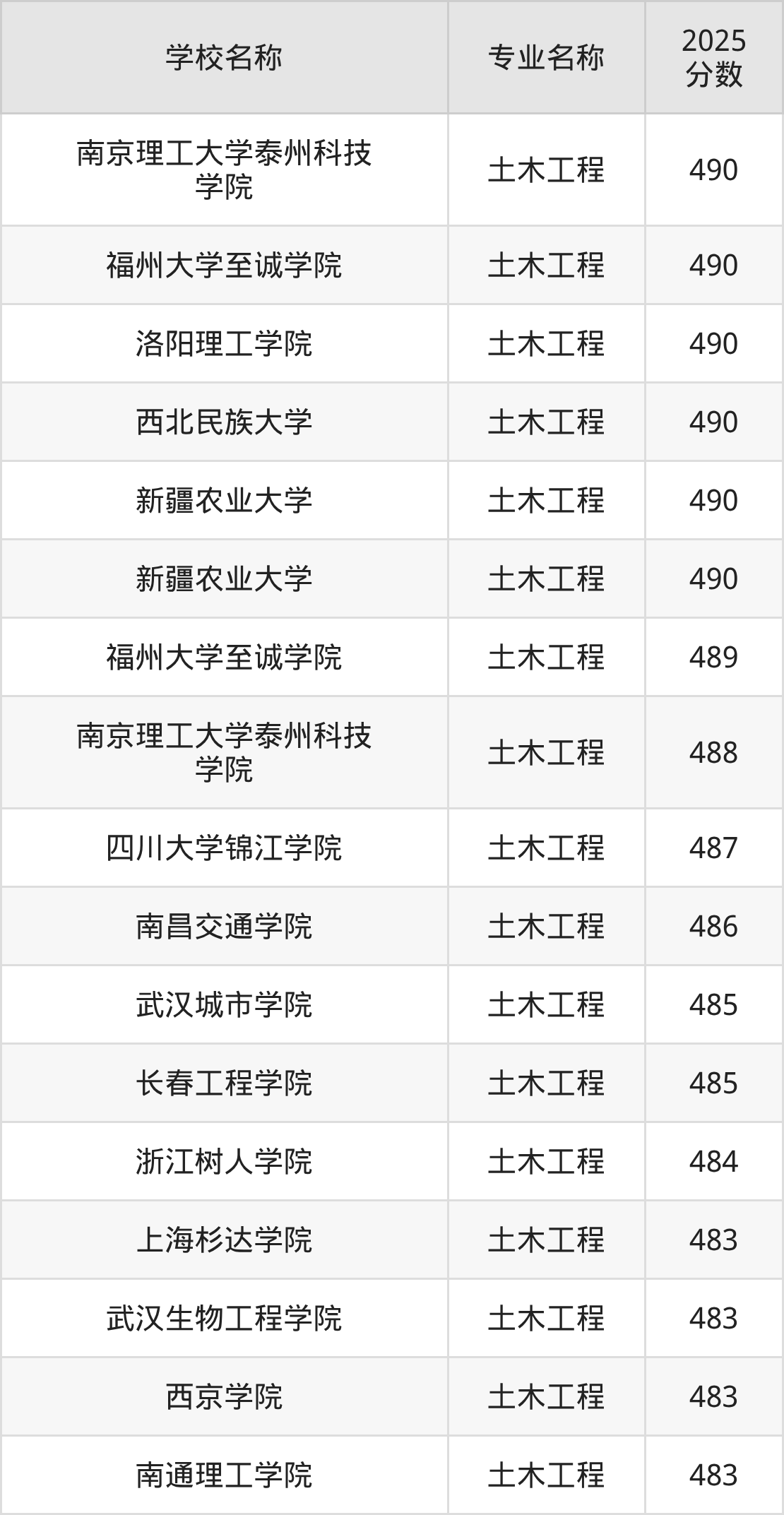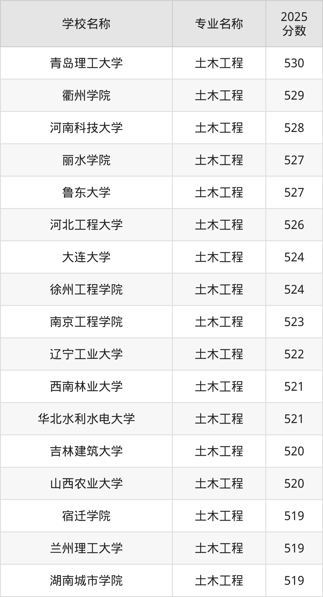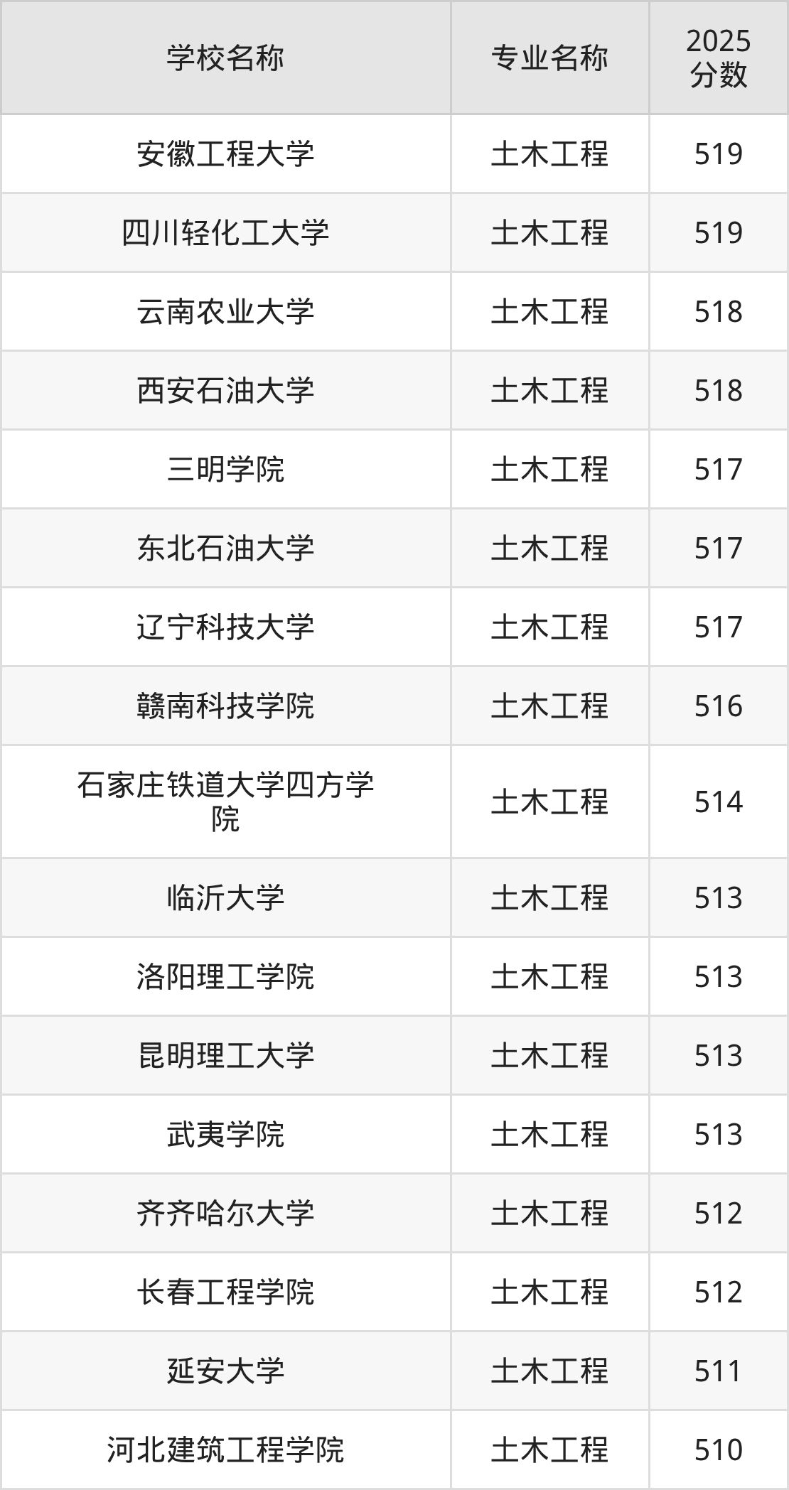下面是2025年全国本科土木工程专业大学录取分数线。