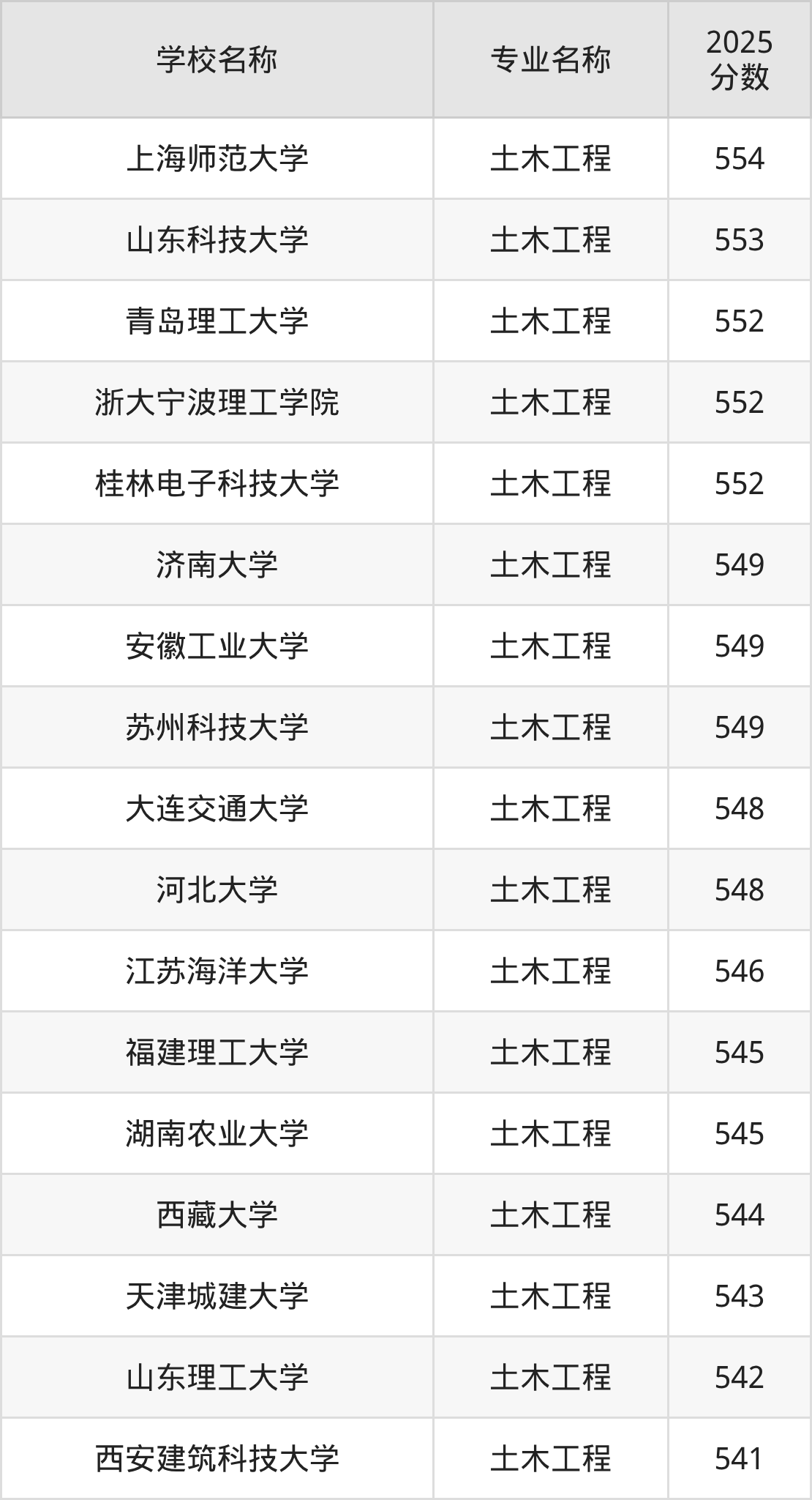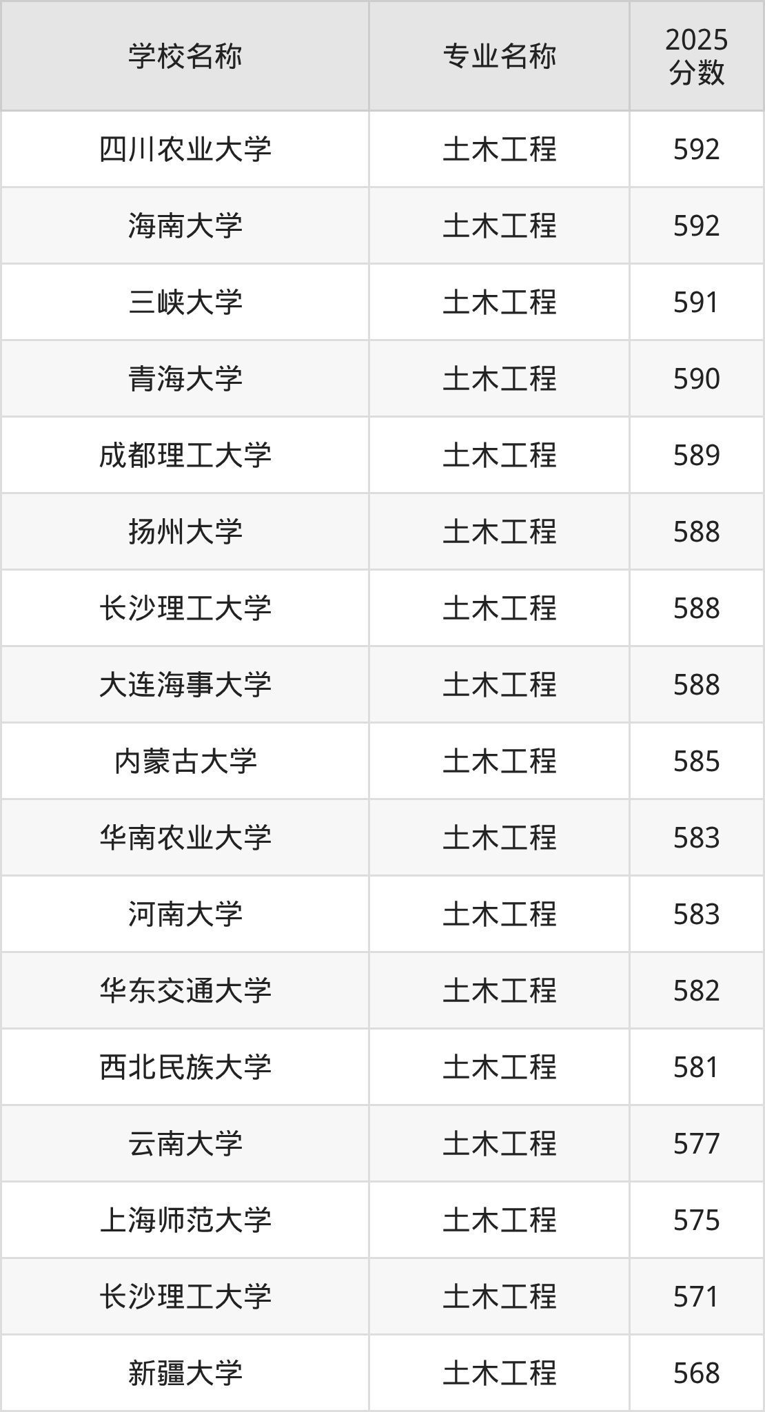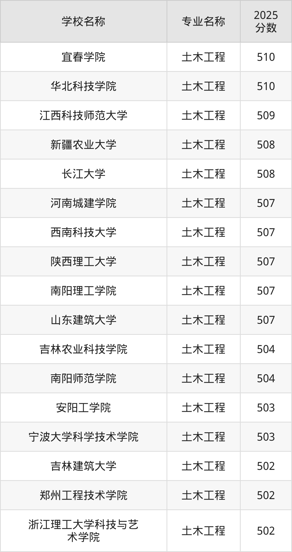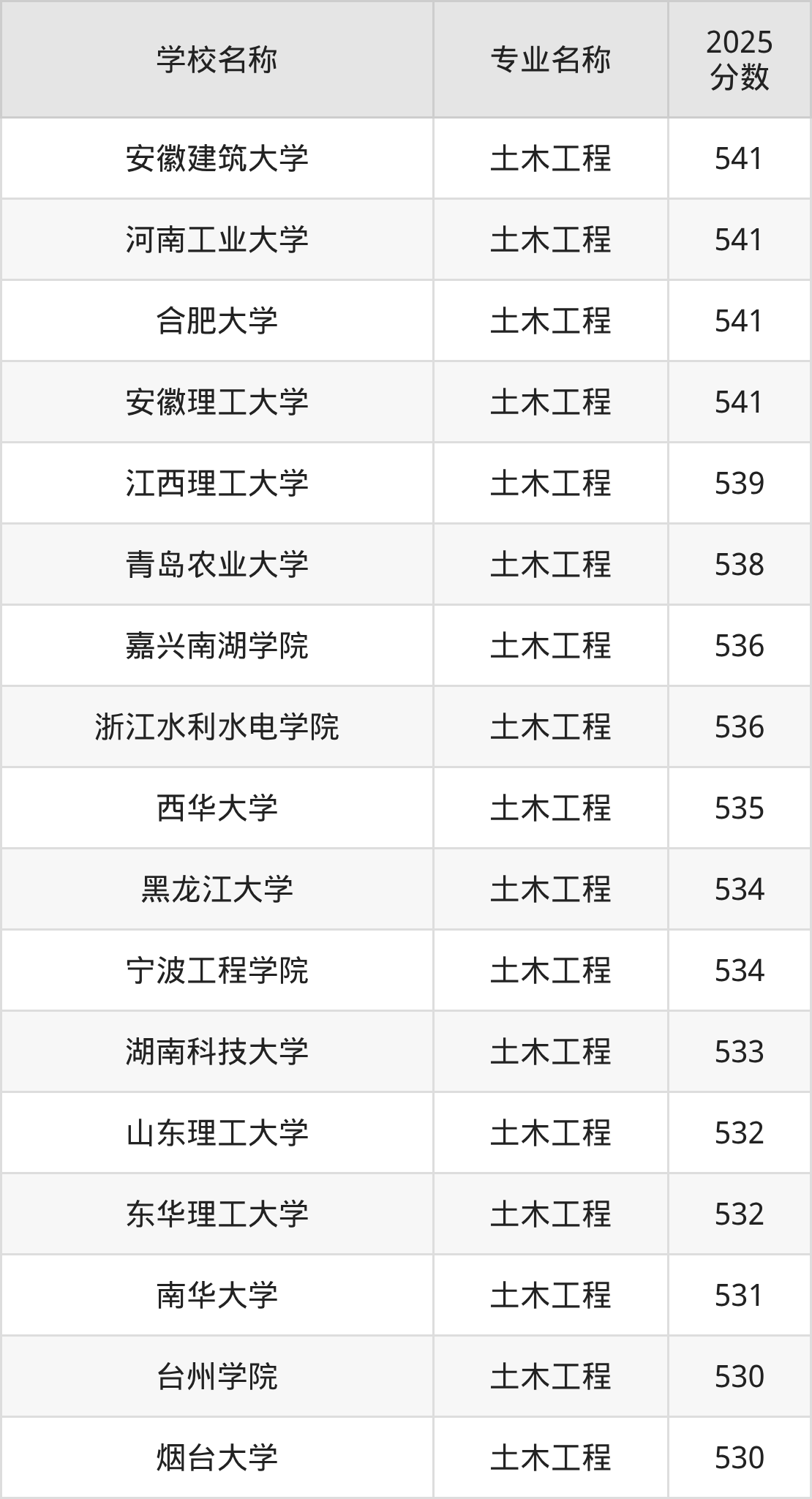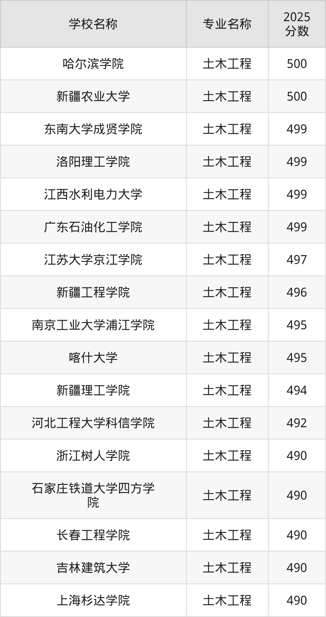 下面是2025年全国本科土木工程专业大学录取分数线。
