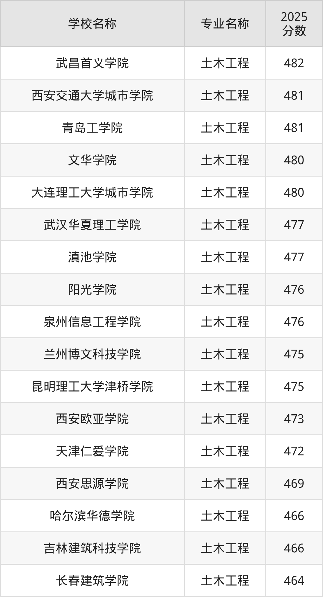 土木工程专业最低464分能上本科大学,对应长春建筑学院。本期老师将为大家整理2025年全国本科大学土木工程专业录取分数线,2026届高考生可参考。