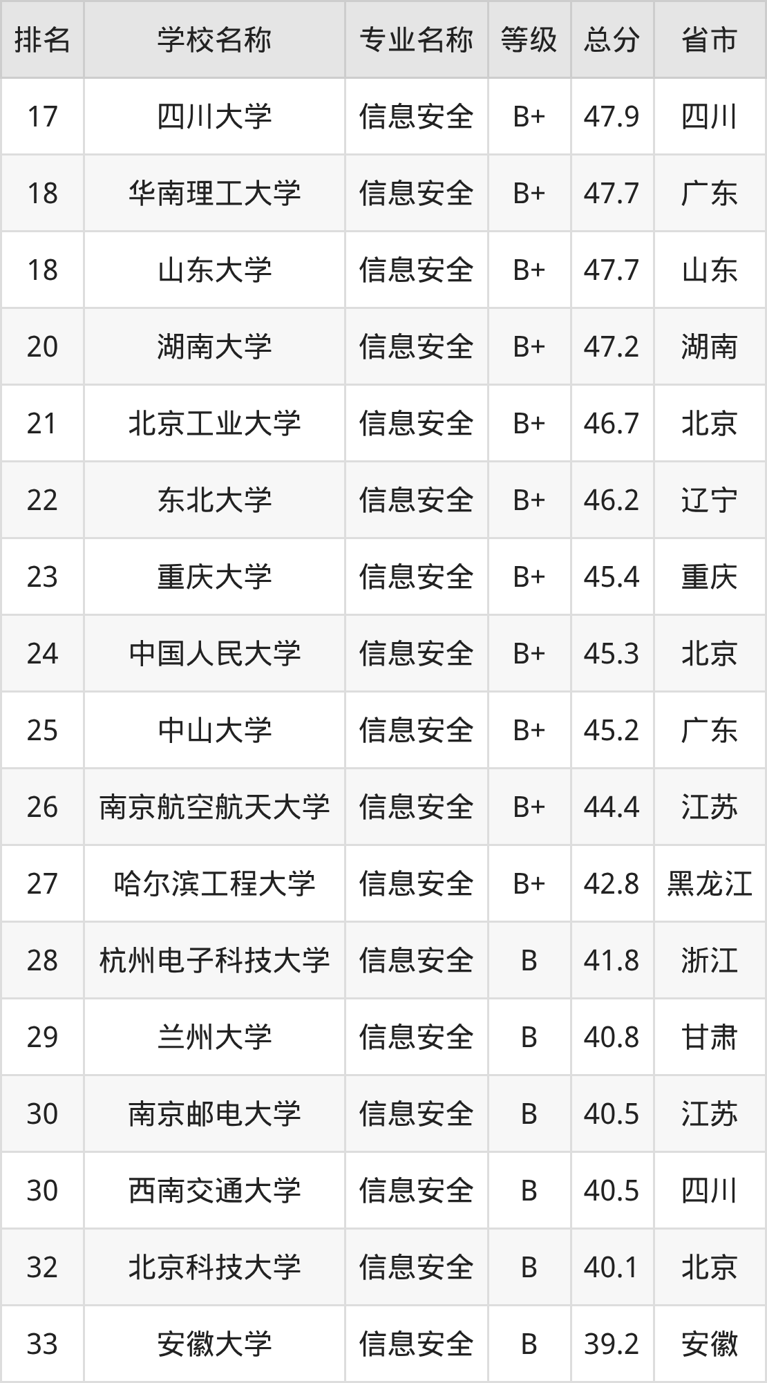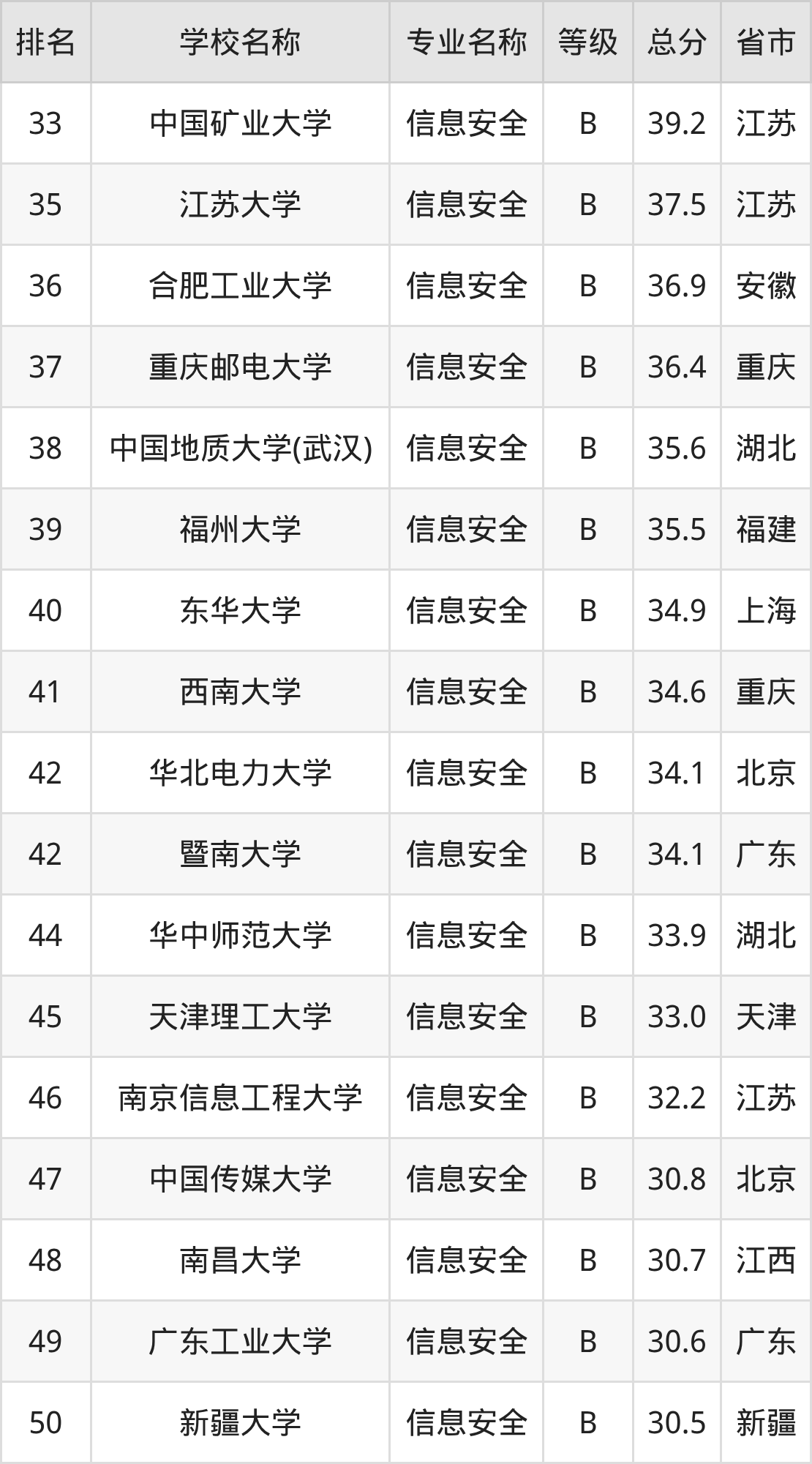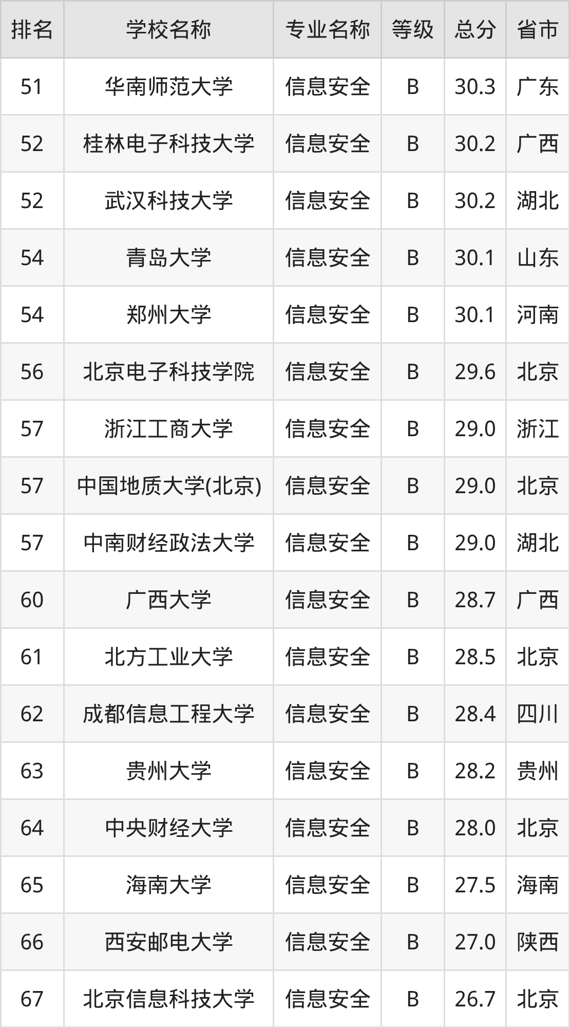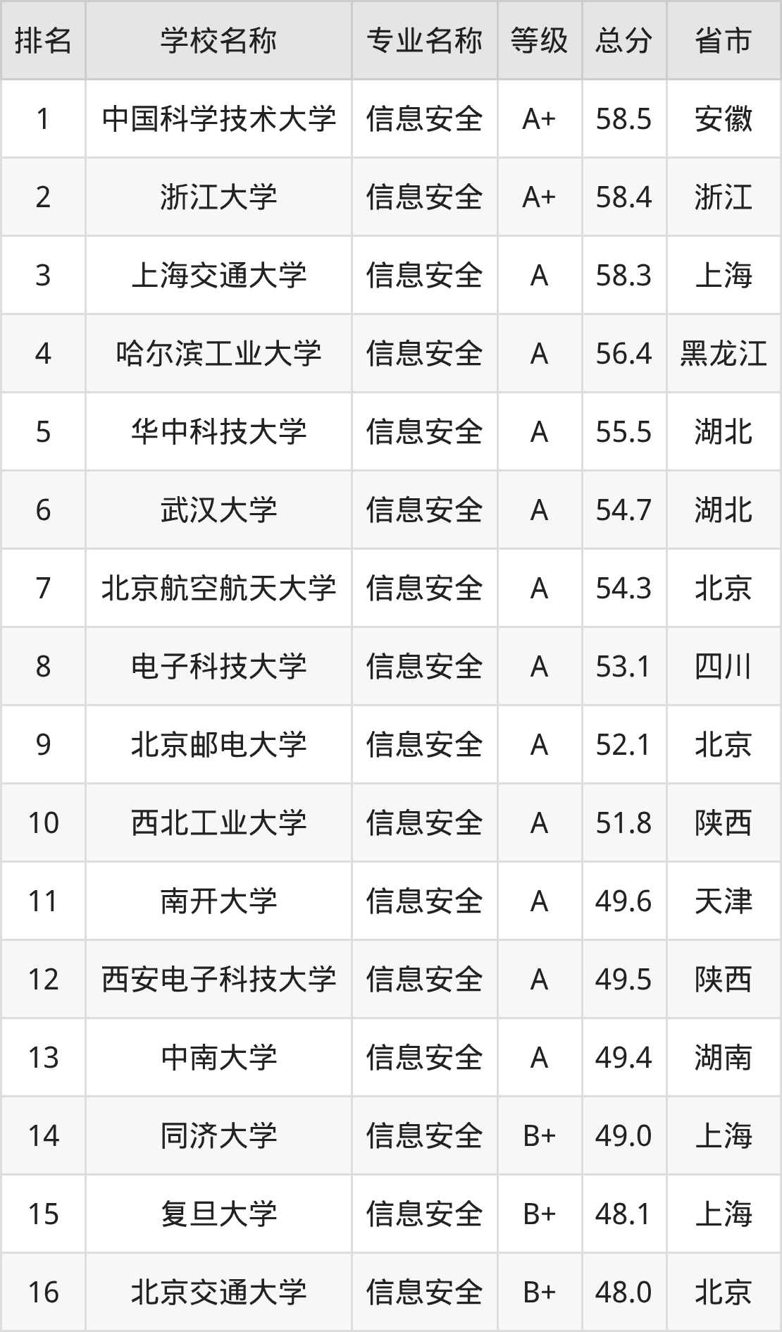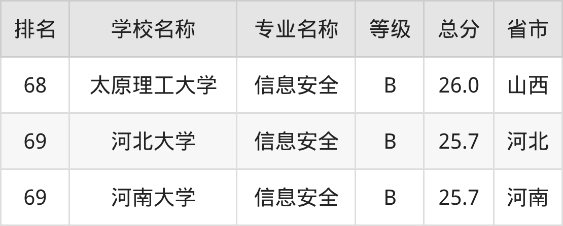 附信息安全专业全国70所院校排名榜单一览表!