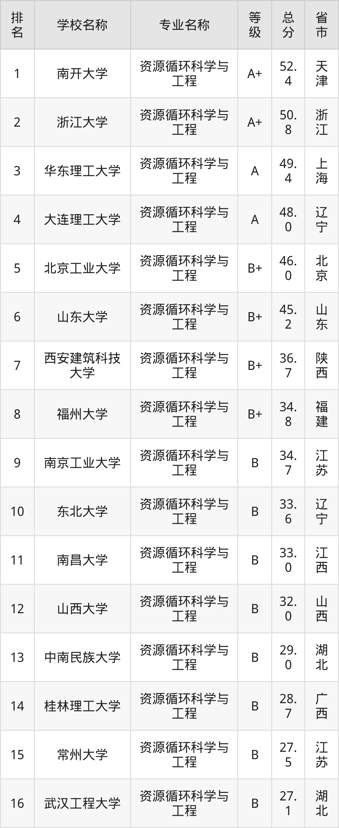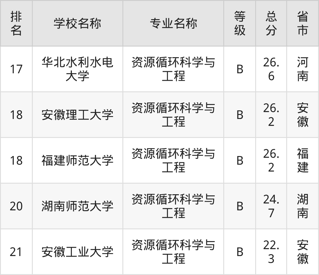 附资源循环科学与工程专业全国21所院校排名榜单一览表!