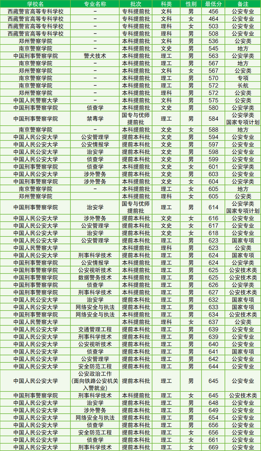 除此之外,低分警校还有:郑州警察学院2024年本科提前批最低分为536分(男、文科),南京警察学院2024年本科提前批最低分为545分(男、文科)。