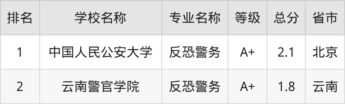 根据软科榜单可知,反恐警务专业全国排名前二的大学分别是: