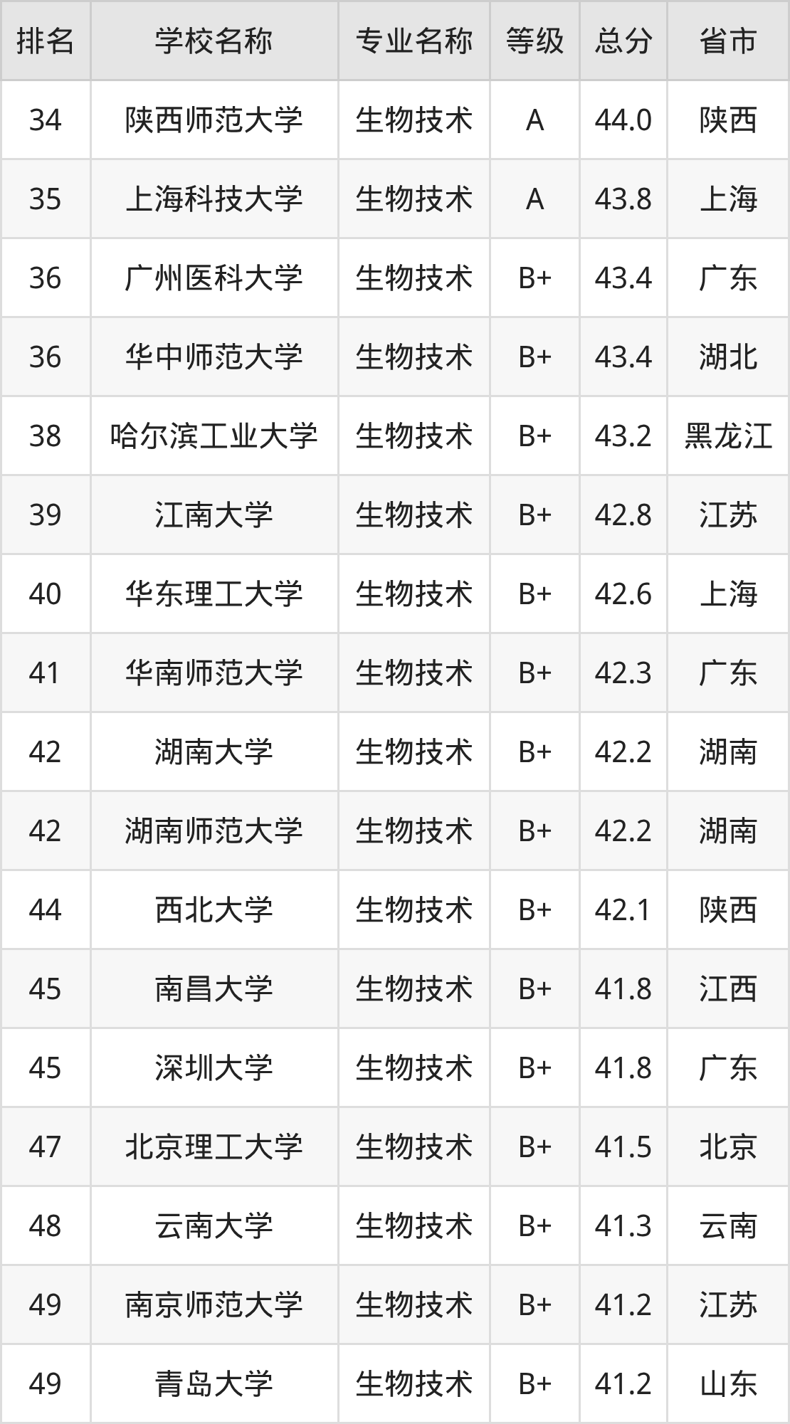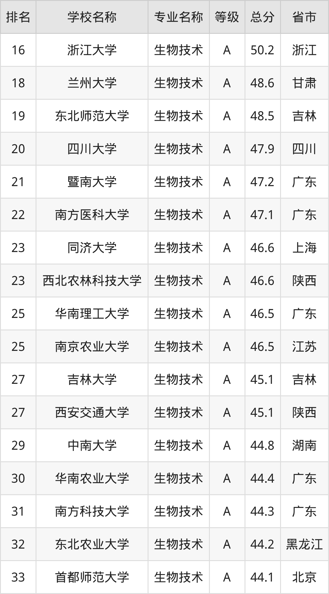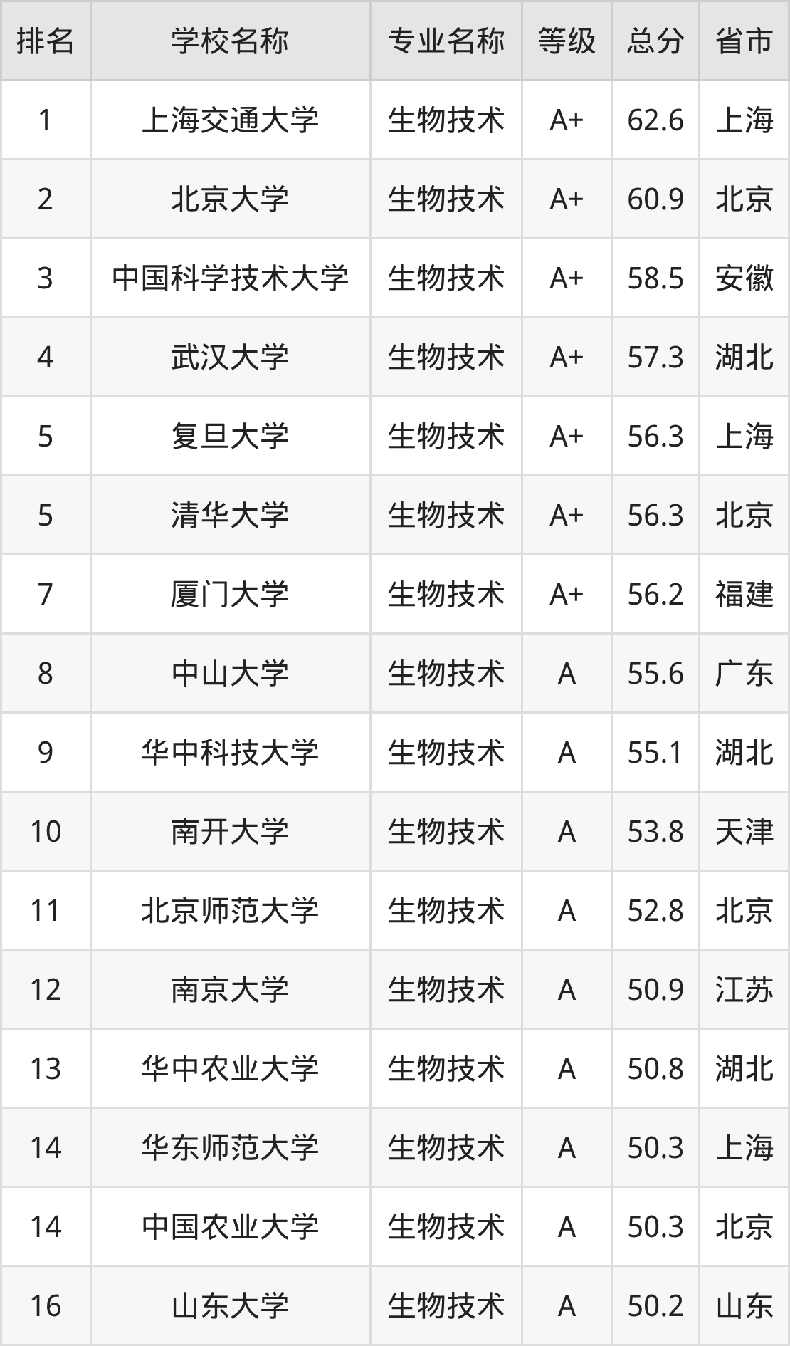 根据软科榜单可知,生物技术专业全国排名前十的大学分别是: