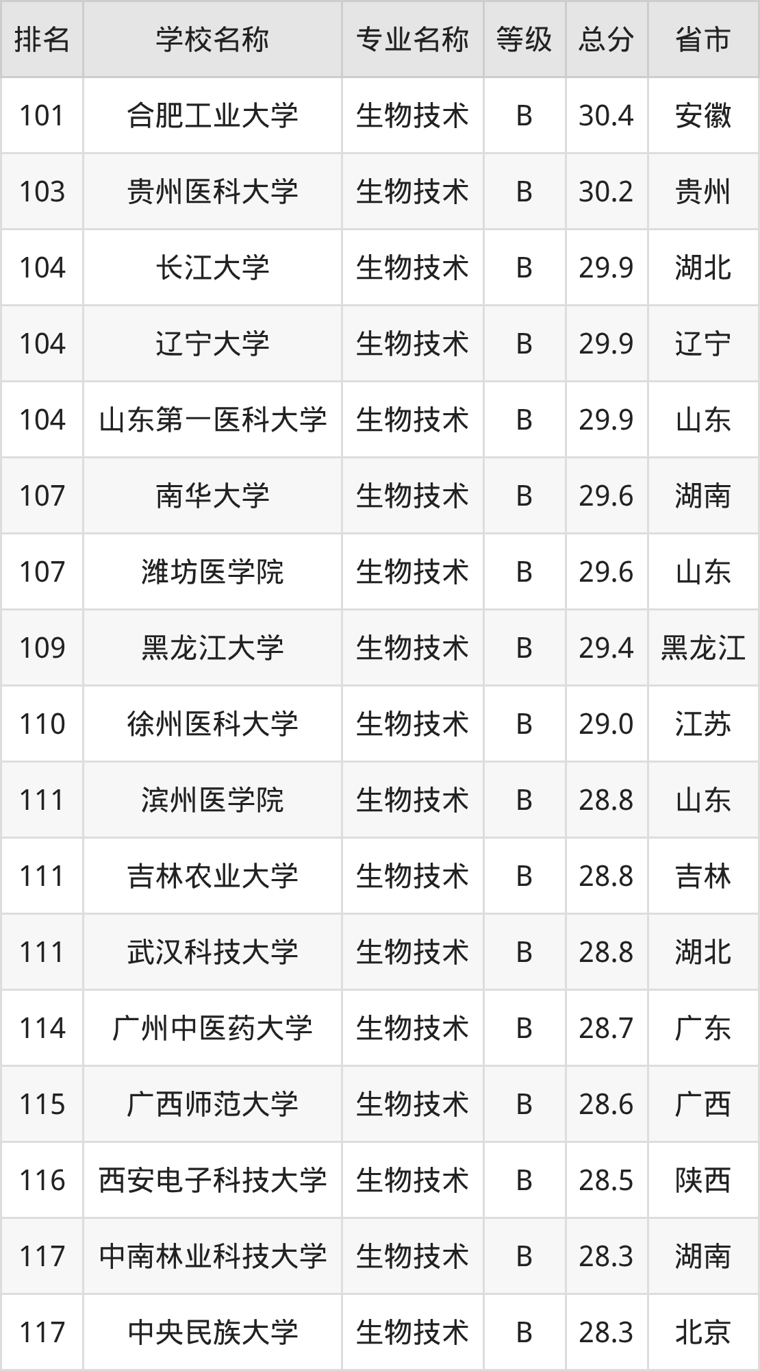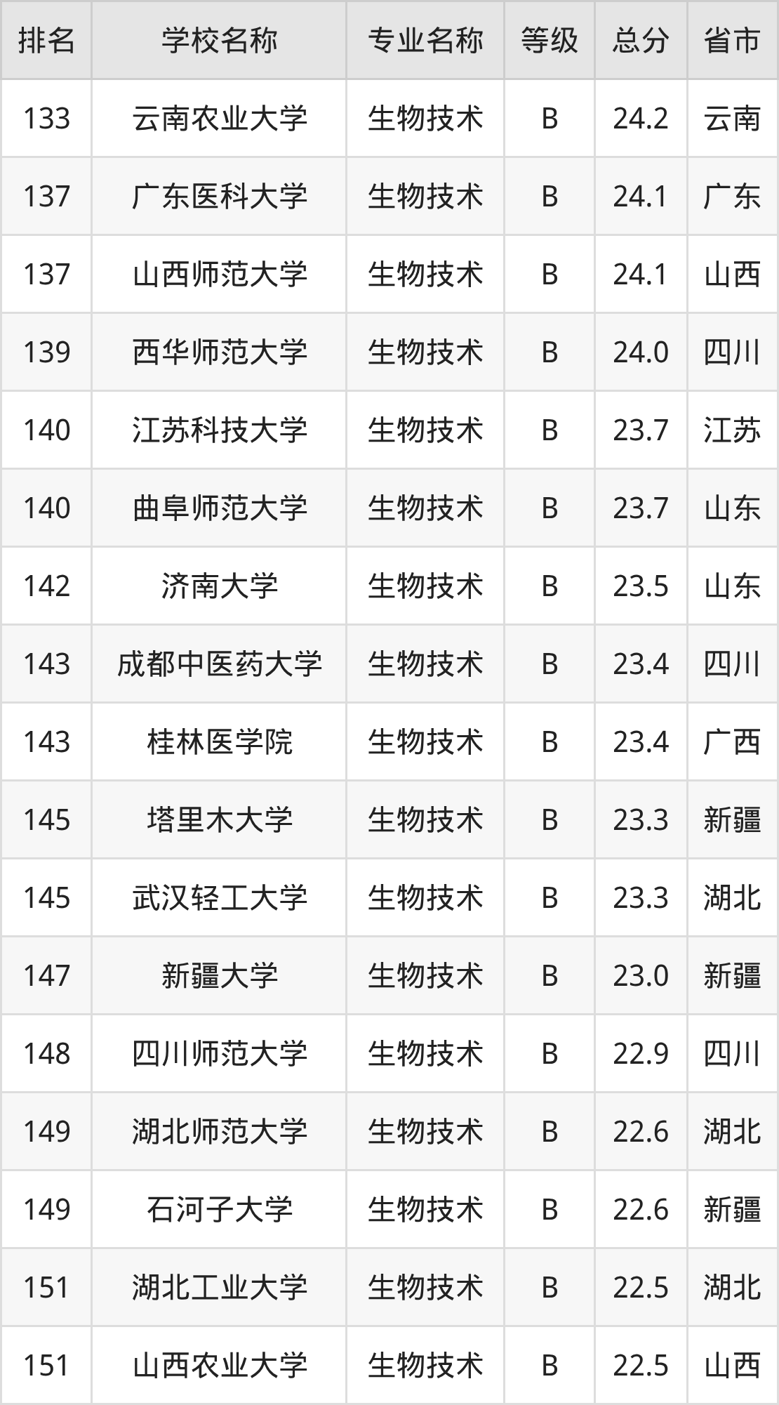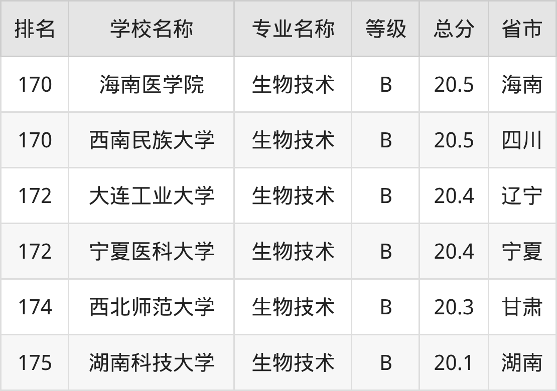 根据软科榜单可知,生物技术专业全国排名前十的大学分别是: