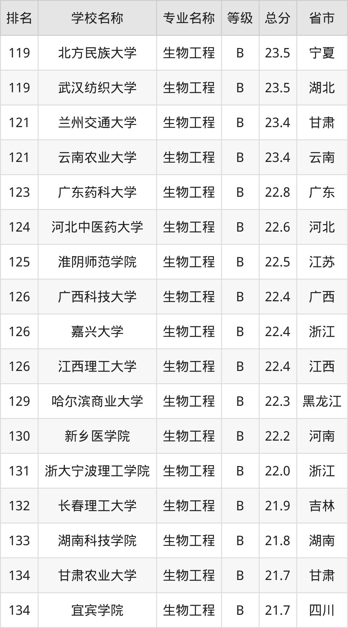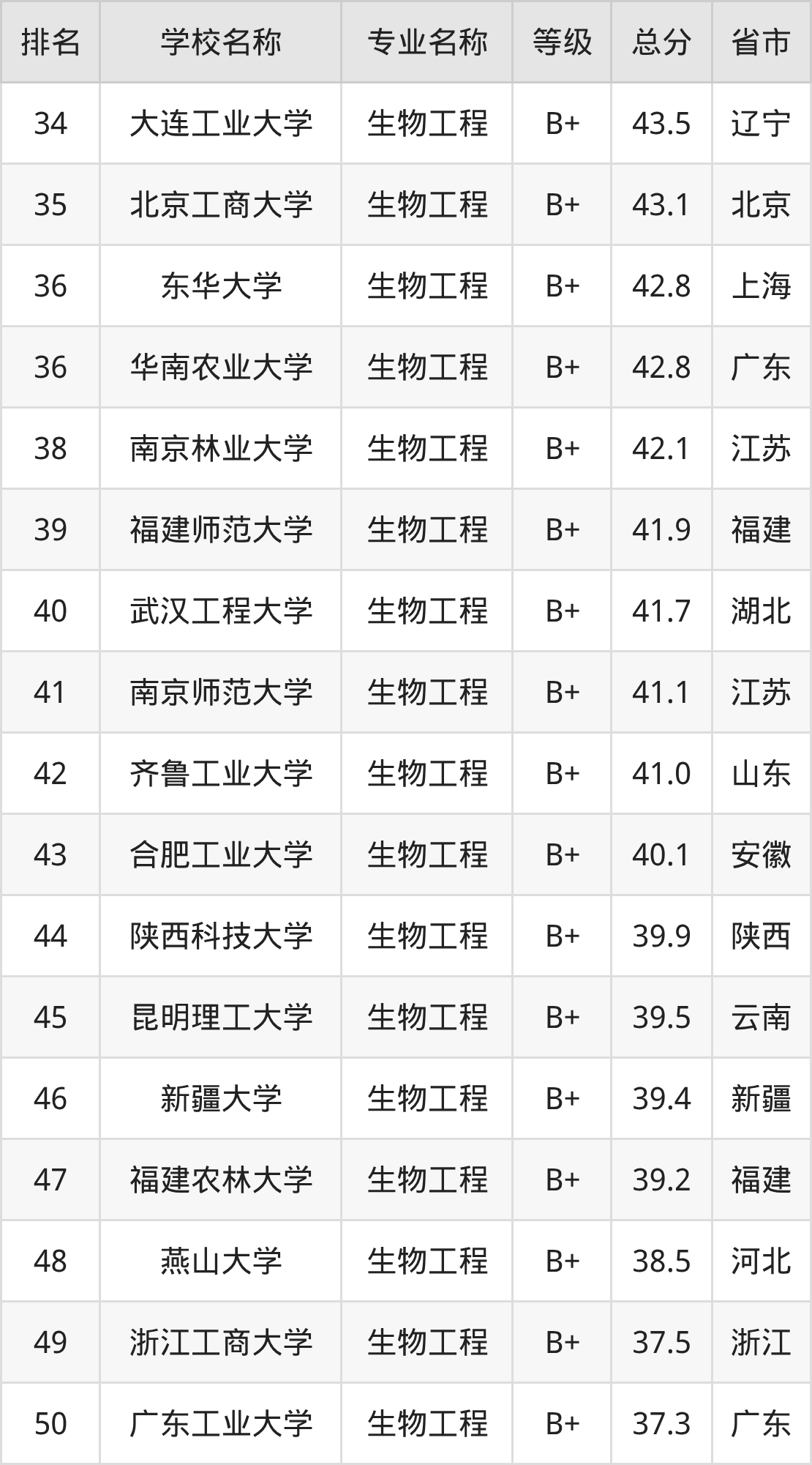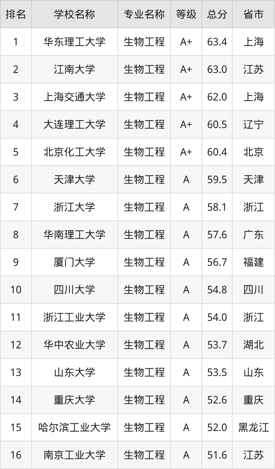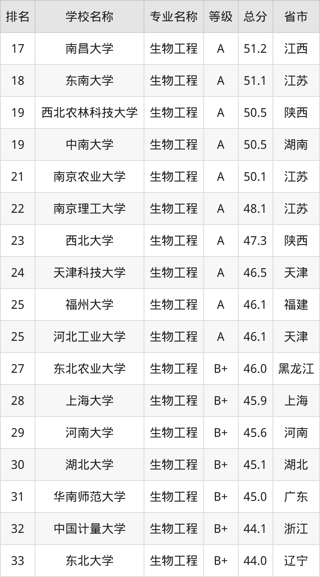 附生物工程专业全国135所院校排名榜单一览表!