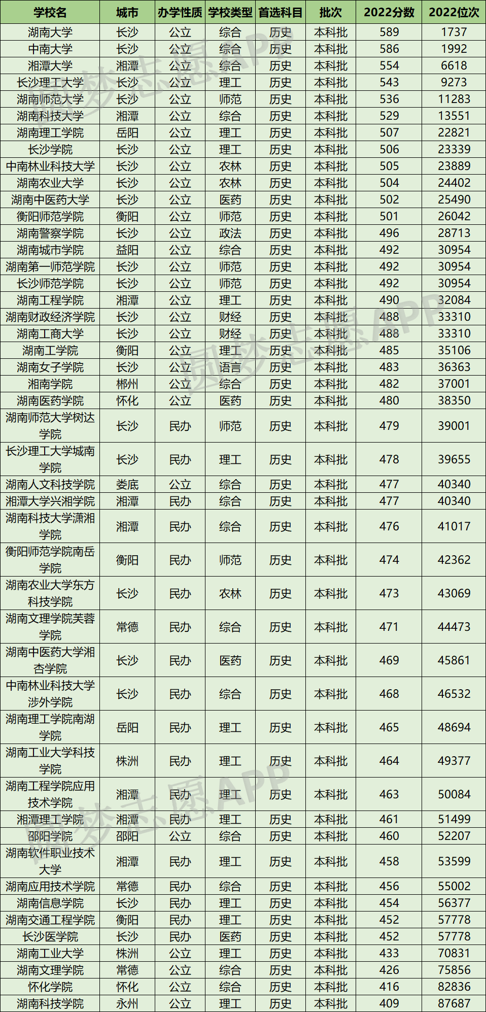 湖南历史类中分数最高的本科大学分别为湖南大学、中南大学、湘潭大学、长沙理工大学、湖南师范大学、湖南科技大学、湖南理工学院、长沙学院、中南林业科技大学、湖南农业大学。对应分数区间为589分-504分,对应全省位次为1737-24402。