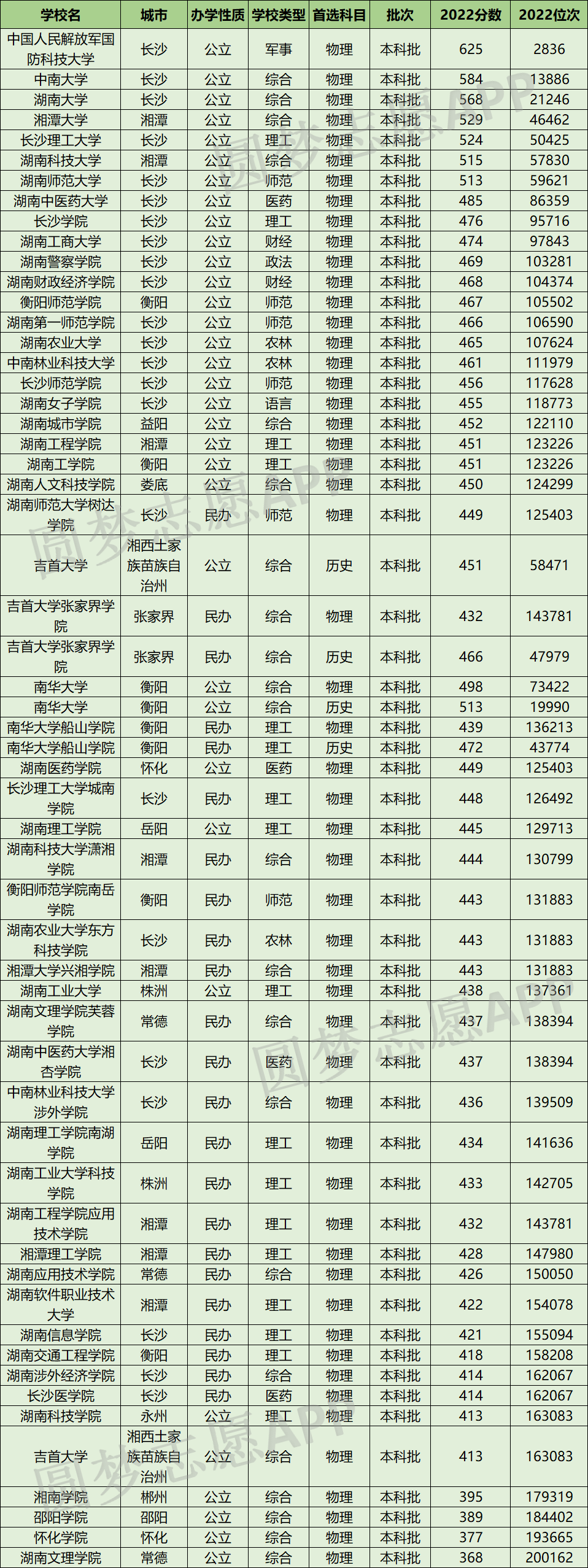湖南物理类中分数最高的本科大学分别为中国人民解放军国防科技大学、中南大学、湖南大学、湘潭大学、长沙理工大学、湖南科技大学、湖南师范大学、湖南中医药大学、长沙学院、湖南工商大学。对应分数区间为625分-474分,对应全省位次为2836-97843。
