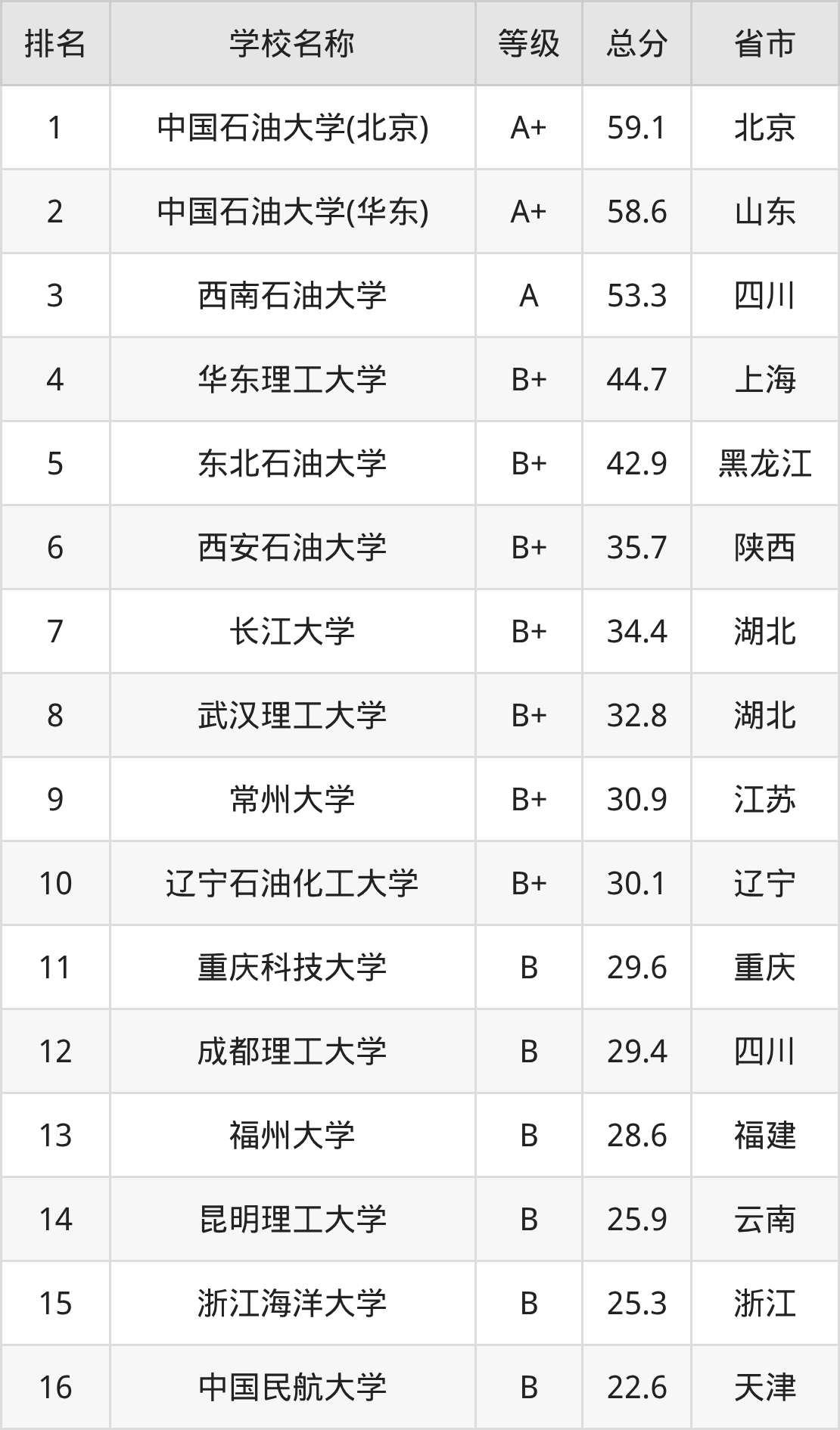 中国石油大学(北京):第1名,评分为59.1