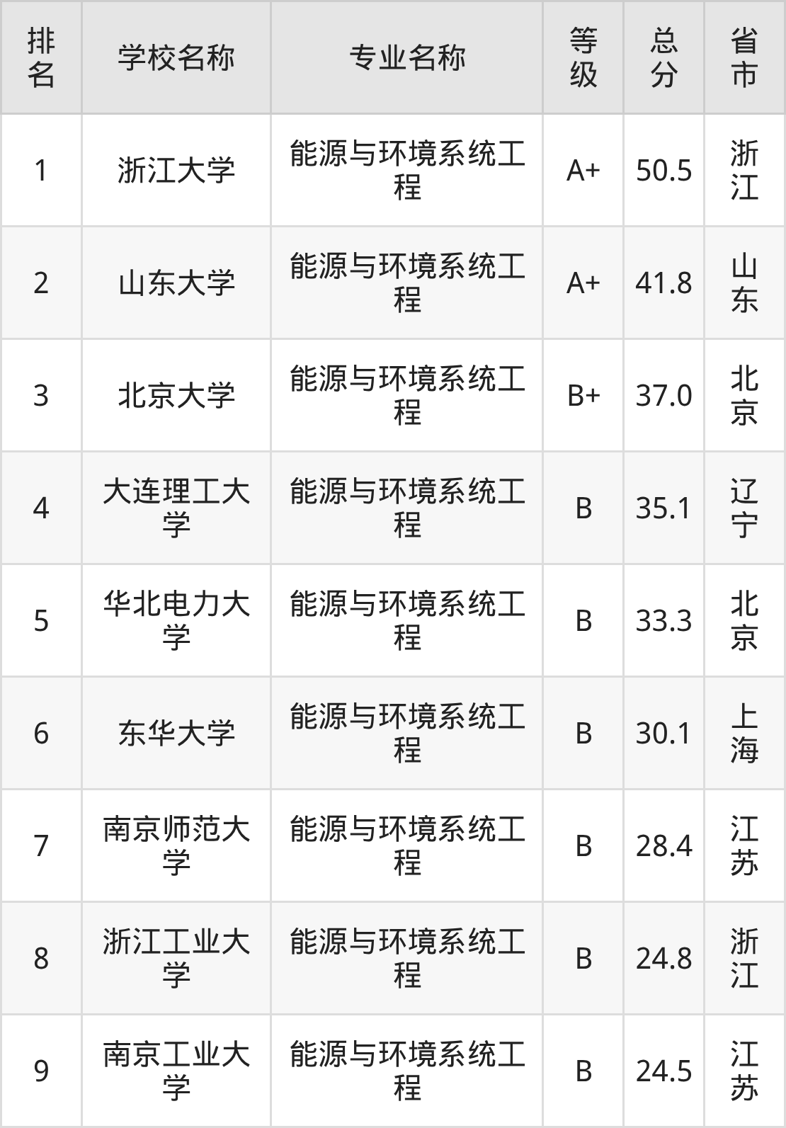根据软科榜单可知,能源与环境系统工程专业全国排名前九的大学分别是: