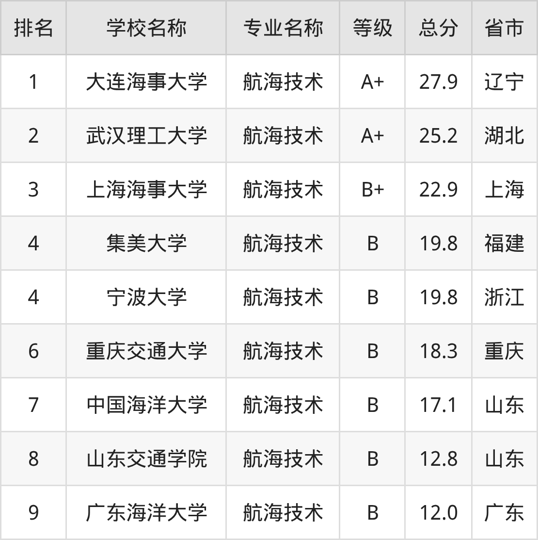 根据软科榜单可知,航海技术专业全国排名前九的大学分别是: