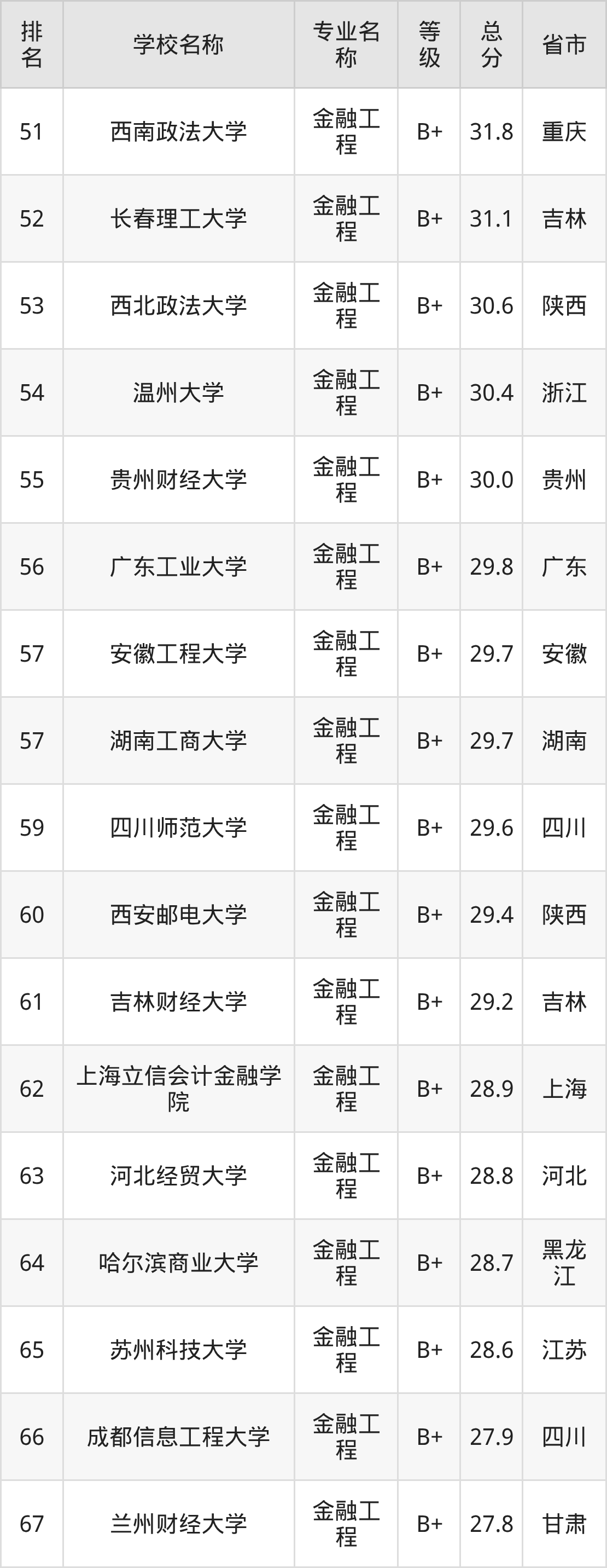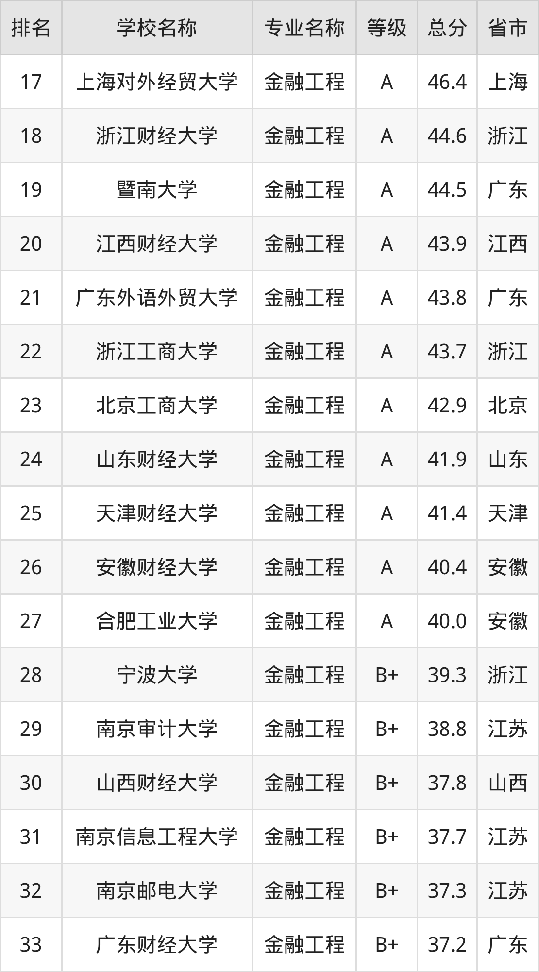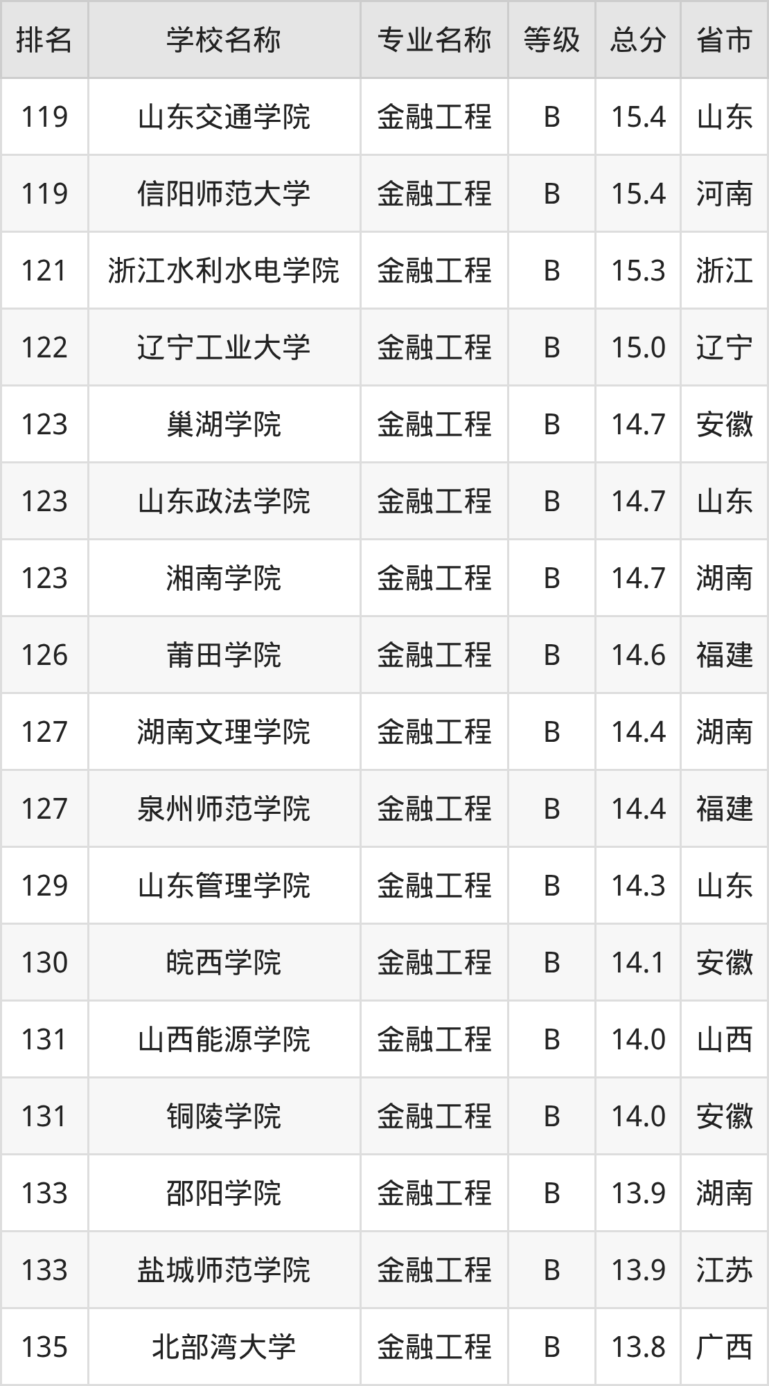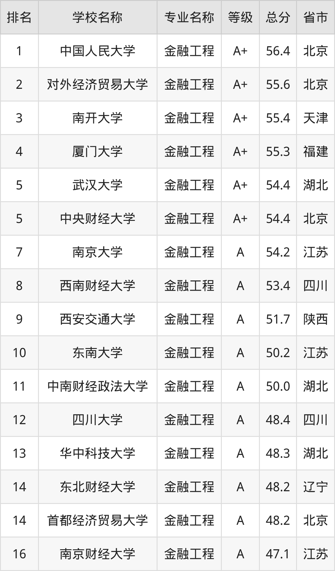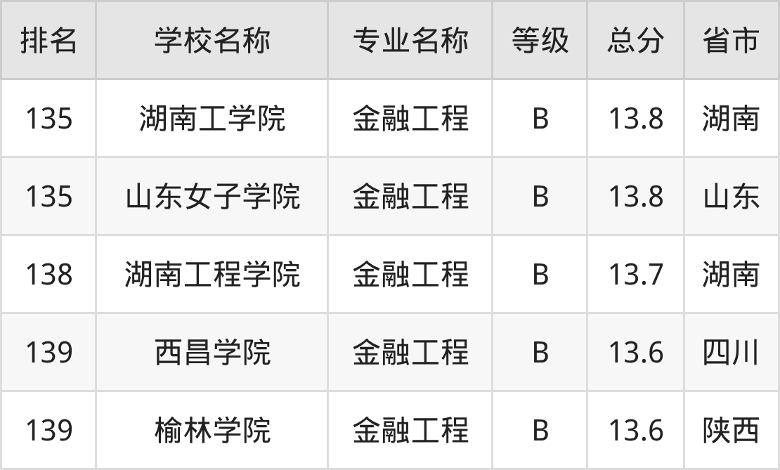 附金融工程专业全国140所院校排名榜单一览表!
