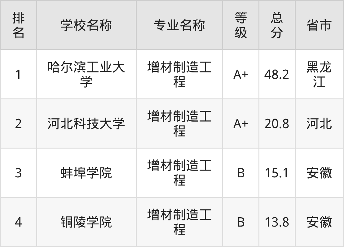 根据软科榜单可知,增材制造工程专业全国排名前四的大学分别是: