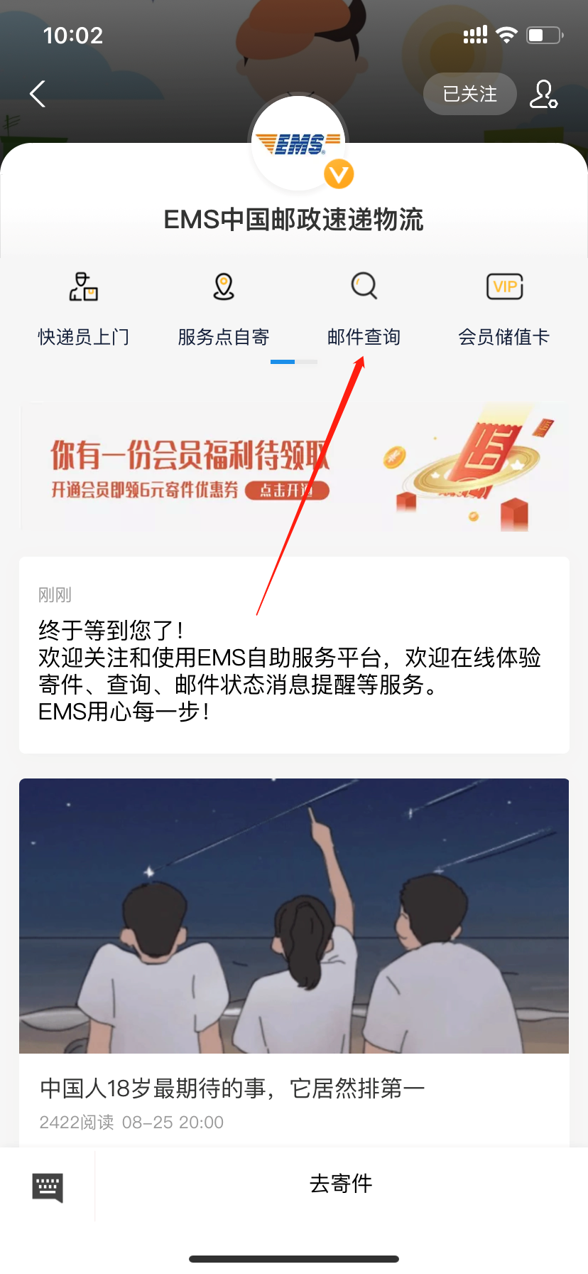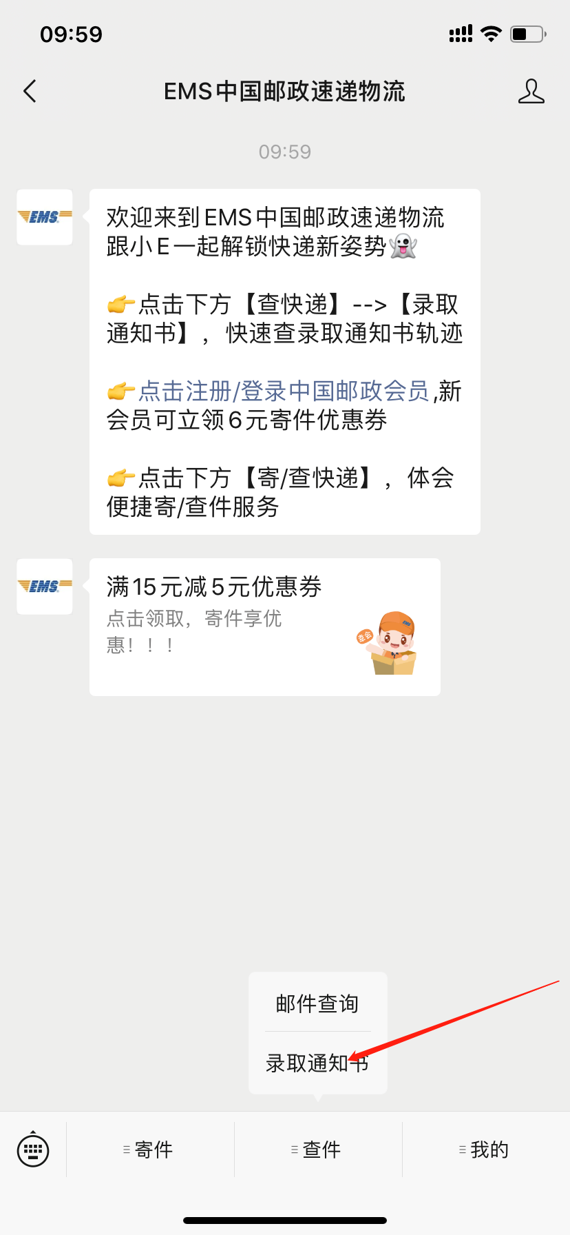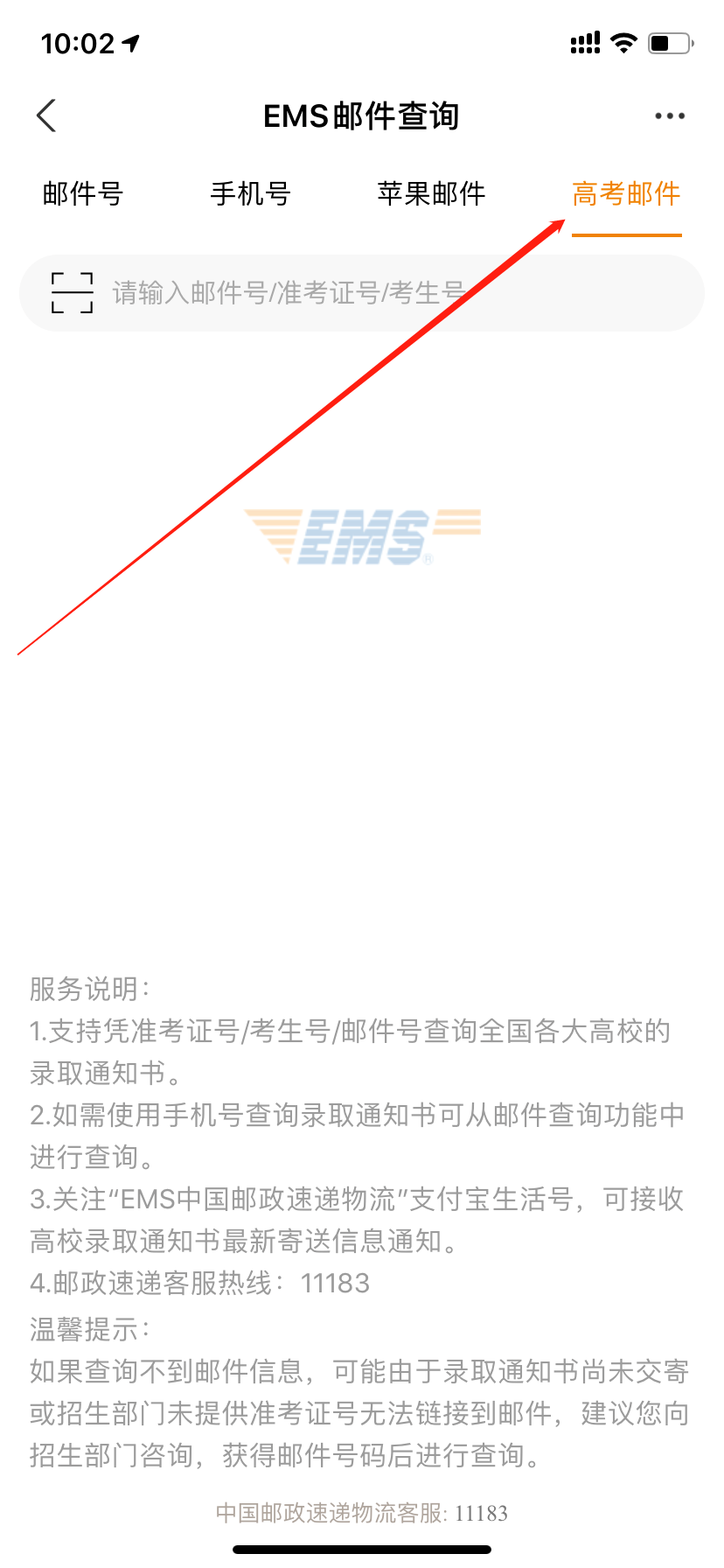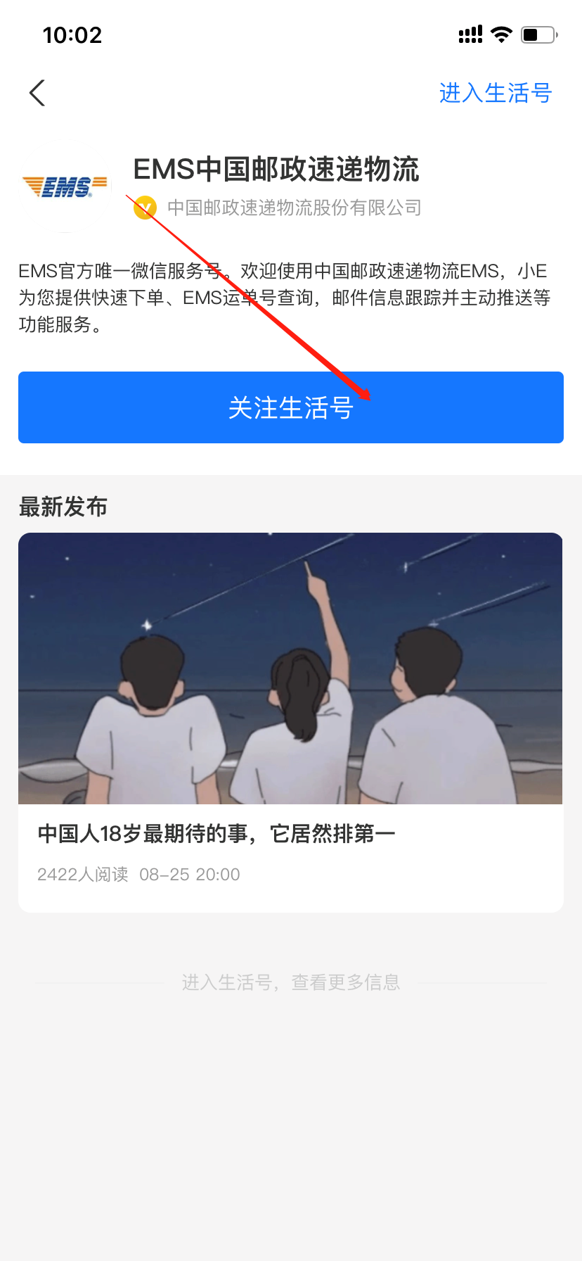 在生活号中关注“EMS中国邮政速递物流”,点击“我要查询”,即可找到查询高考通知书入口。以下为具体操作方法: