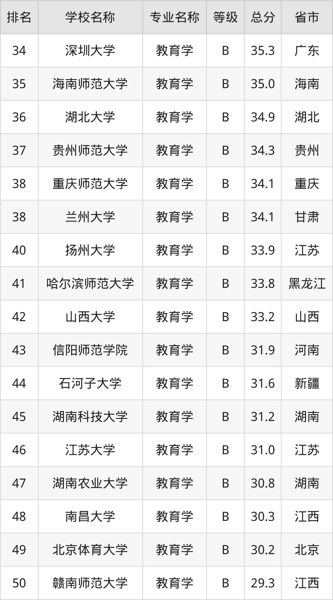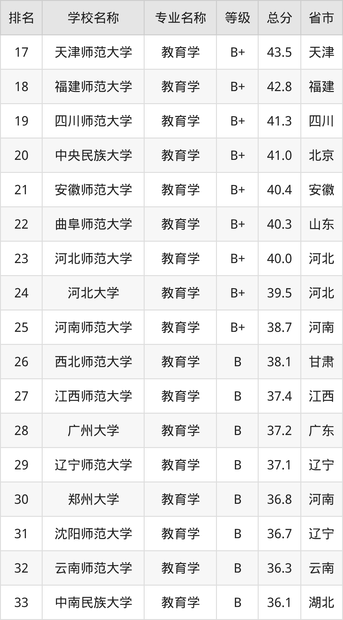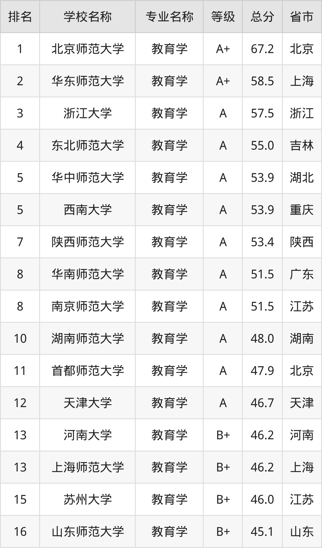 根据软科榜单可知,教育学专业全国排名前十的大学分别是: