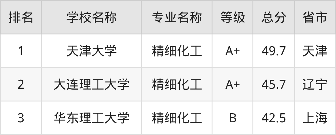 根据软科榜单可知,精细化工专业全国排名前三的大学分别是: