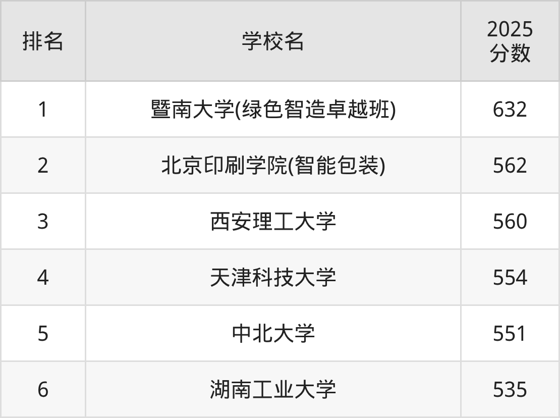 根据软科2025最新排名可知,包装工程专业最好的十所名校名单如下: