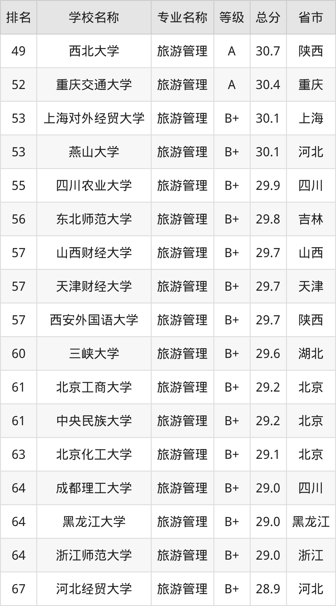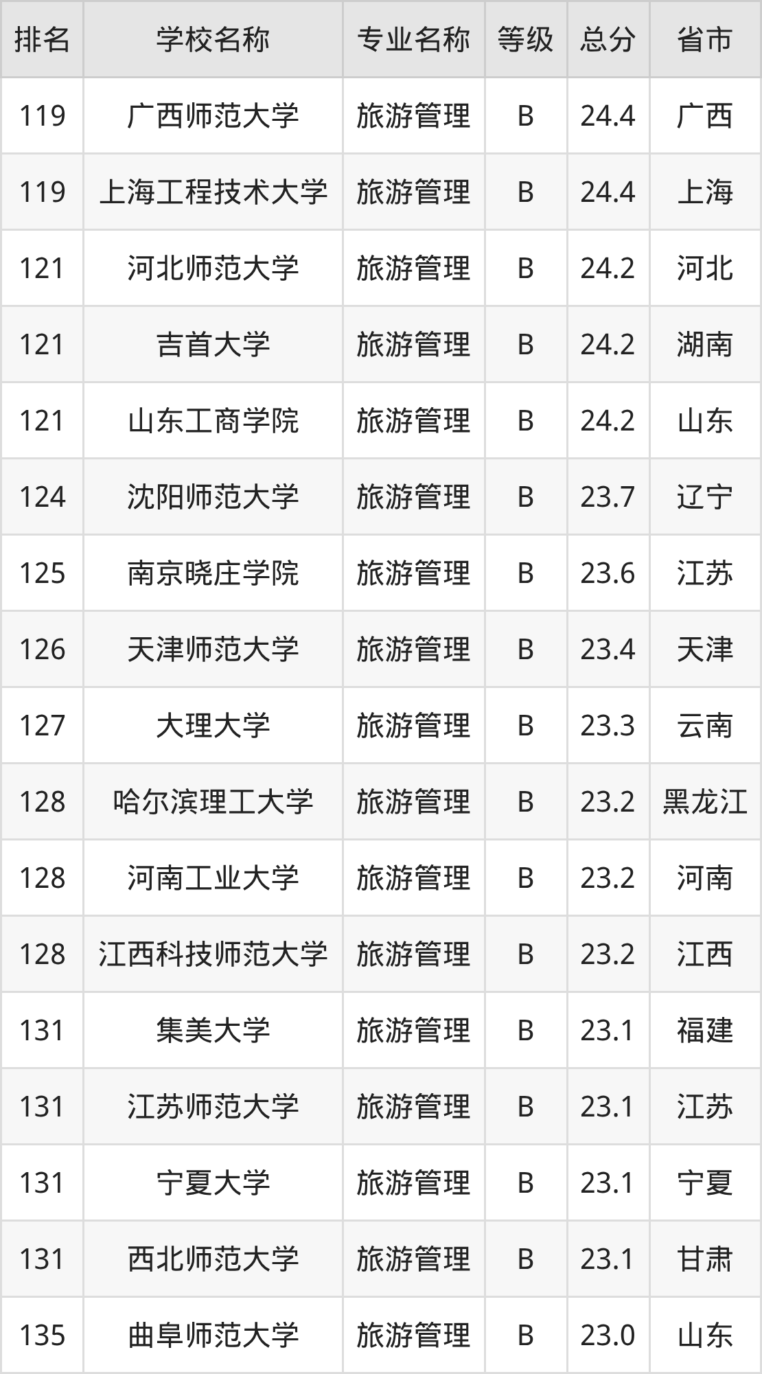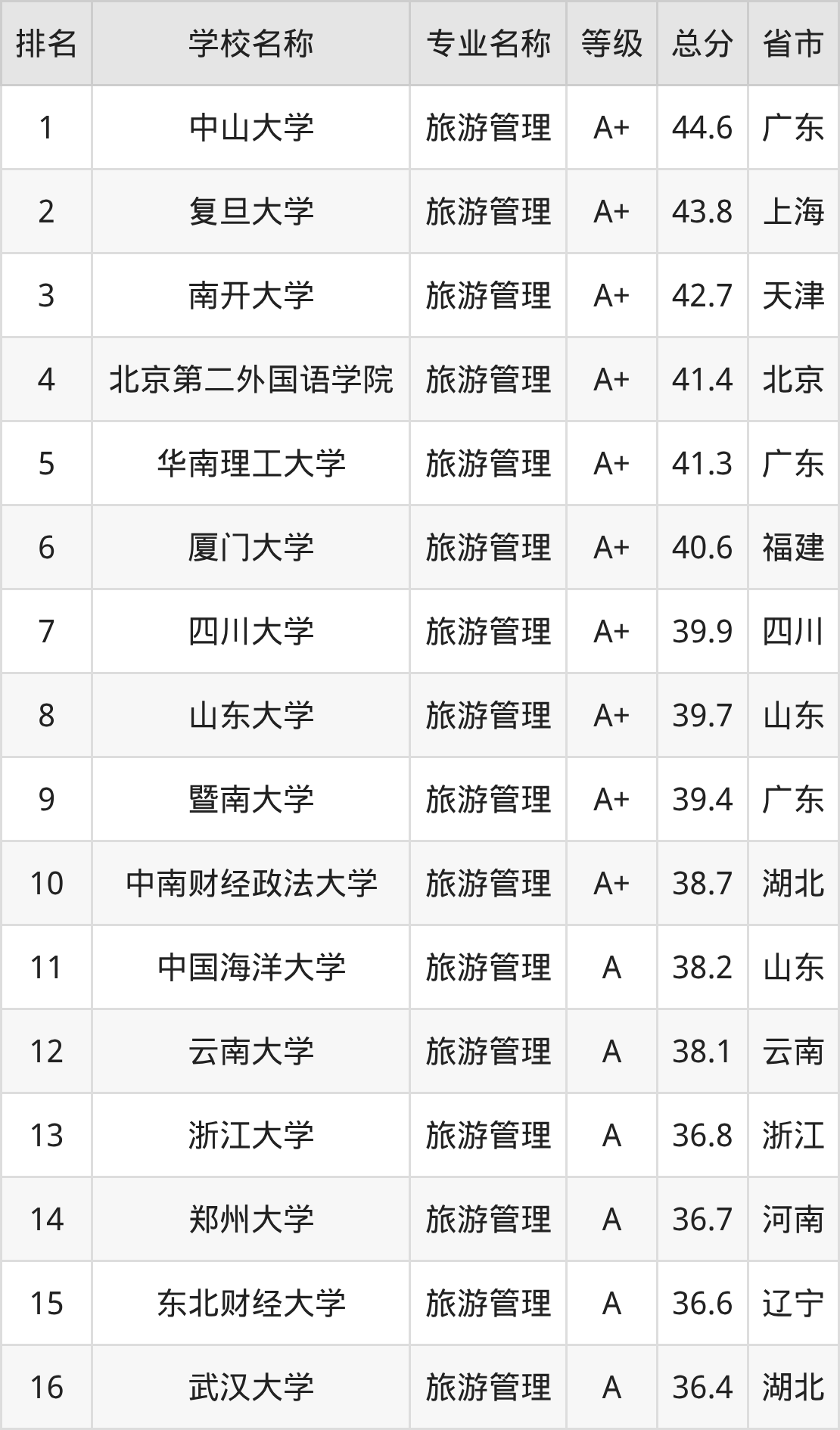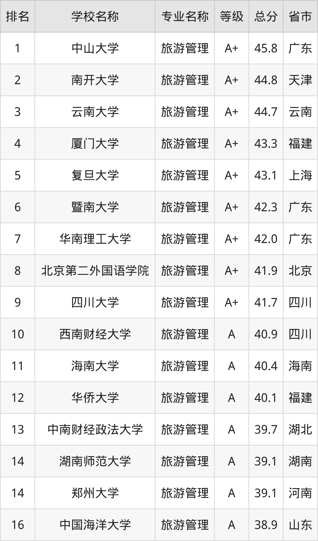 根据软科榜单可知,旅游管理专业全国排名前十的大学分别是: