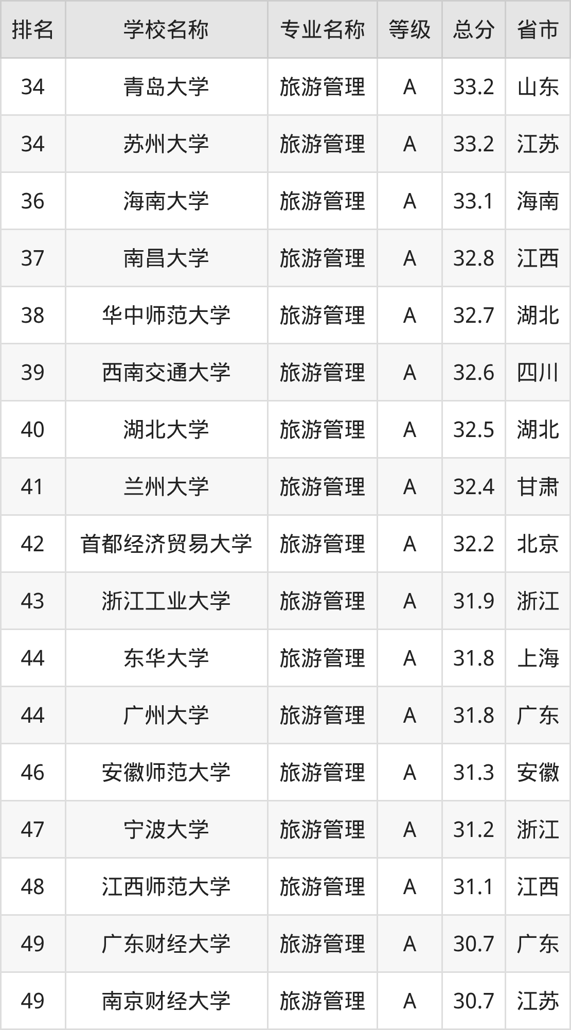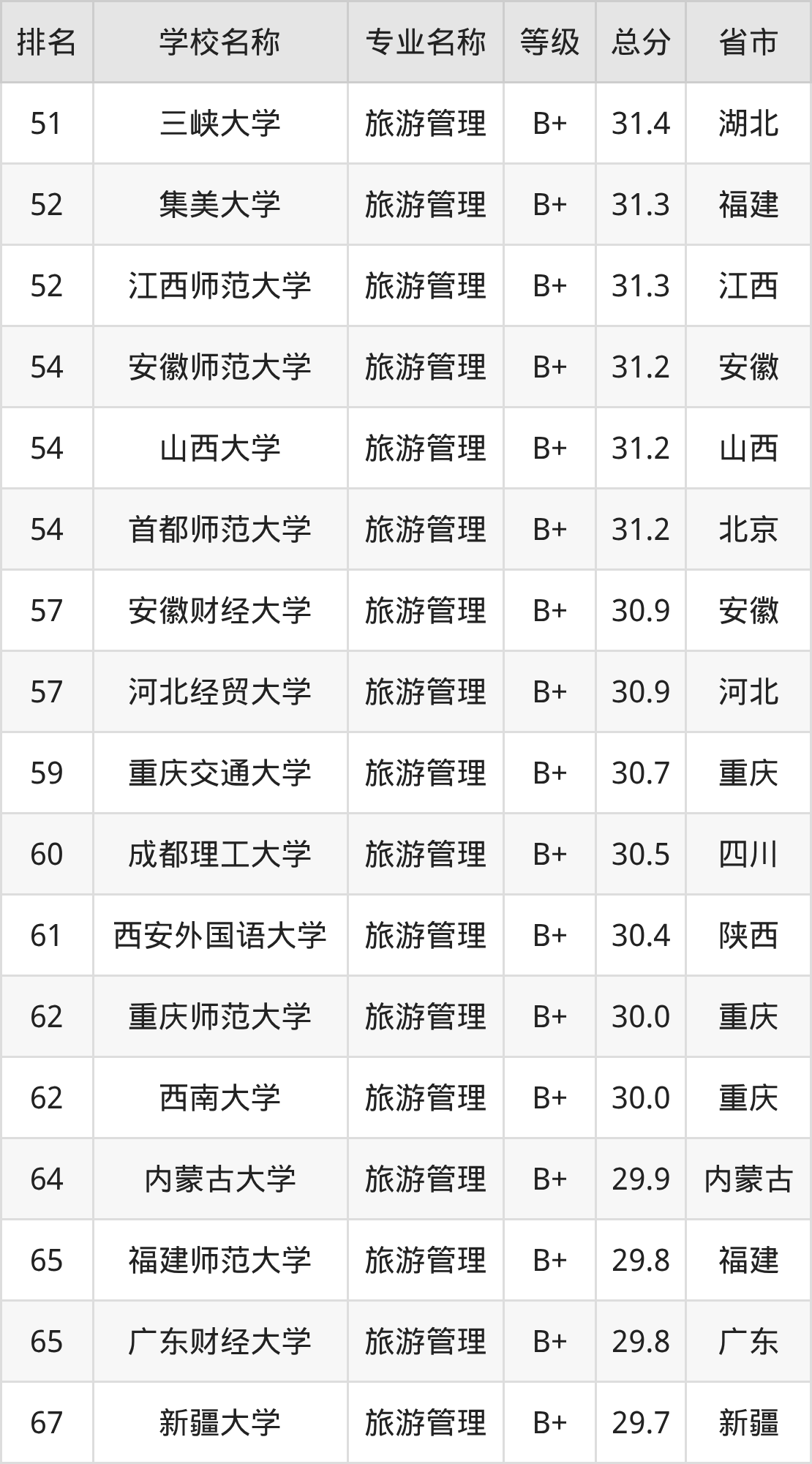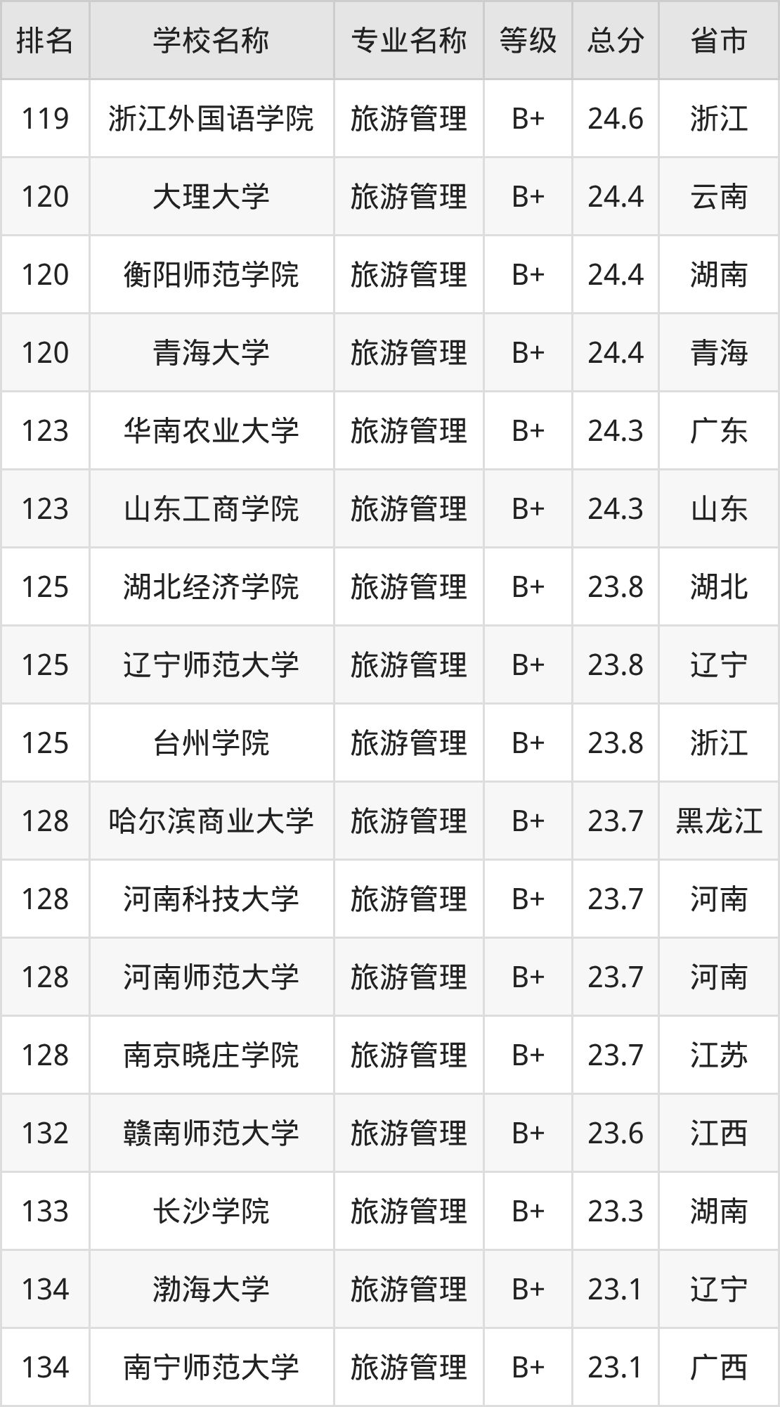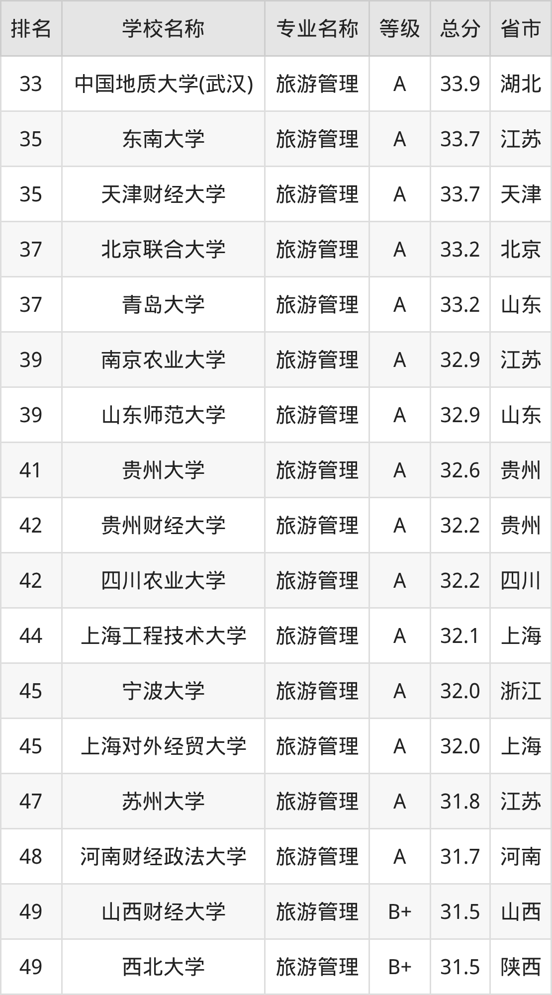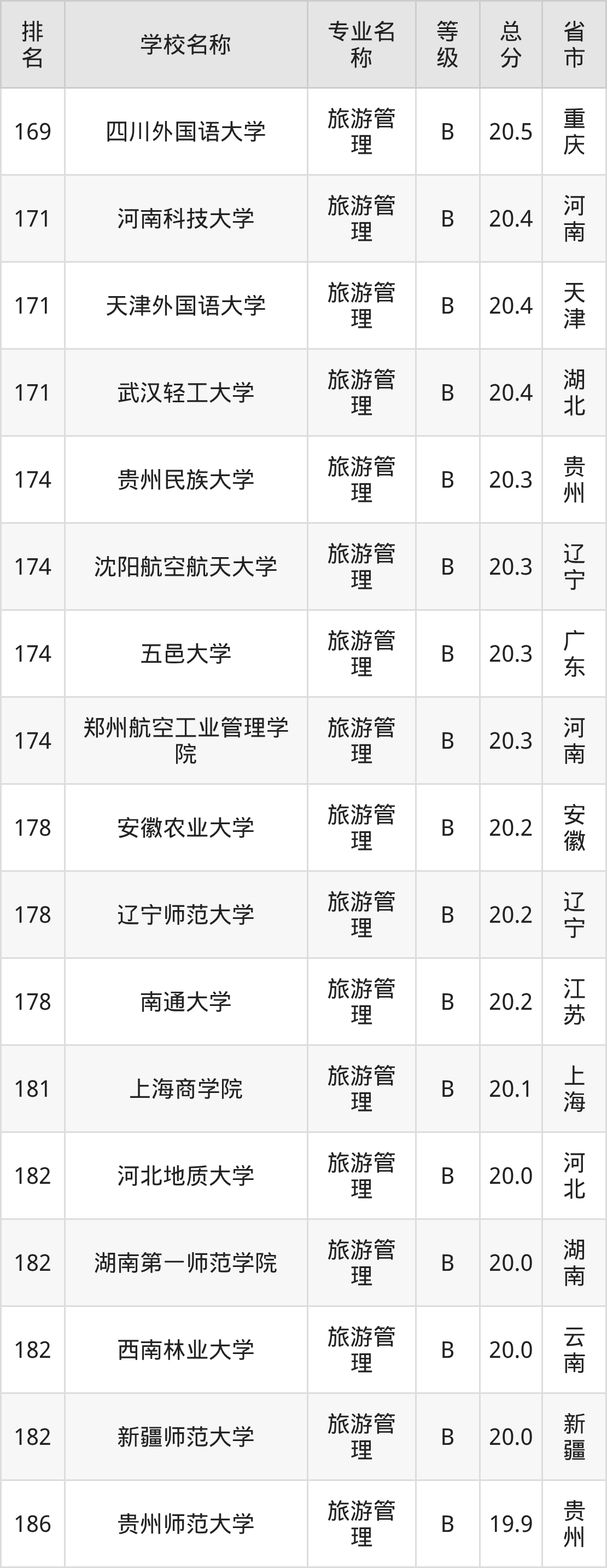 根据软科榜单可知,旅游管理专业全国排名前十的大学分别是: