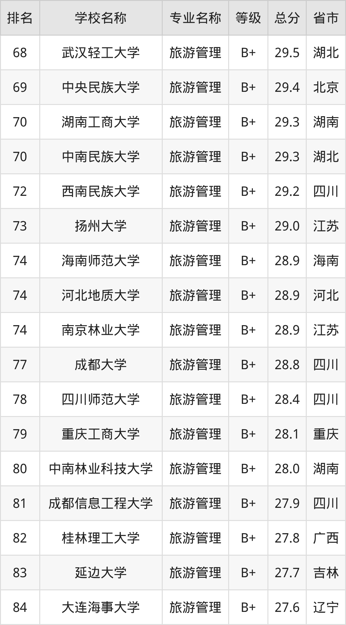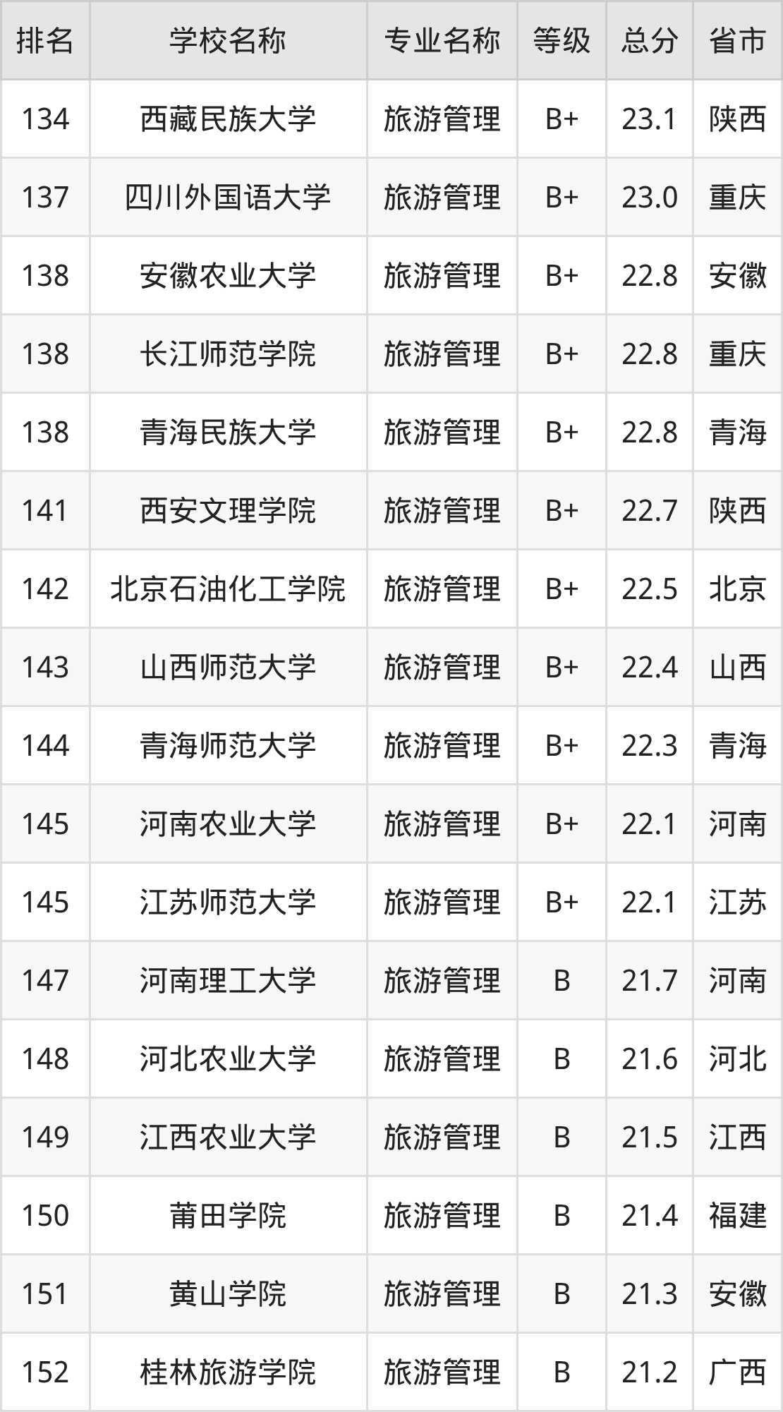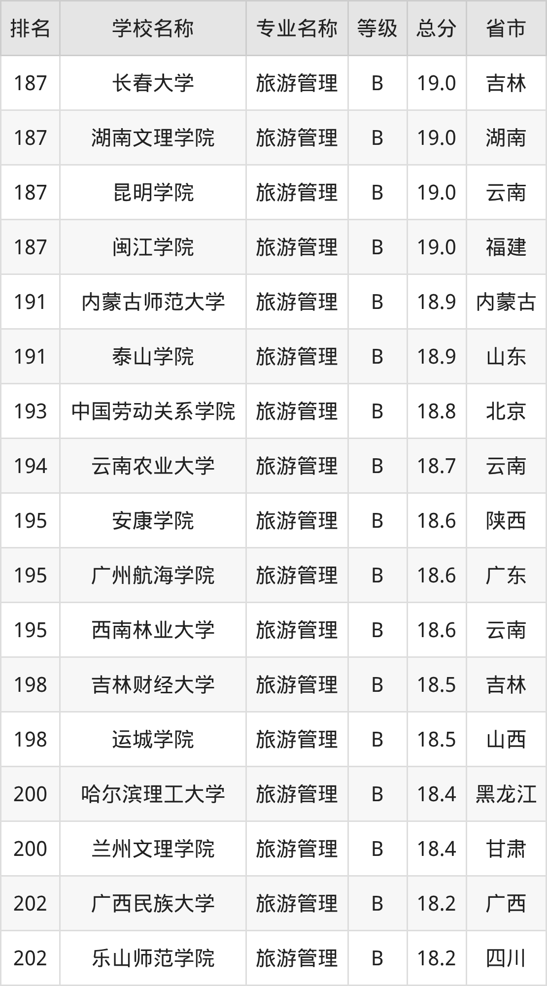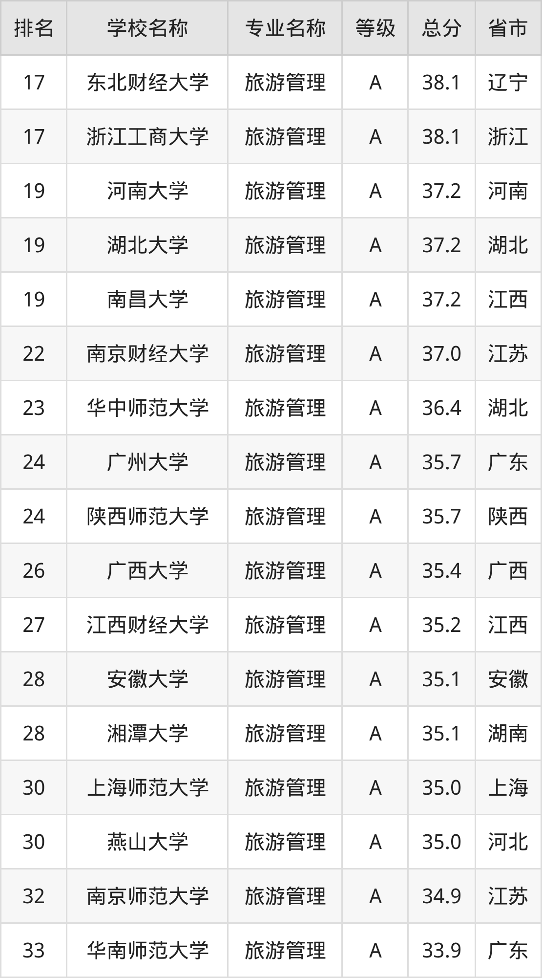 根据软科榜单可知,旅游管理专业全国排名前十的大学分别是: