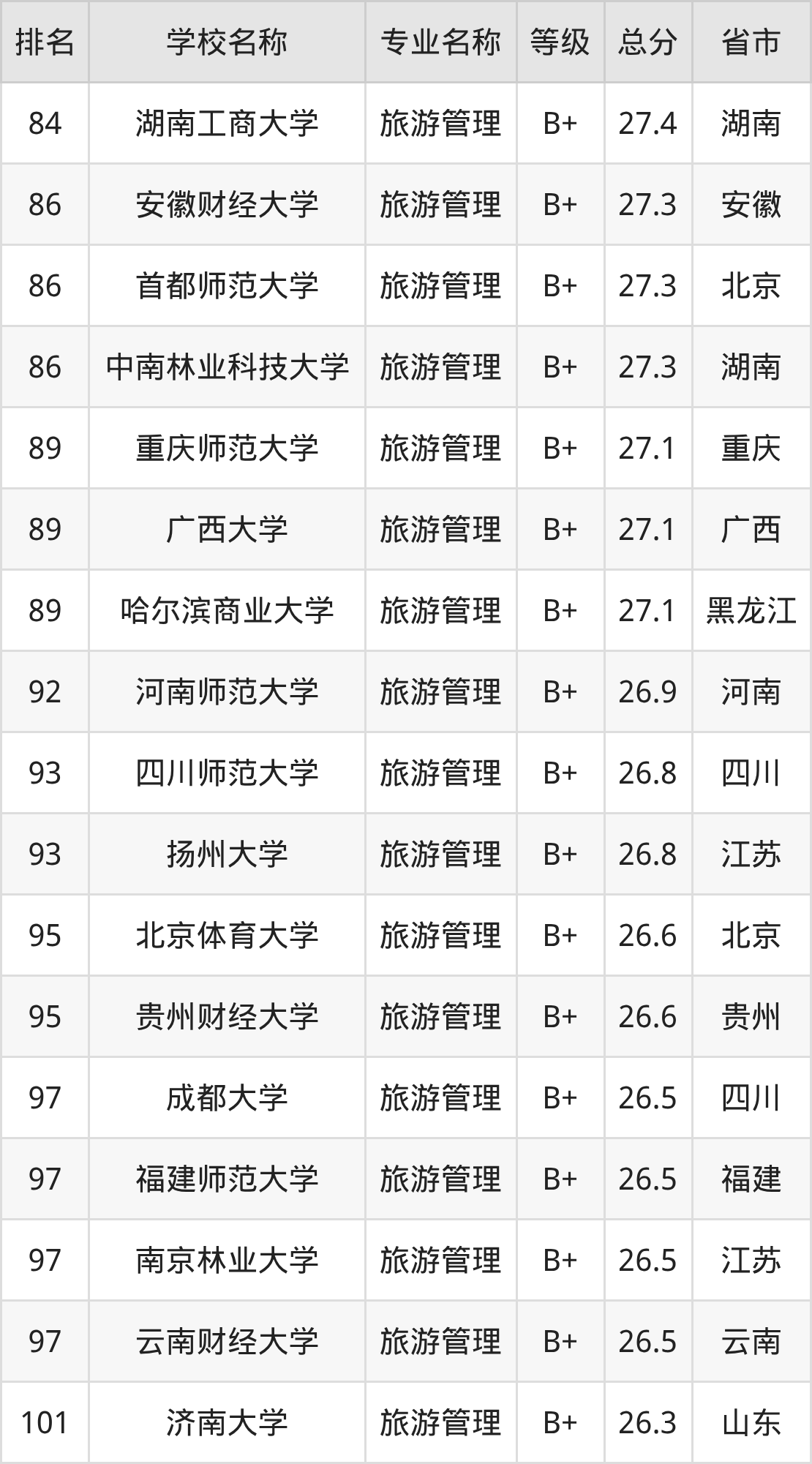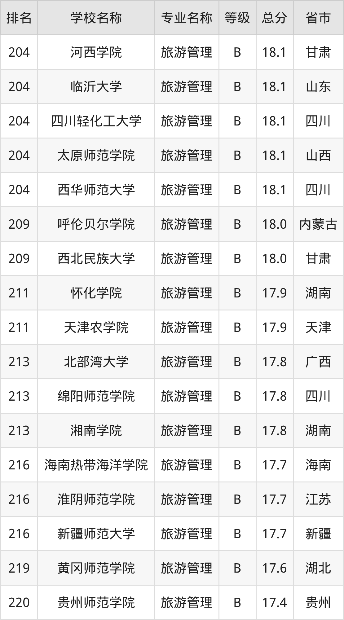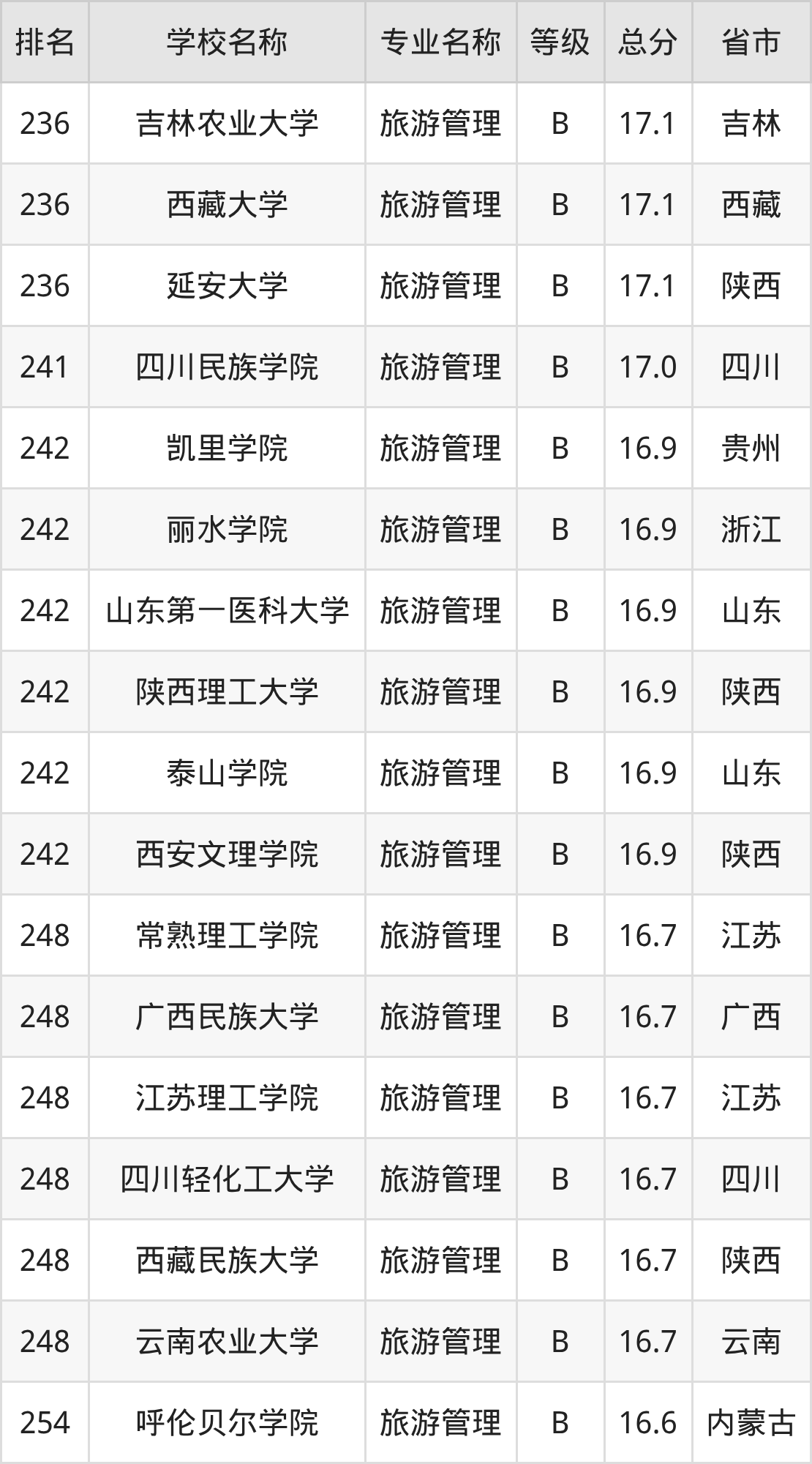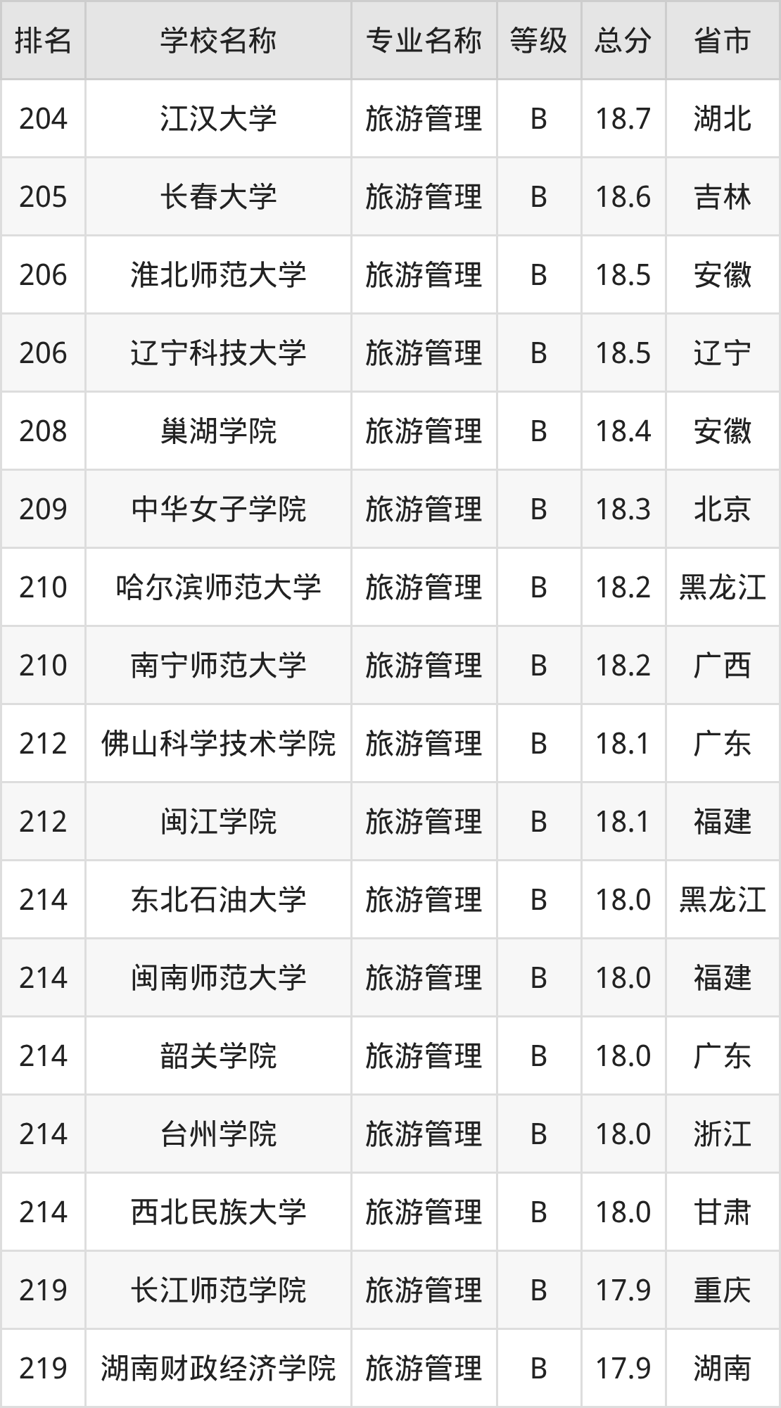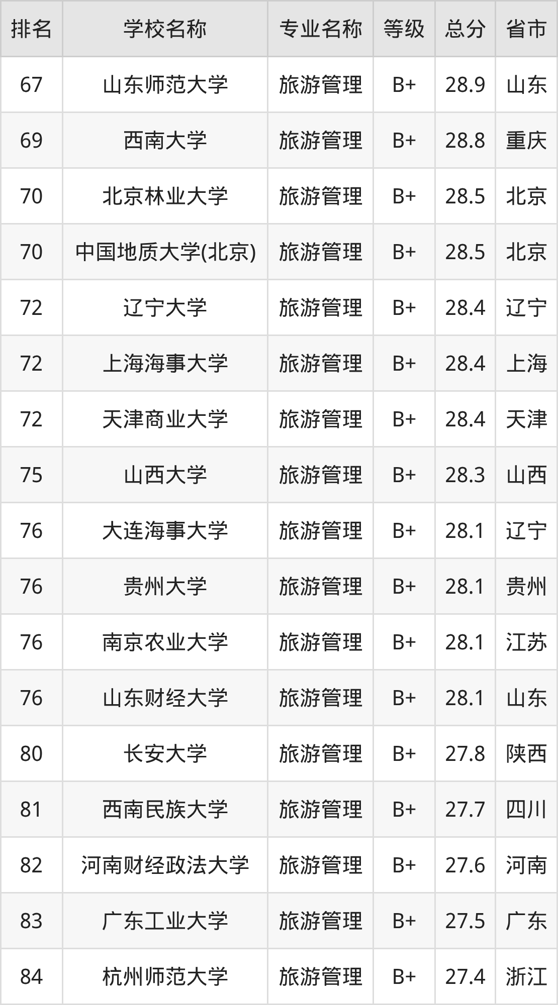 根据软科榜单可知,旅游管理专业全国排名前十的大学分别是: