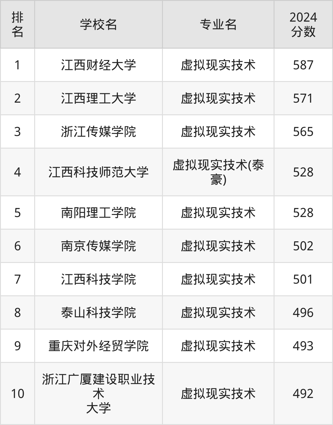 虚拟现实技术专业排名前10的大学中,收分较低的有浙江广厦建设职业技术大学(492分)、重庆对外经贸学院(493分)、泰山科技学院(496分)、江西科技学院(501分)、南京传媒学院(502分)。