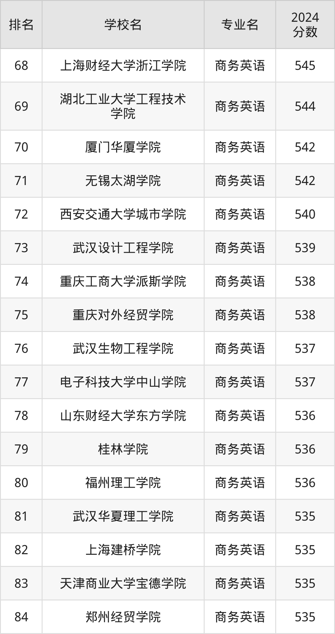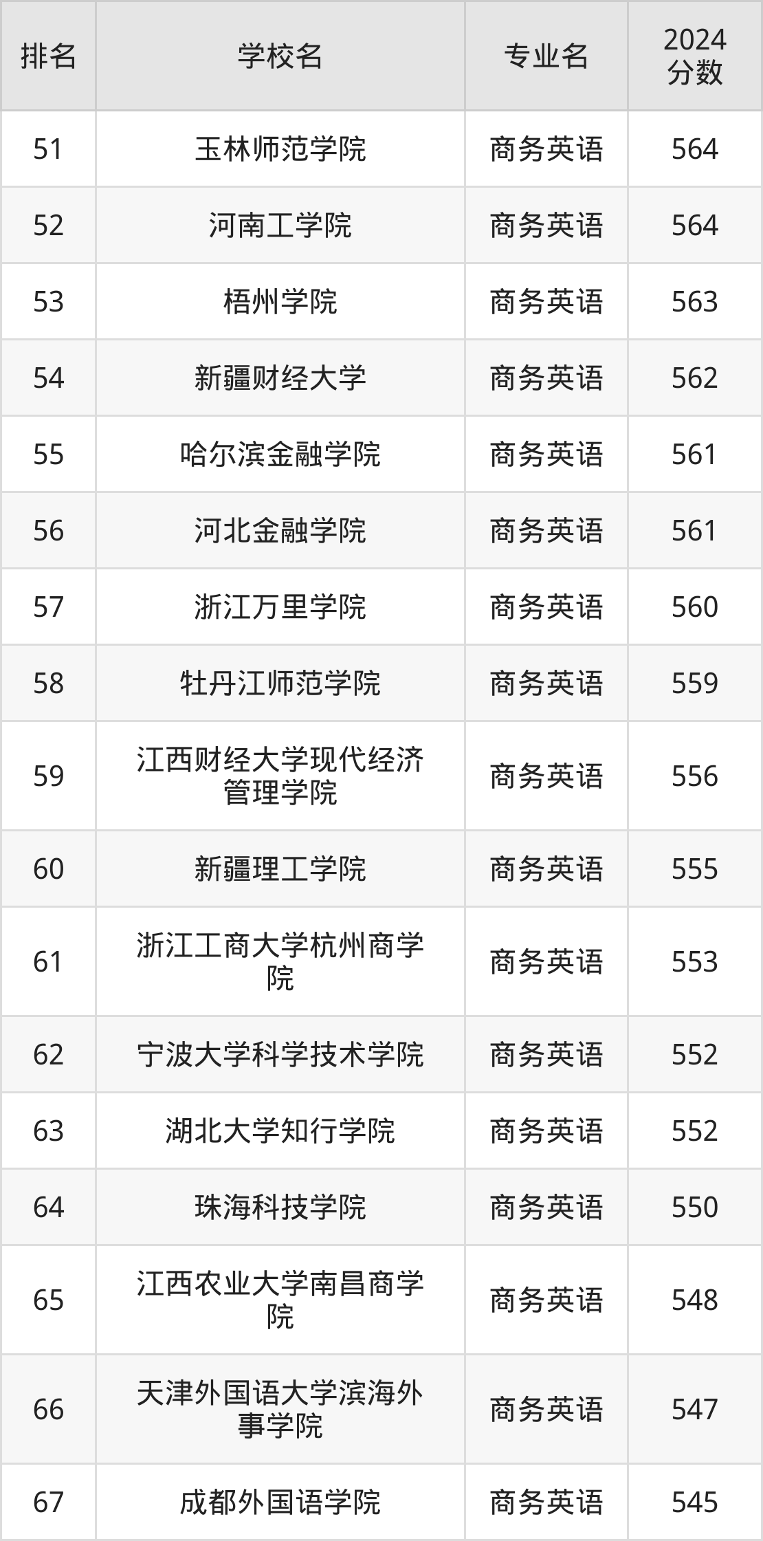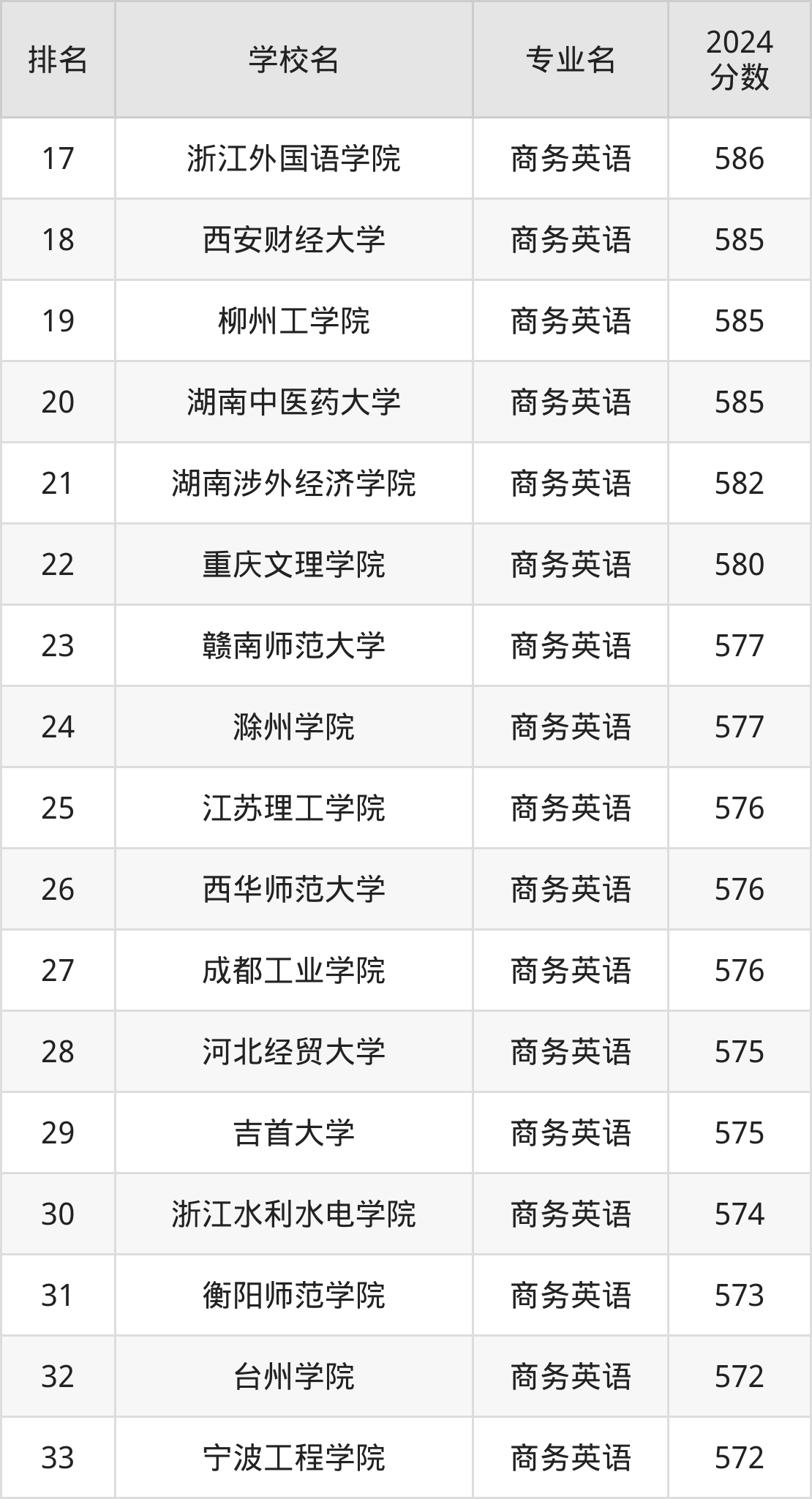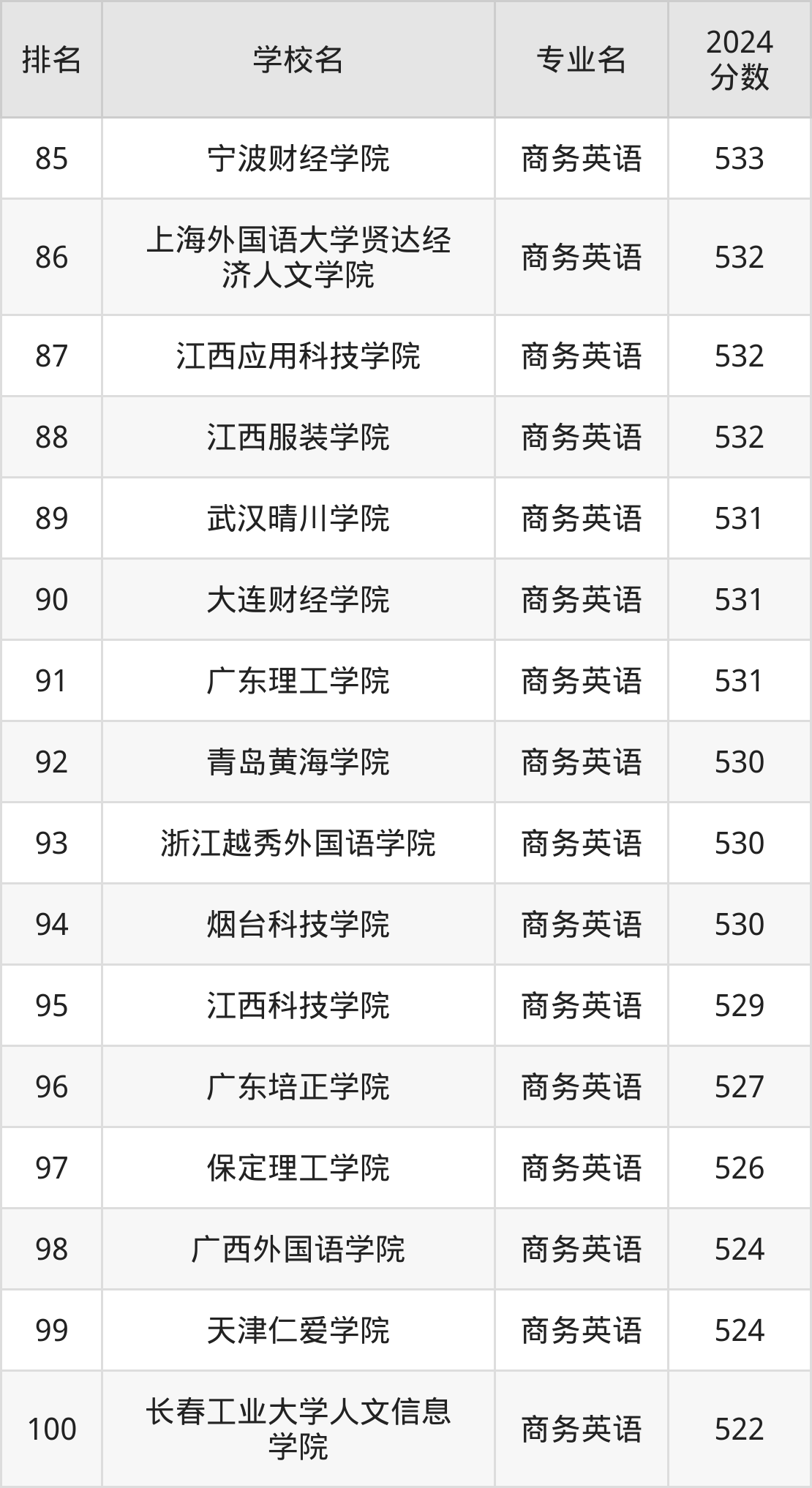 以下为全国商务英语专业在浙江省分数线排名前100的大学。