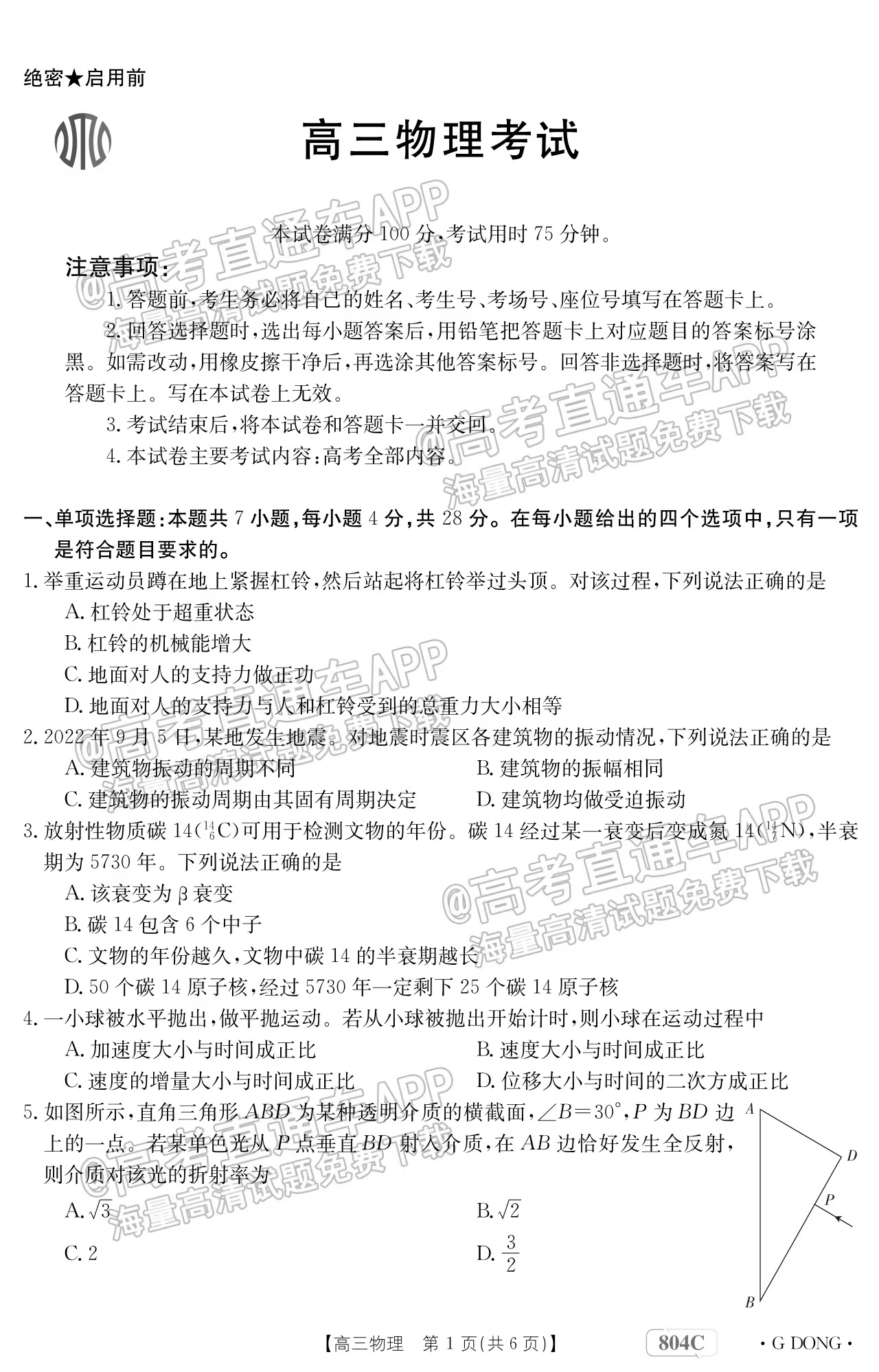 本次考试目前还未开始,等本次物理的考试结束,物理的试卷及答案公布后,小编将会在本文及时更新,同学们可以持续关注本文或高考100网站!