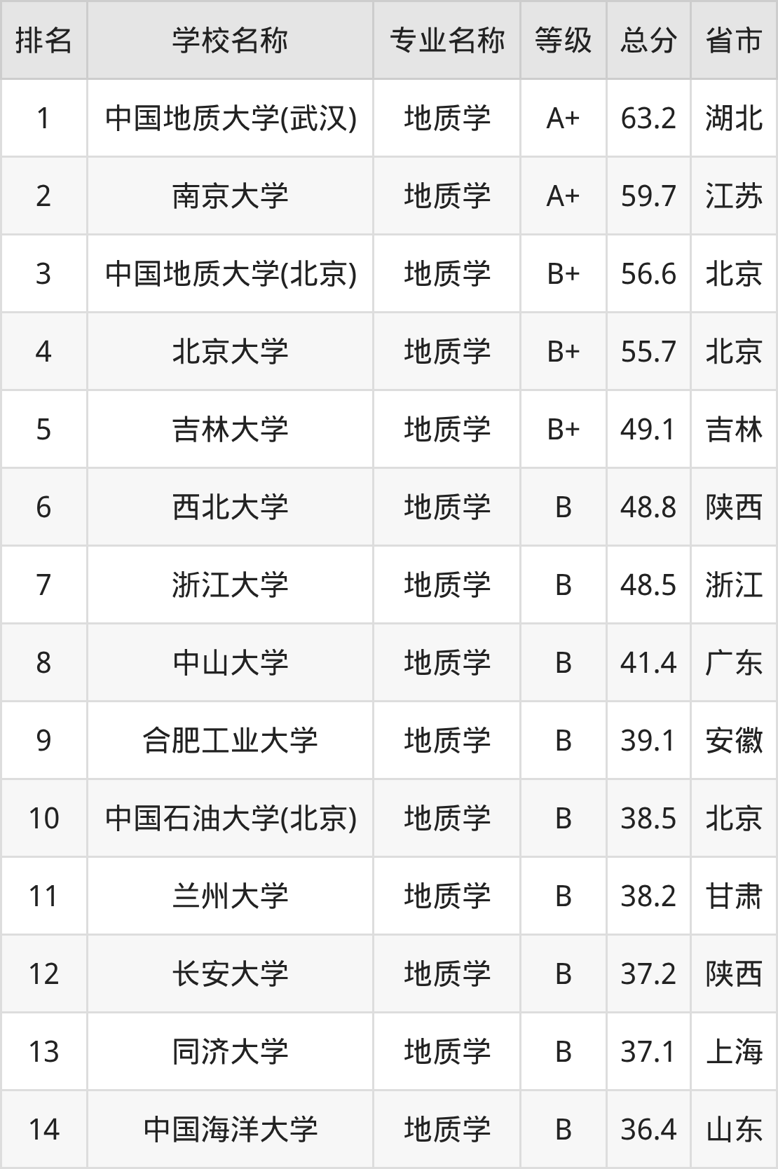 根据软科榜单可知,地质学专业全国排名前十的大学分别是: