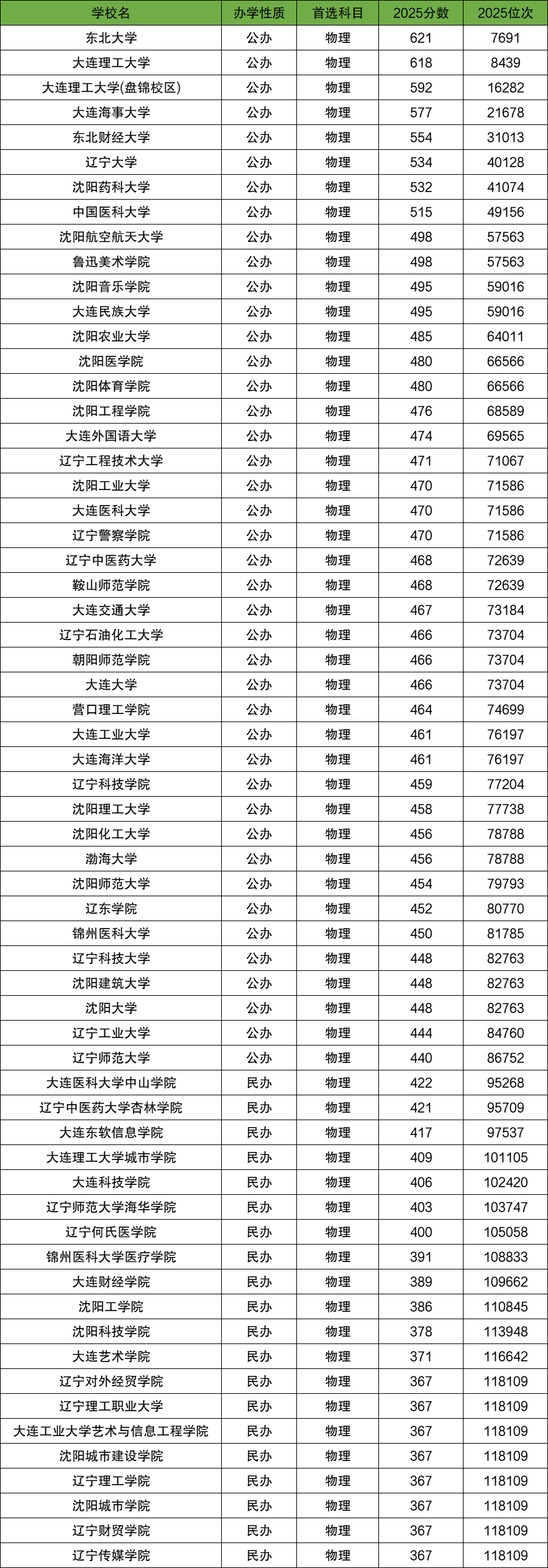 2025年辽宁本科各大学在辽宁物理类最低录取分数线位于367分-621分范围内,位次位于118109名-7691名之间。