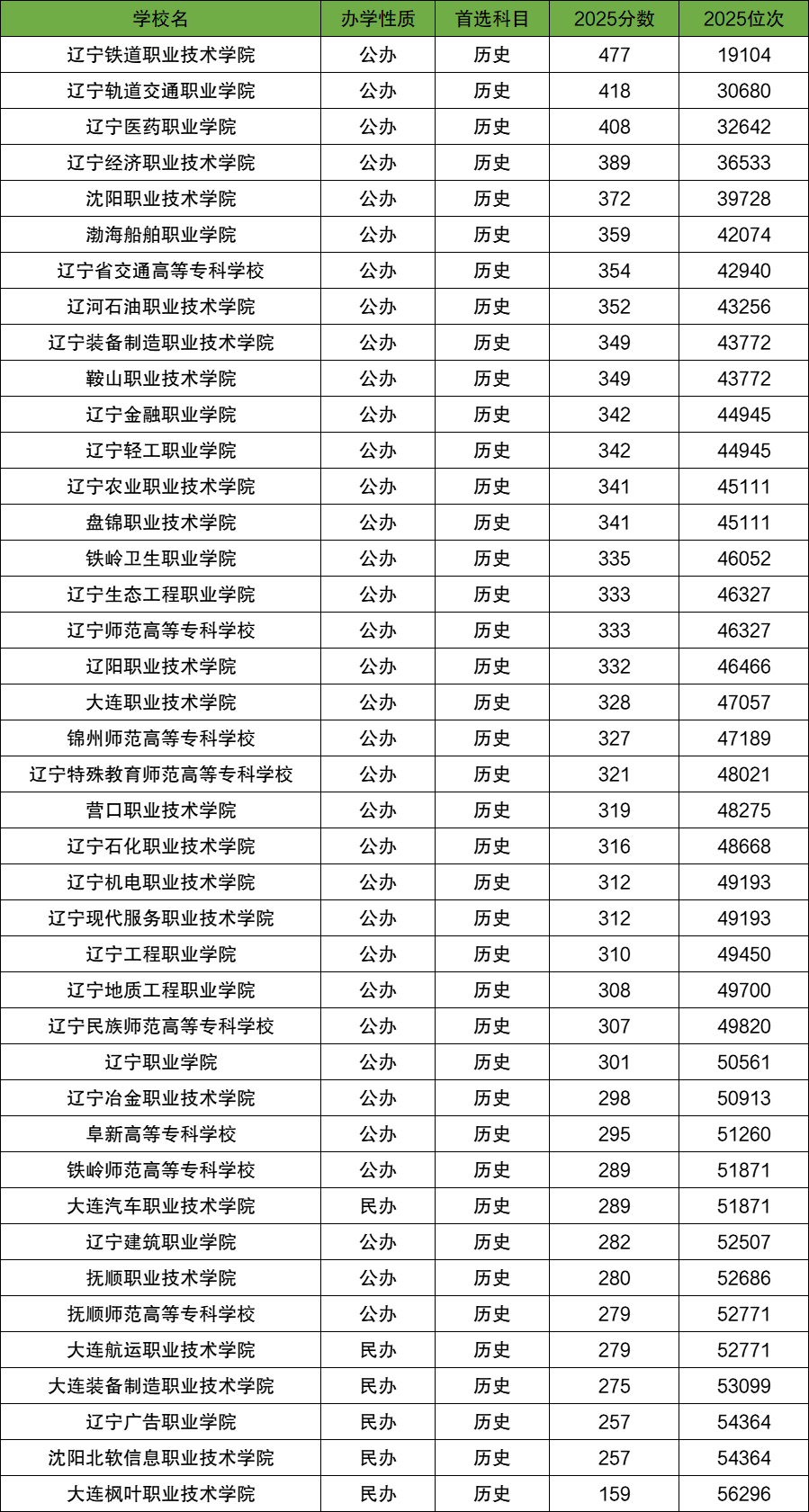 2025年辽宁专科各大学在辽宁历史类最低录取分数线位于159分-477分范围内,位次位于56296名-19104名之间。
