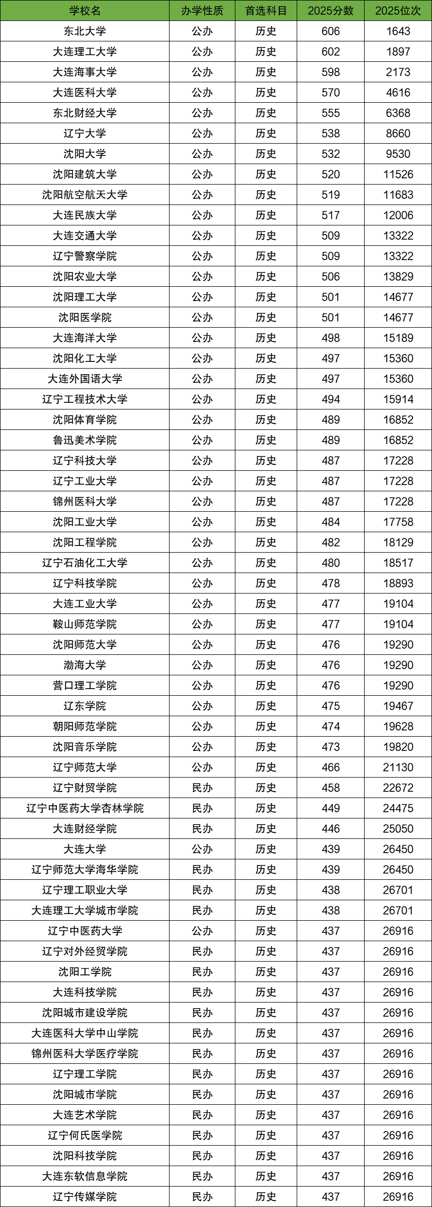 2025年辽宁本科各大学在辽宁历史类最低录取分数线位于437分-606分,位次位于26916-1643名之间。